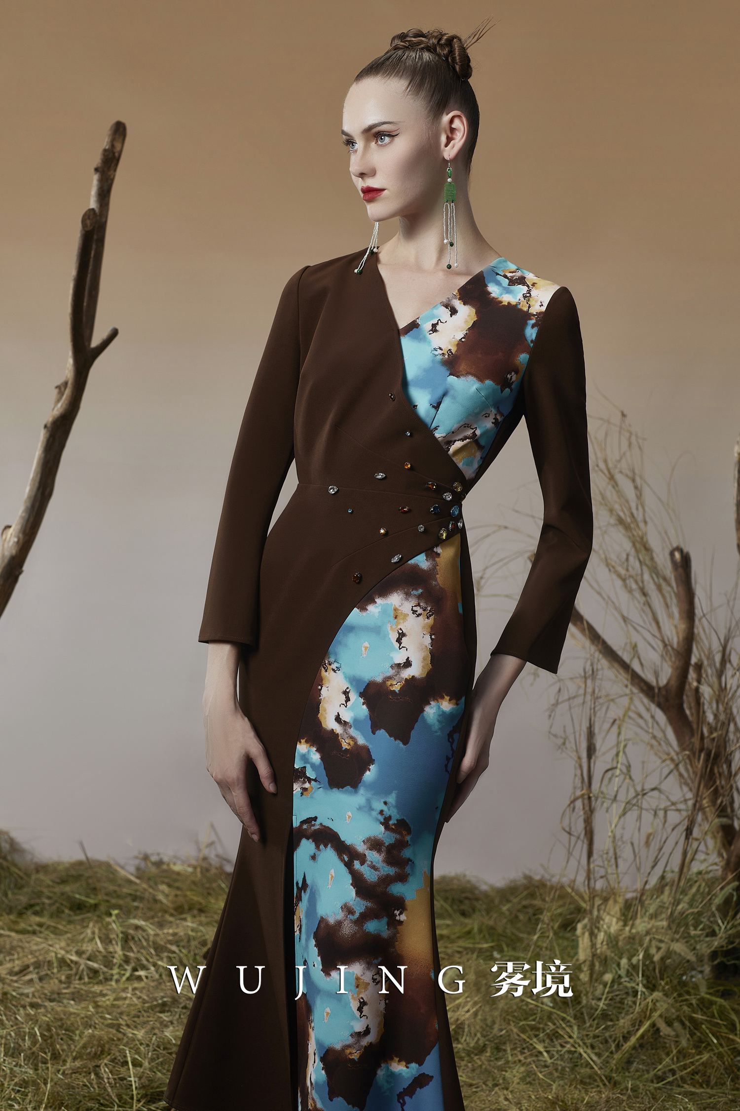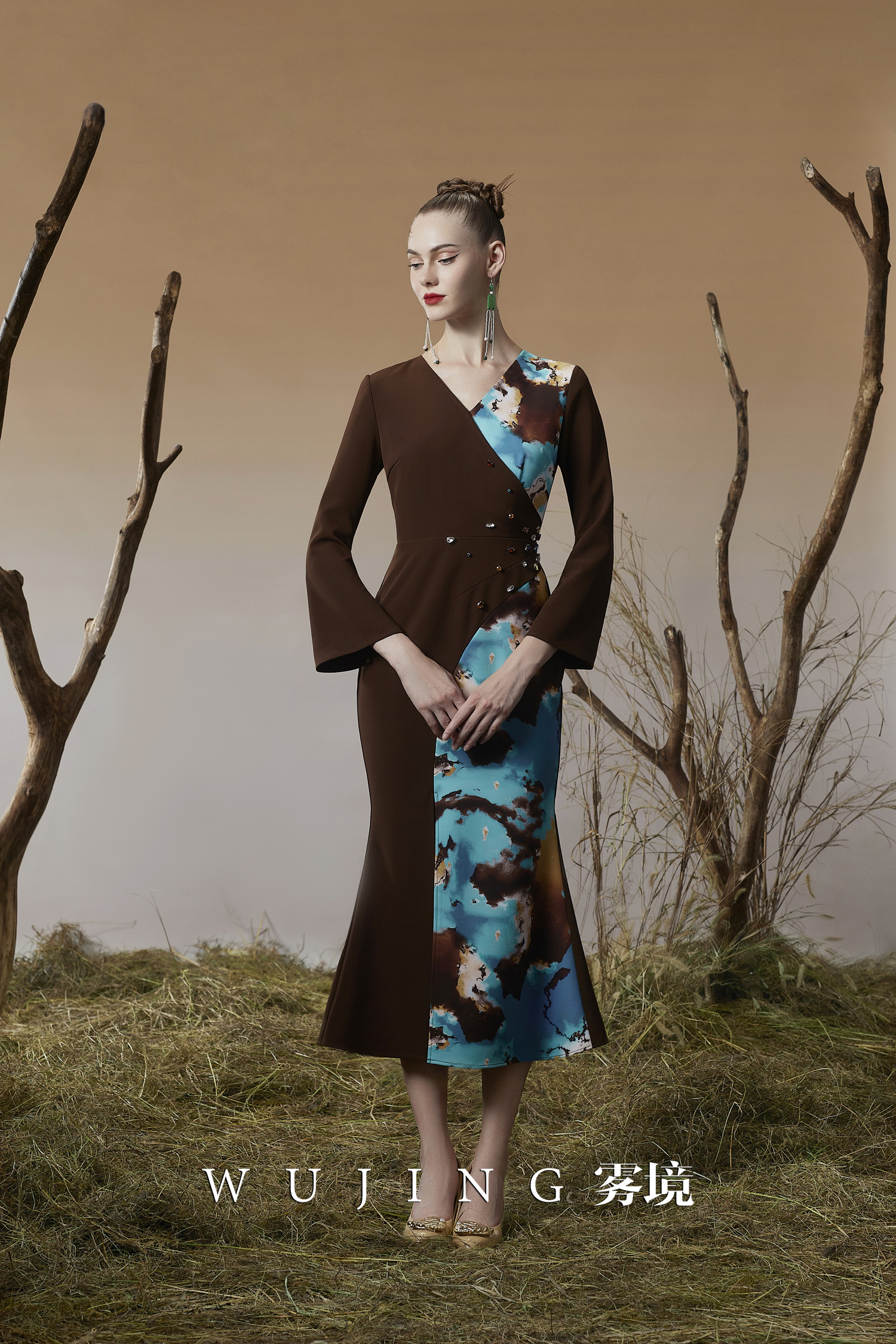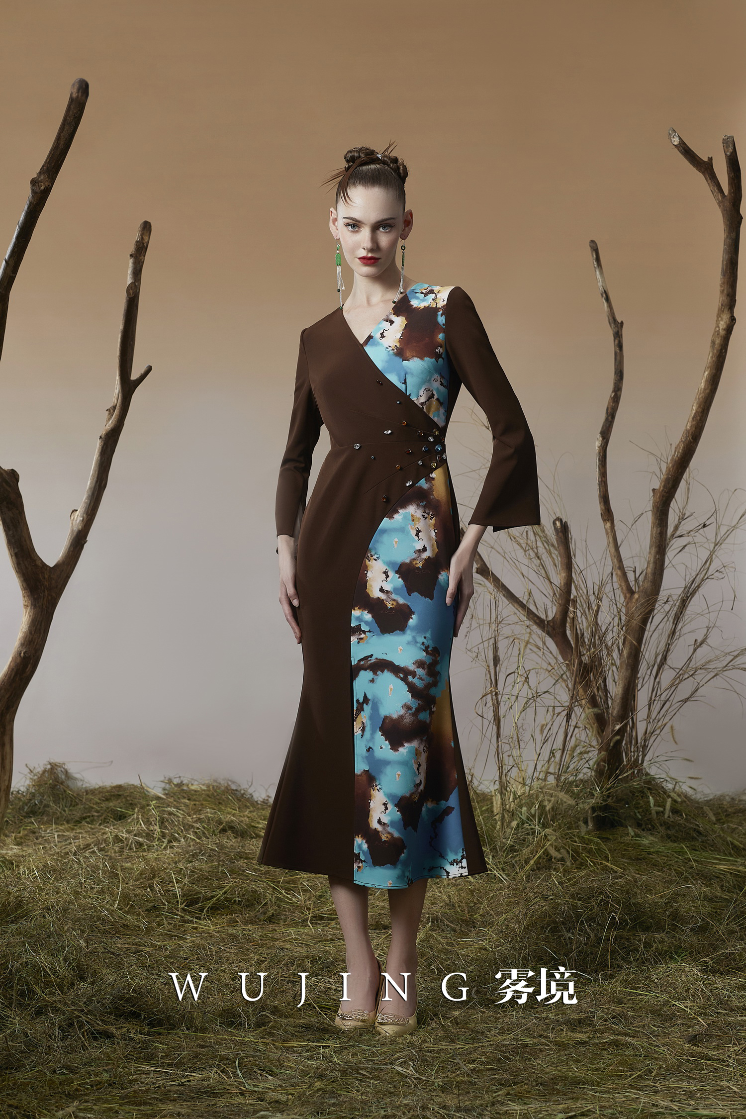 3203049 幽褐怀金 定制双层加密锦缎印花,进口凯特磨砂锦缎连衣裙 雾境