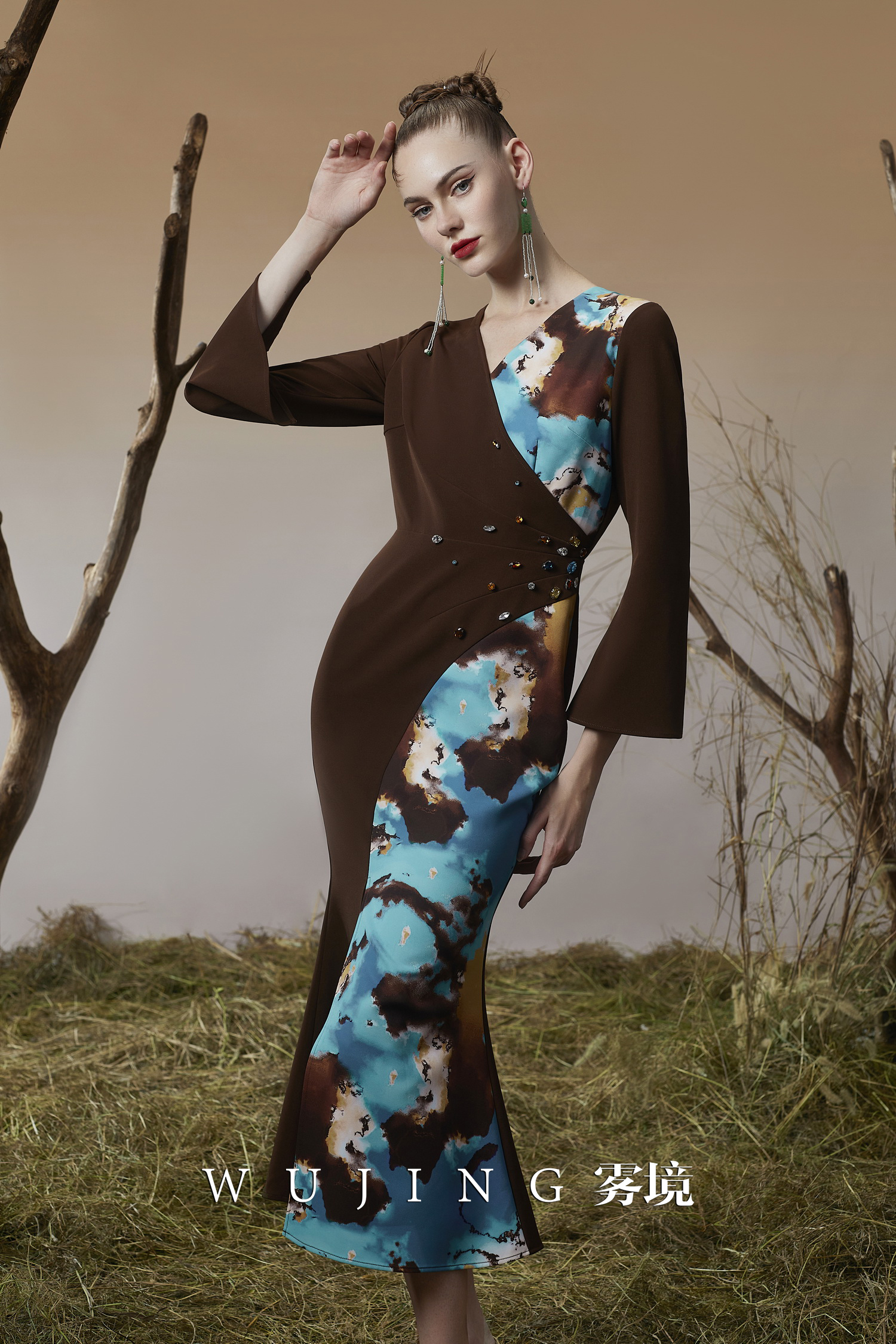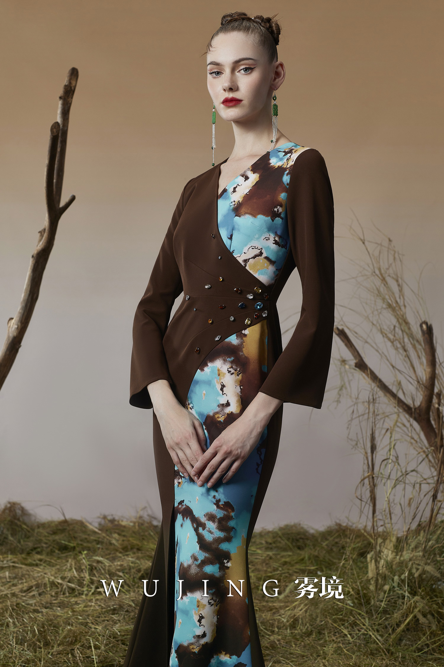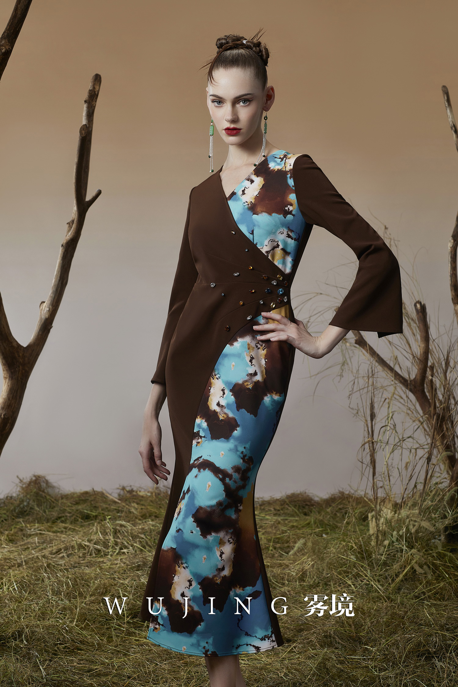 3203049 幽褐怀金 定制双层加密锦缎印花,进口凯特磨砂锦缎连衣裙 雾境