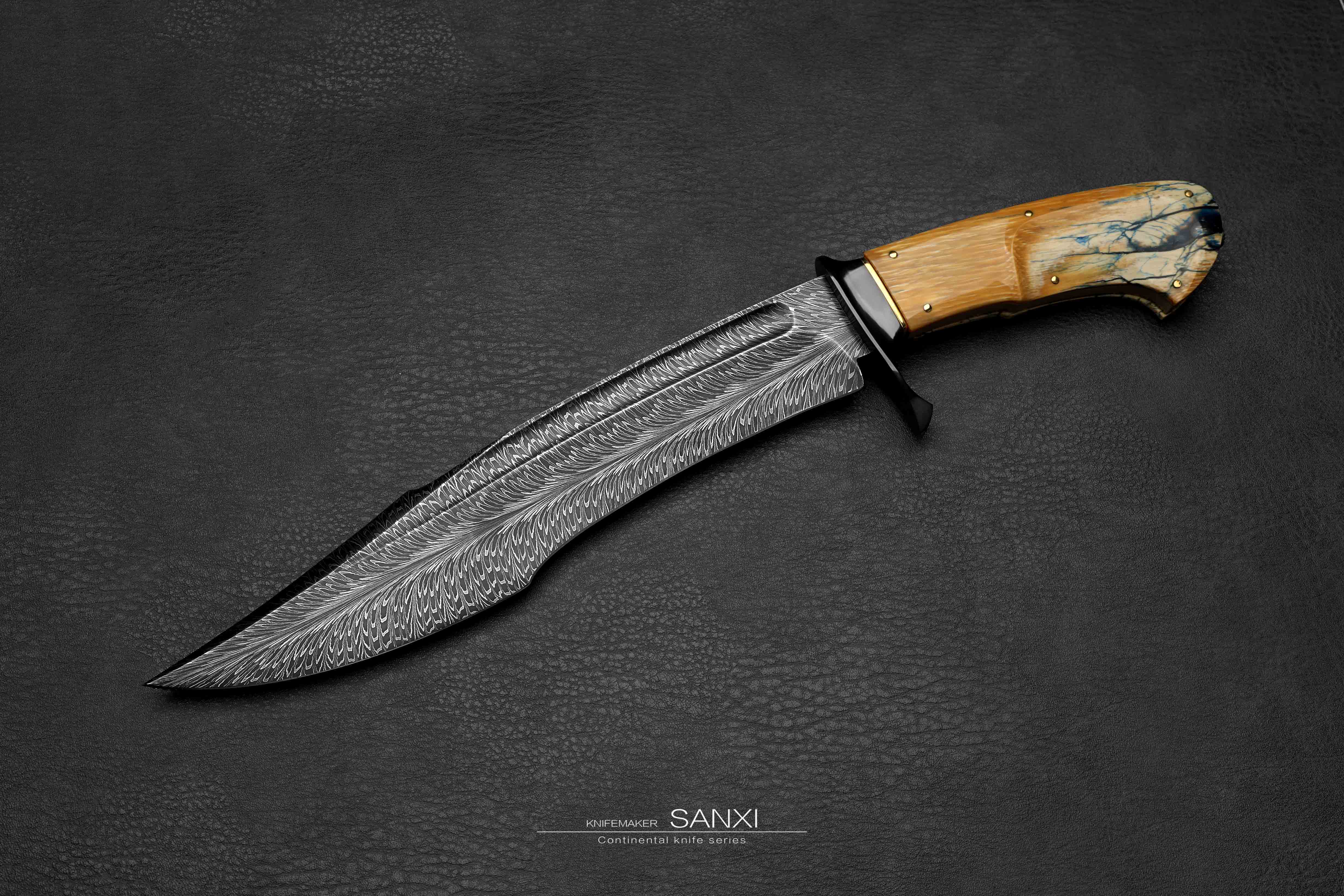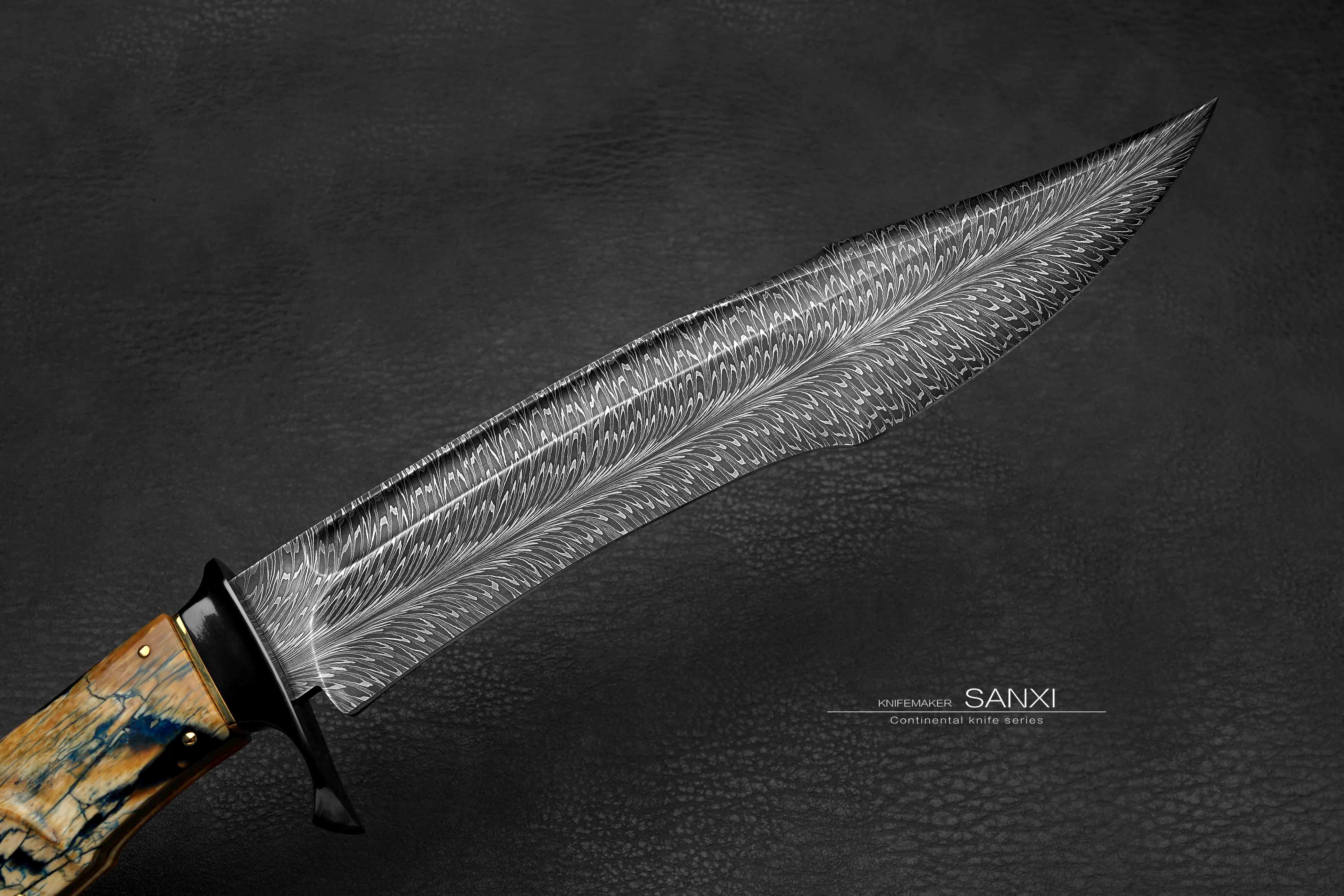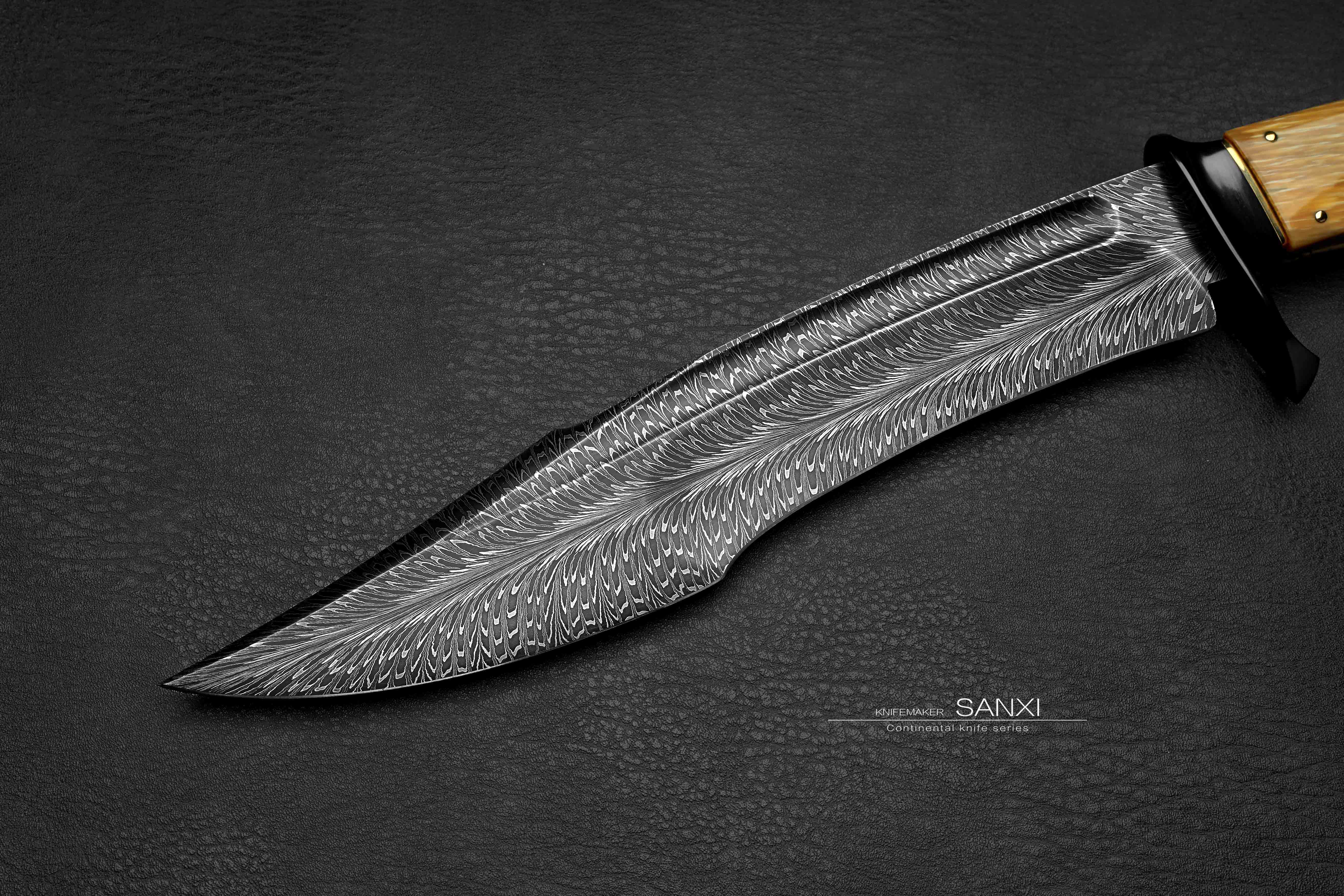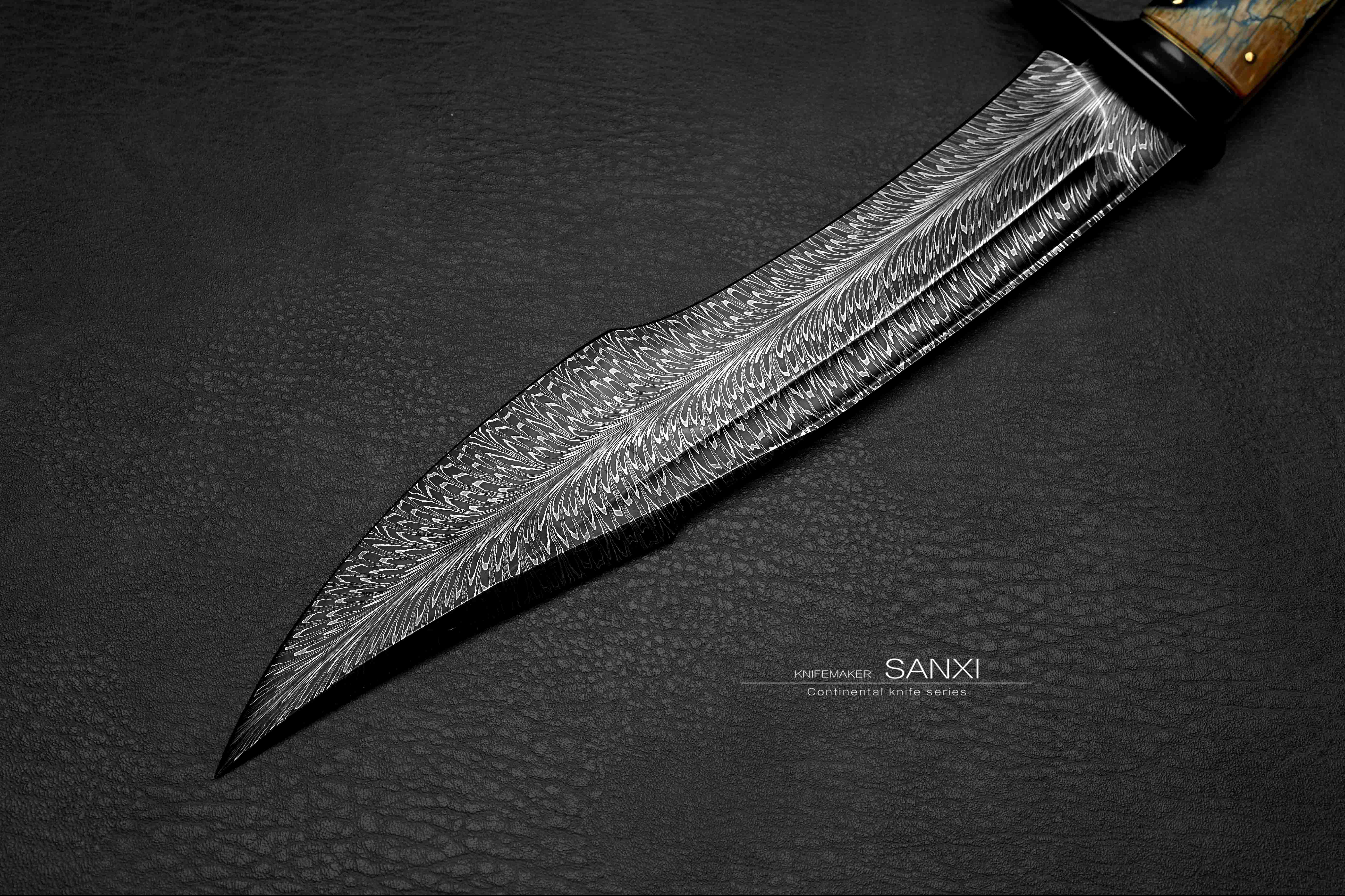 这只作品是我们老板非常喜欢的 全长30多很有意思的一只小弯刀 根据这只作品单独锻打的大马士革钢 换了更好的材料 锻打出来像水墨画一样 有点下笔后 墨水自然流下形成纹路 自然沁墨的感觉 羽毛纹路自然且生动 这只作品刃的造型比较复杂 有很多弧面很考验制作师傅的手艺 大家可以放大看下这把弯刀所有点线面之间交代的很清楚 没有一丝模糊的感觉 锆做的护手 这一点点金属就要不少钱了 很好的一块俄罗斯猛犸牙柄 润度玉度都很出色 是从一整根猛犸里面剥出来的好料子 打磨成贴合手掌的形状 黑中透蓝紫 质感十足 送个鳄鱼皮镶嵌皮鞘 各位自己收藏或者送礼都非常合适!!