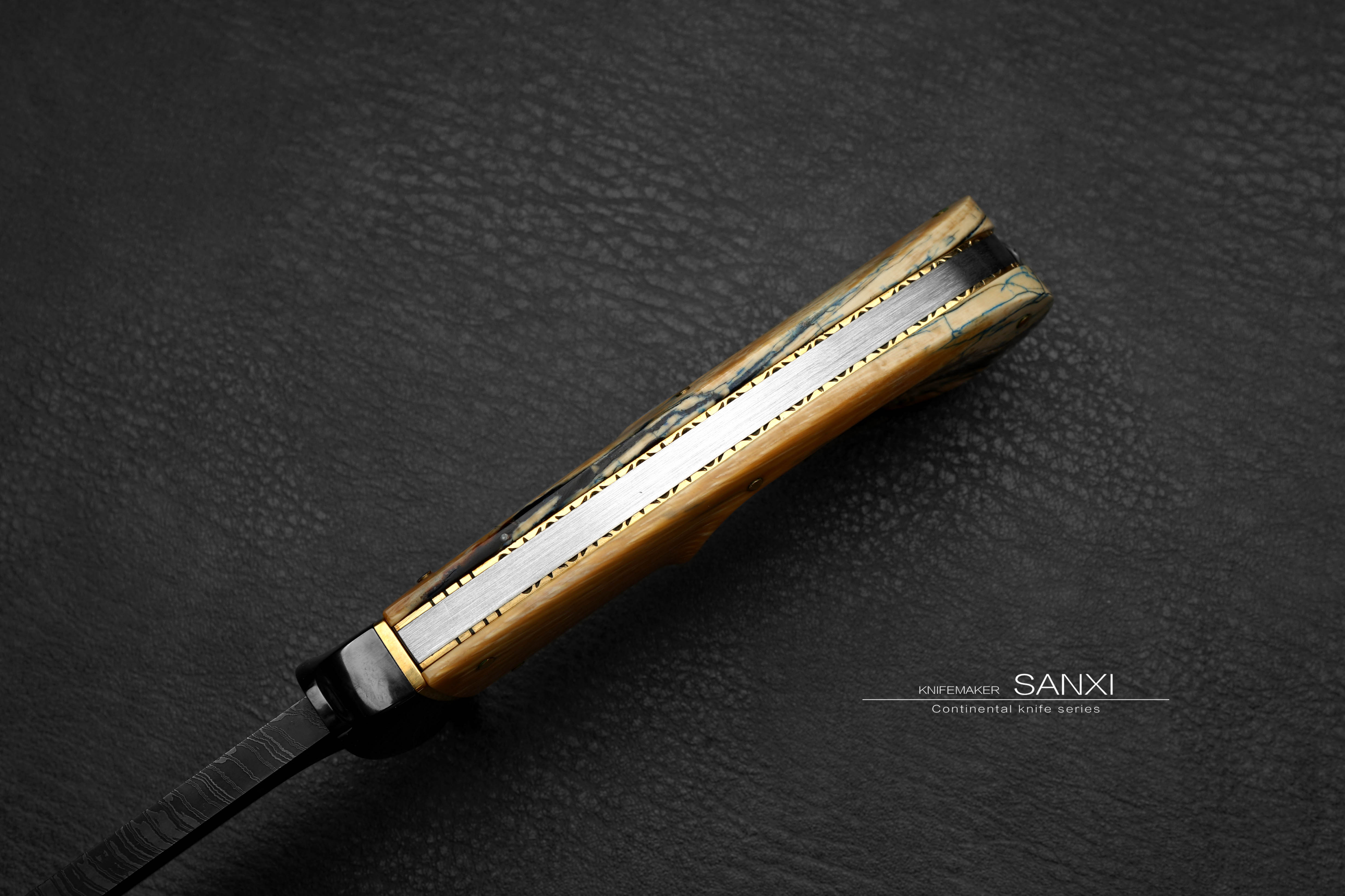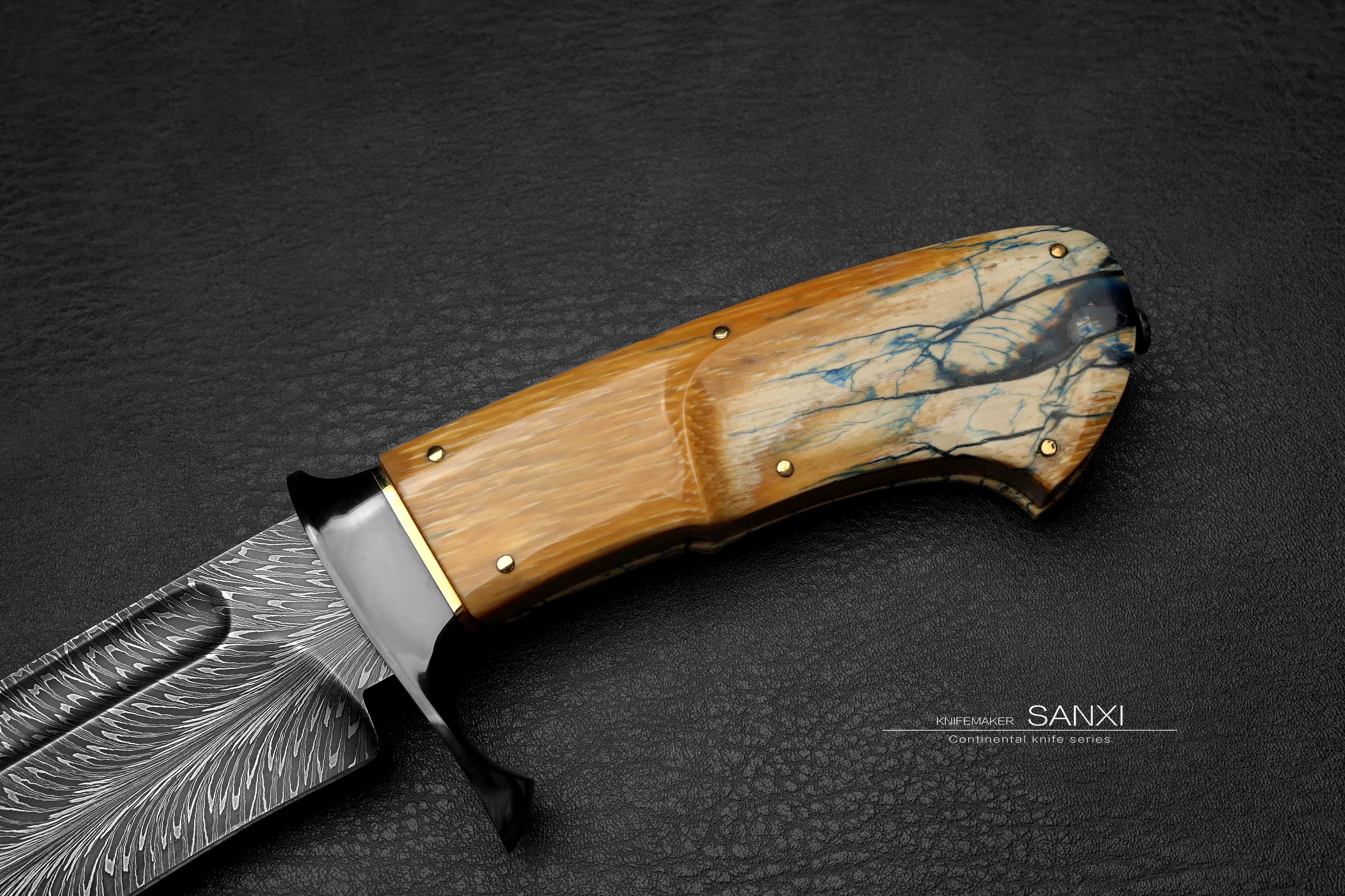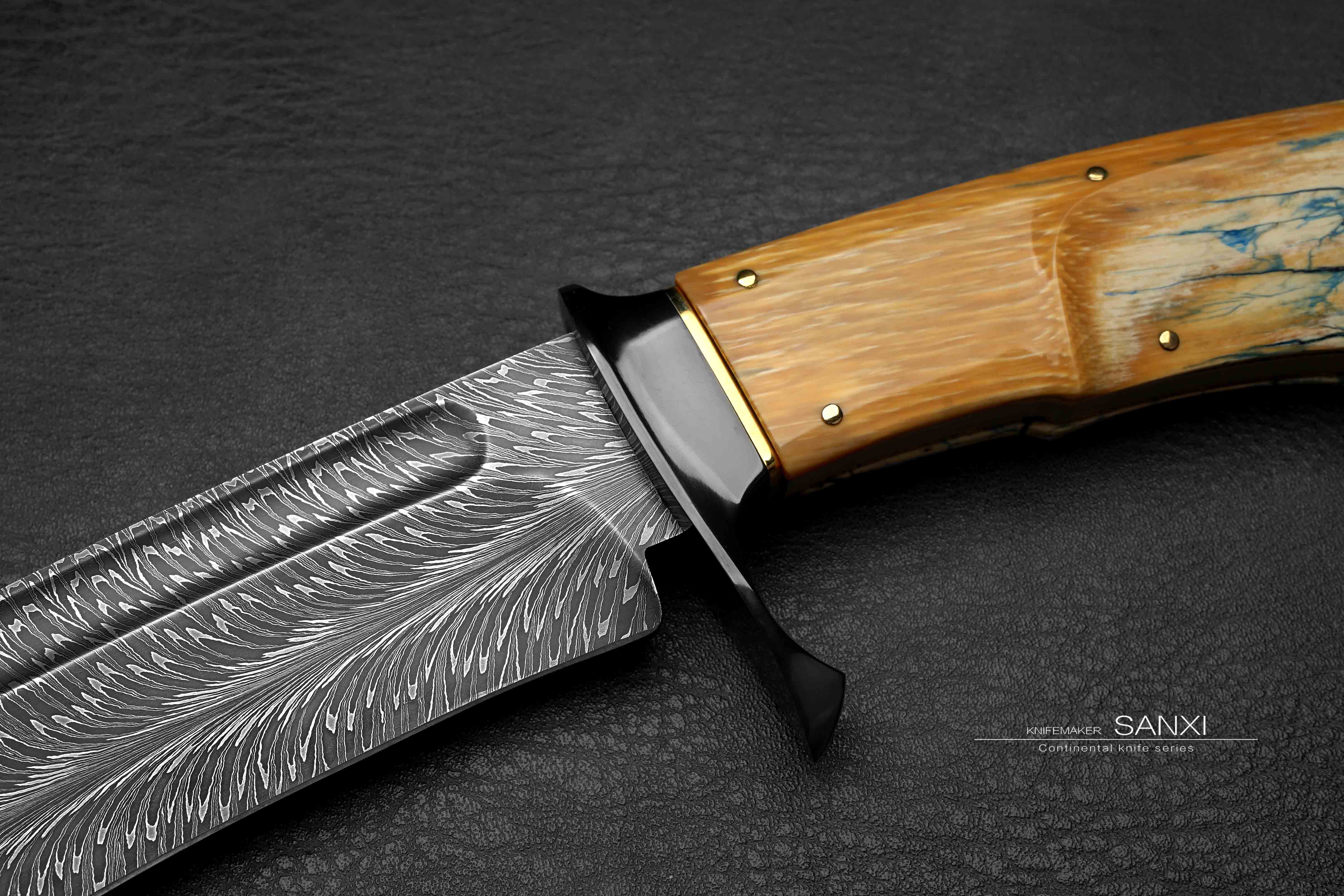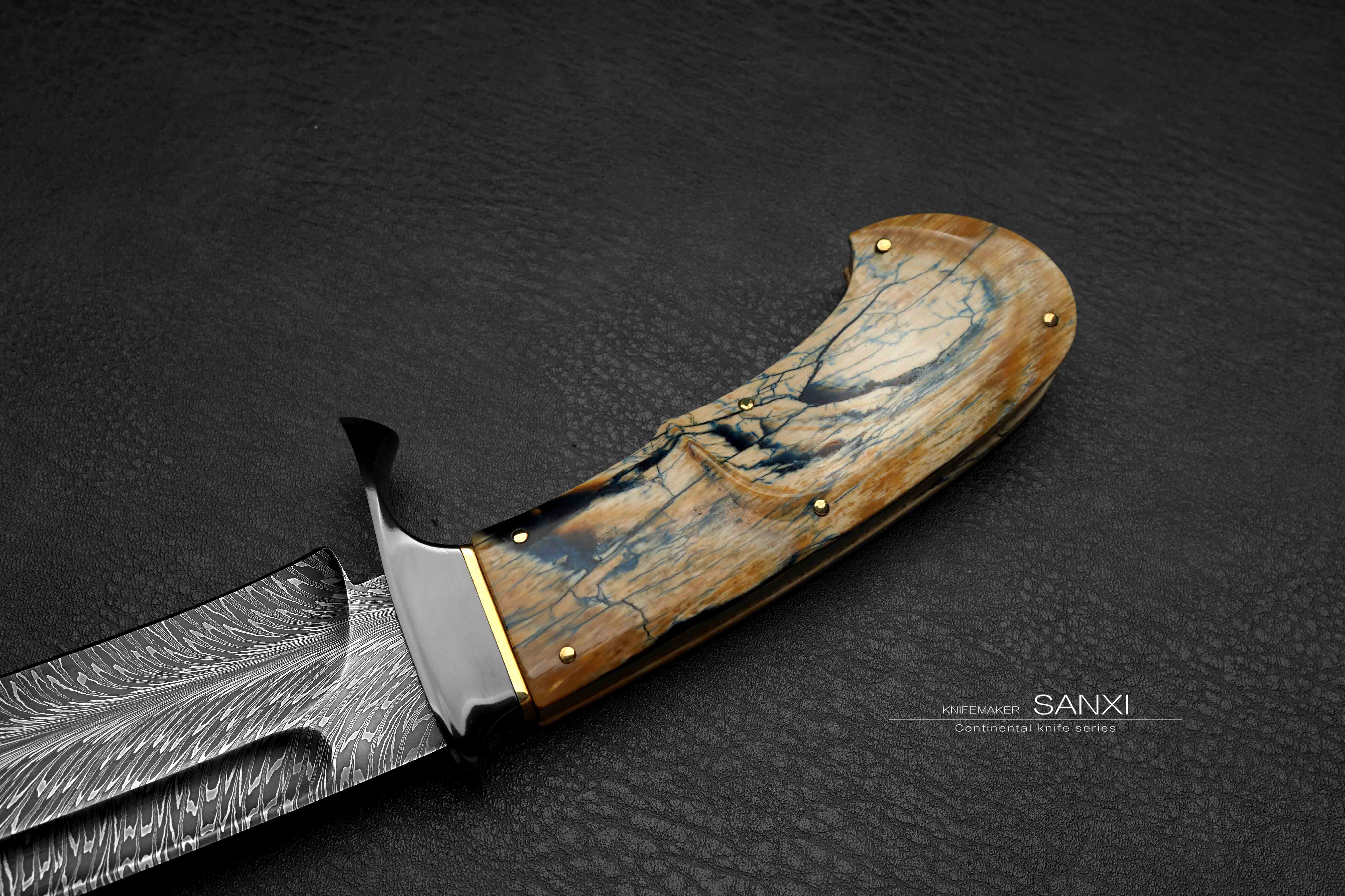 这只作品是我们老板非常喜欢的 全长30多很有意思的一只小弯刀 根据这只作品单独锻打的大马士革钢 换了更好的材料 锻打出来像水墨画一样 有点下笔后 墨水自然流下形成纹路 自然沁墨的感觉 羽毛纹路自然且生动 这只作品刃的造型比较复杂 有很多弧面很考验制作师傅的手艺 大家可以放大看下这把弯刀所有点线面之间交代的很清楚 没有一丝模糊的感觉 锆做的护手 这一点点金属就要不少钱了 很好的一块俄罗斯猛犸牙柄 润度玉度都很出色 是从一整根猛犸里面剥出来的好料子 打磨成贴合手掌的形状 黑中透蓝紫 质感十足 送个鳄鱼皮镶嵌皮鞘 各位自己收藏或者送礼都非常合适!!