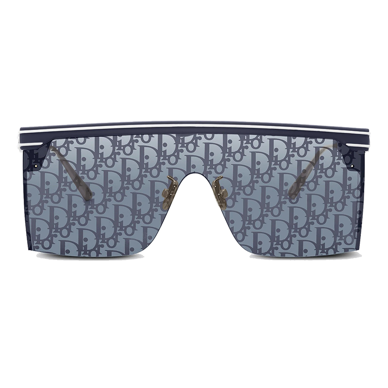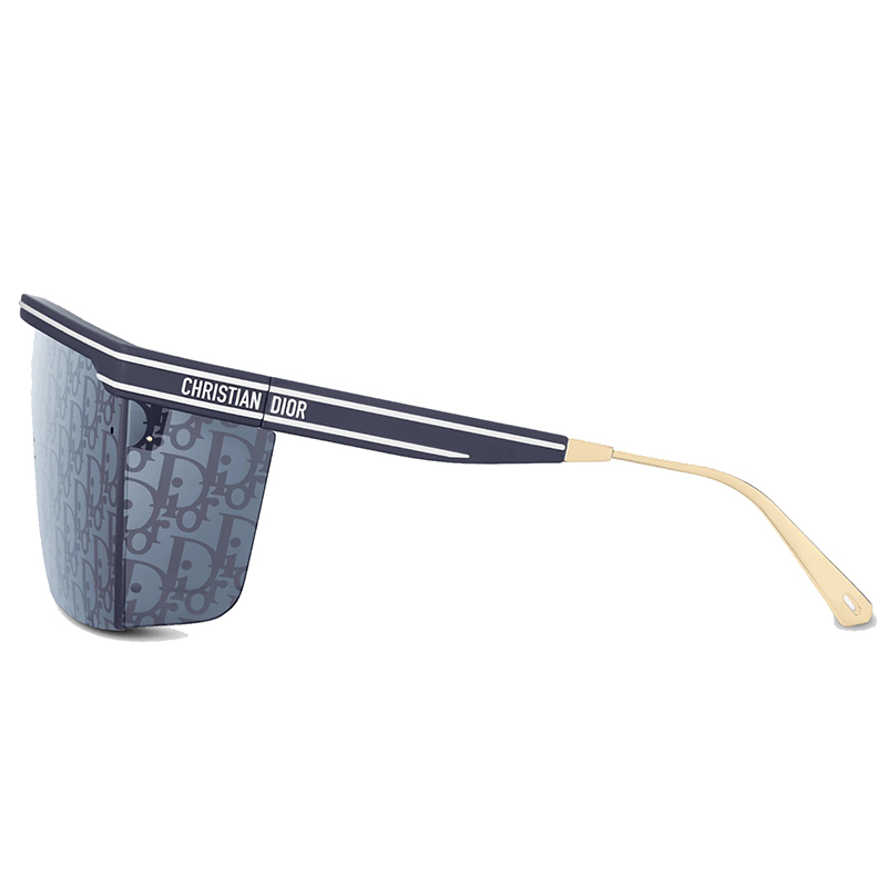DiorClub M1U太阳镜采用矩形面具形状,具有运动外观。在具有蓝色Dior斜纹图案的银色镜面镜片的连续性中,出现了大号扰流板,带来了时尚和图形感。哑光海军蓝色醋酸纤维镜架与线条细节和白色CHRISTIAN DIOR标志相搭配,具有光泽感。