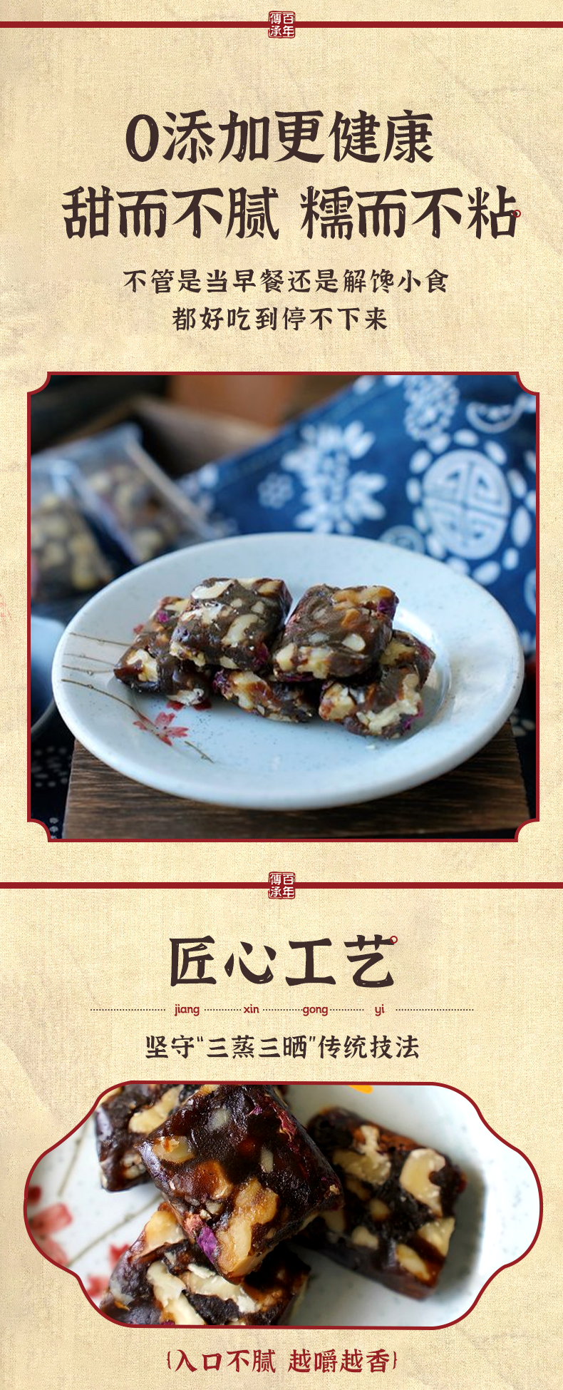 1、匠心工艺:坚守“三蒸三晒”传统技法,蒸锁香甜营养,晒去多余水分,入口不腻、越嚼越香;