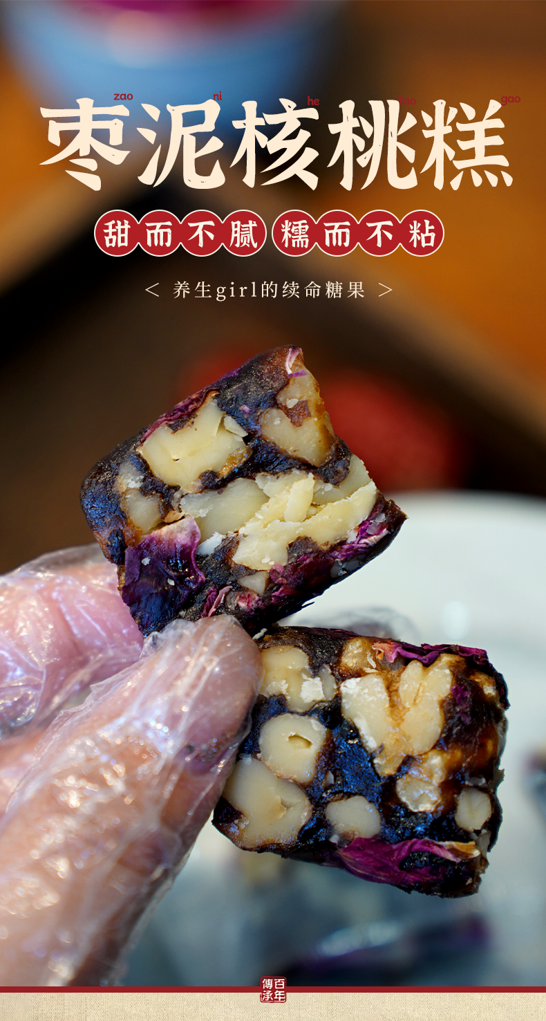 【产品配料】】核桃仁、麦芽糖浆、玫瑰花瓣,金丝枣蓉(金丝小枣、白芸豆、大豆油、麦芽糖醇)