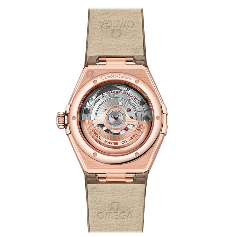 镜面材质 | 蓝宝石水晶玻璃 | 表盘 | Sedna@18k金镶钻表壳 表圈镌刻铺镶钻石,冰霜银色表盘饰有钻石小时刻度,6点位设有日历窗。指针、欧米茄品牌标识、星徽标志以及钻石托槽亦采用Sedna 18K金制成。 透底 |