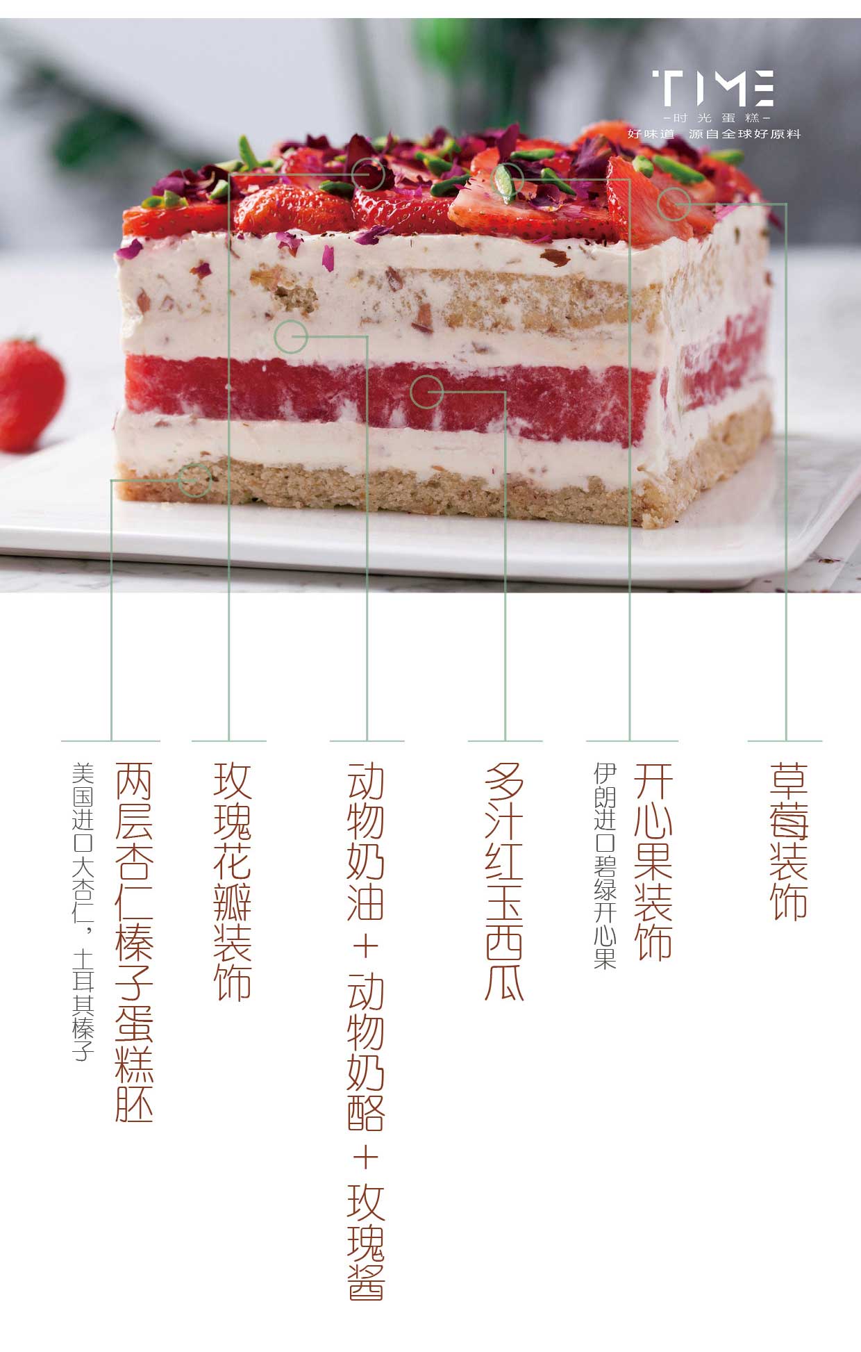 蛋糕胚是用杏仁和榛子打成粉替代面粉制作。口感偏扎实,虽成本高昂,但这样做才能和西瓜的高水分搭配。(若用常见的戚风蛋糕,虽口感软,但和西瓜接触,就像馒头泡水一样糟糕)