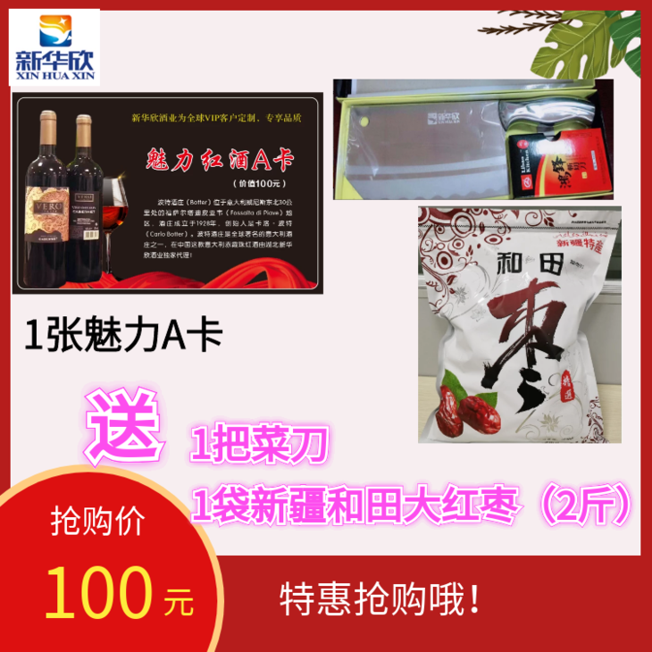 100元=1张魅力A卡+1把菜刀+1袋新疆和田大红枣(2斤)