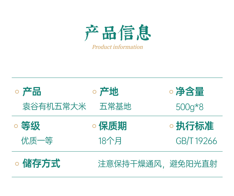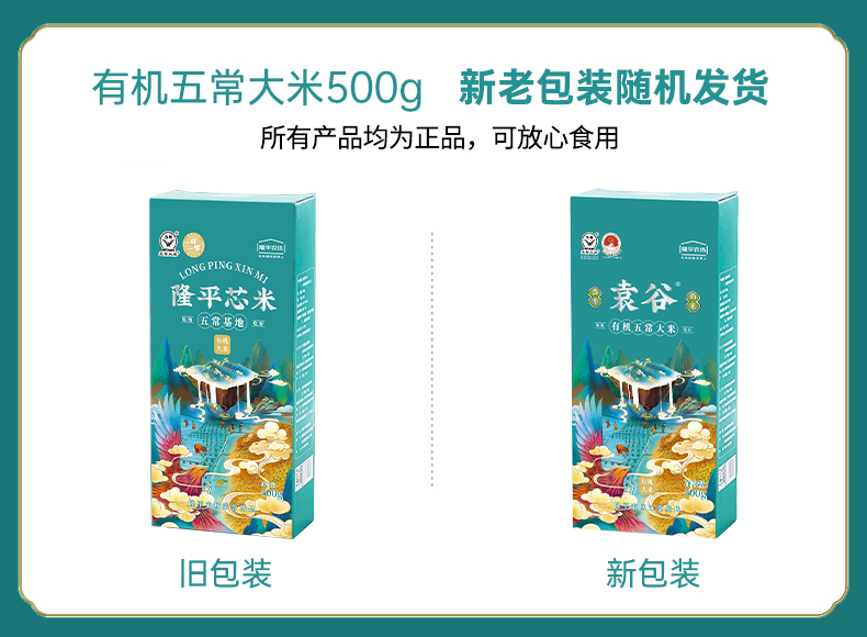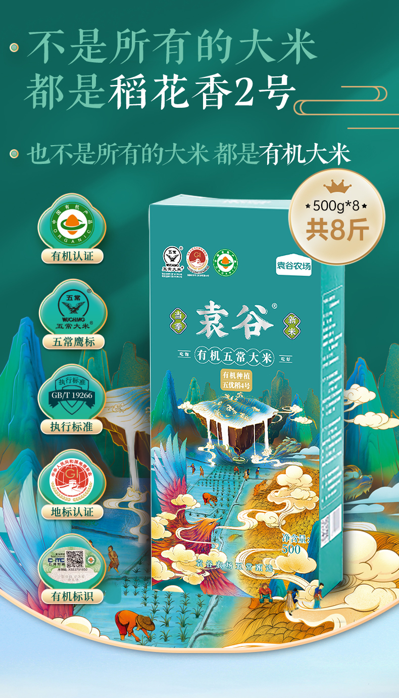 袁谷五常有机大米500g*8盒稻花香2号东北大共8斤真空小包装有机大米