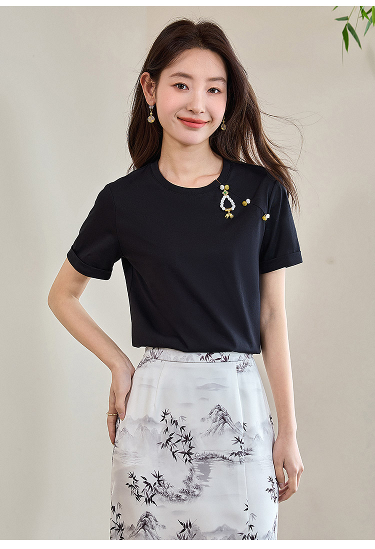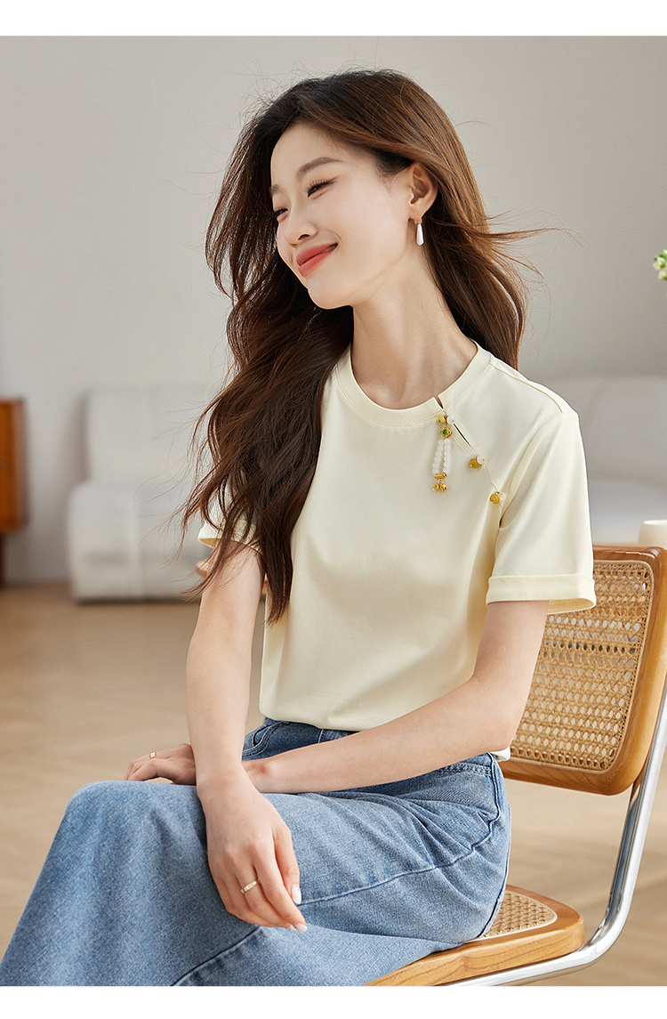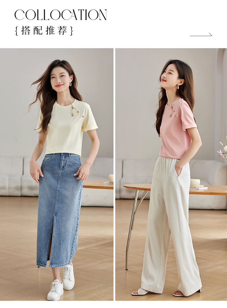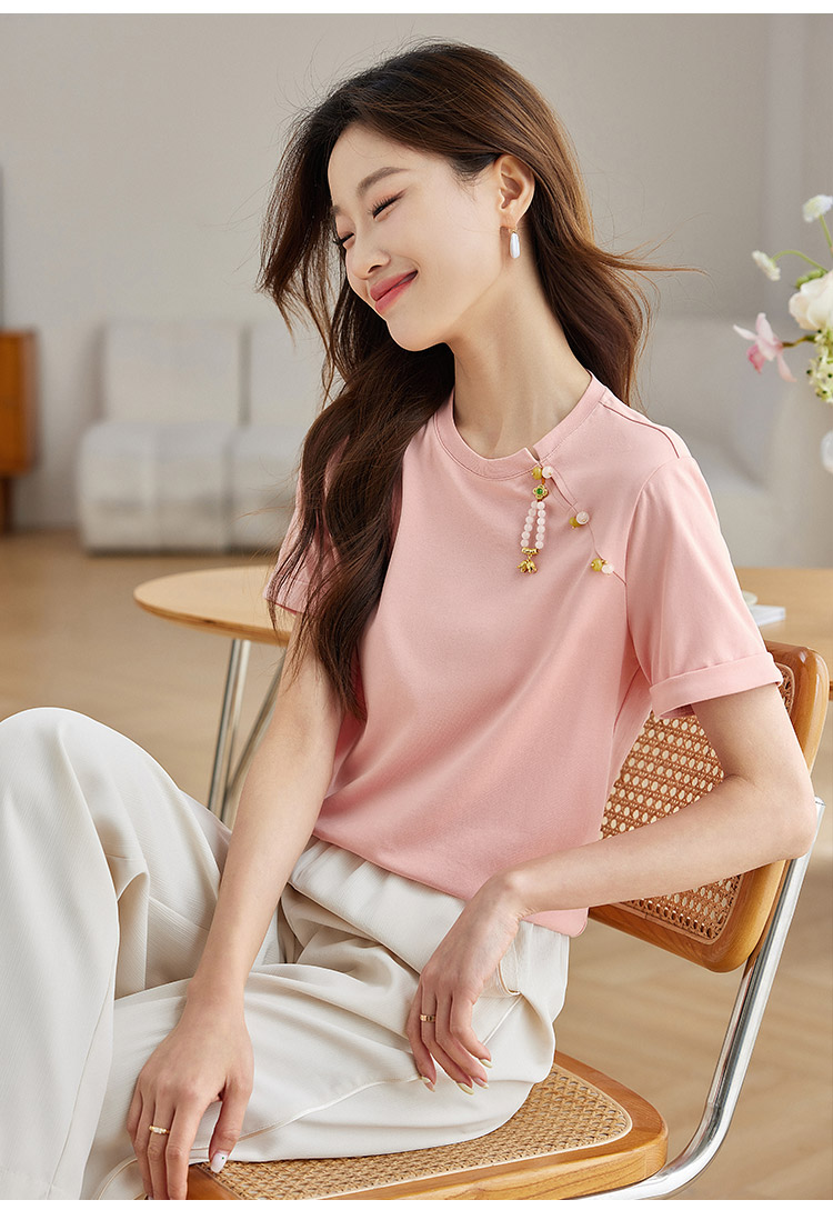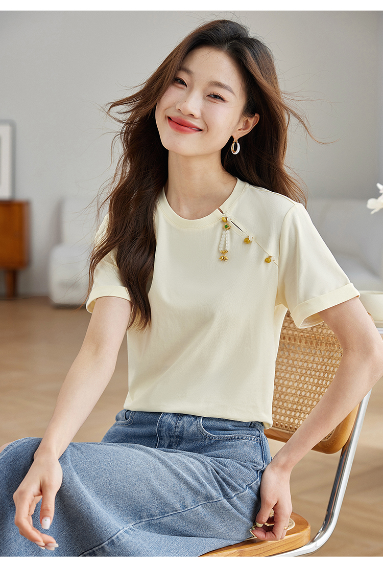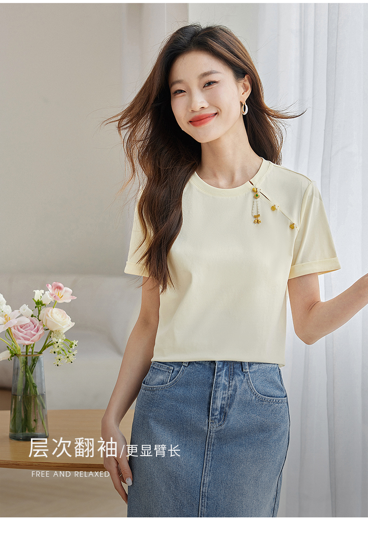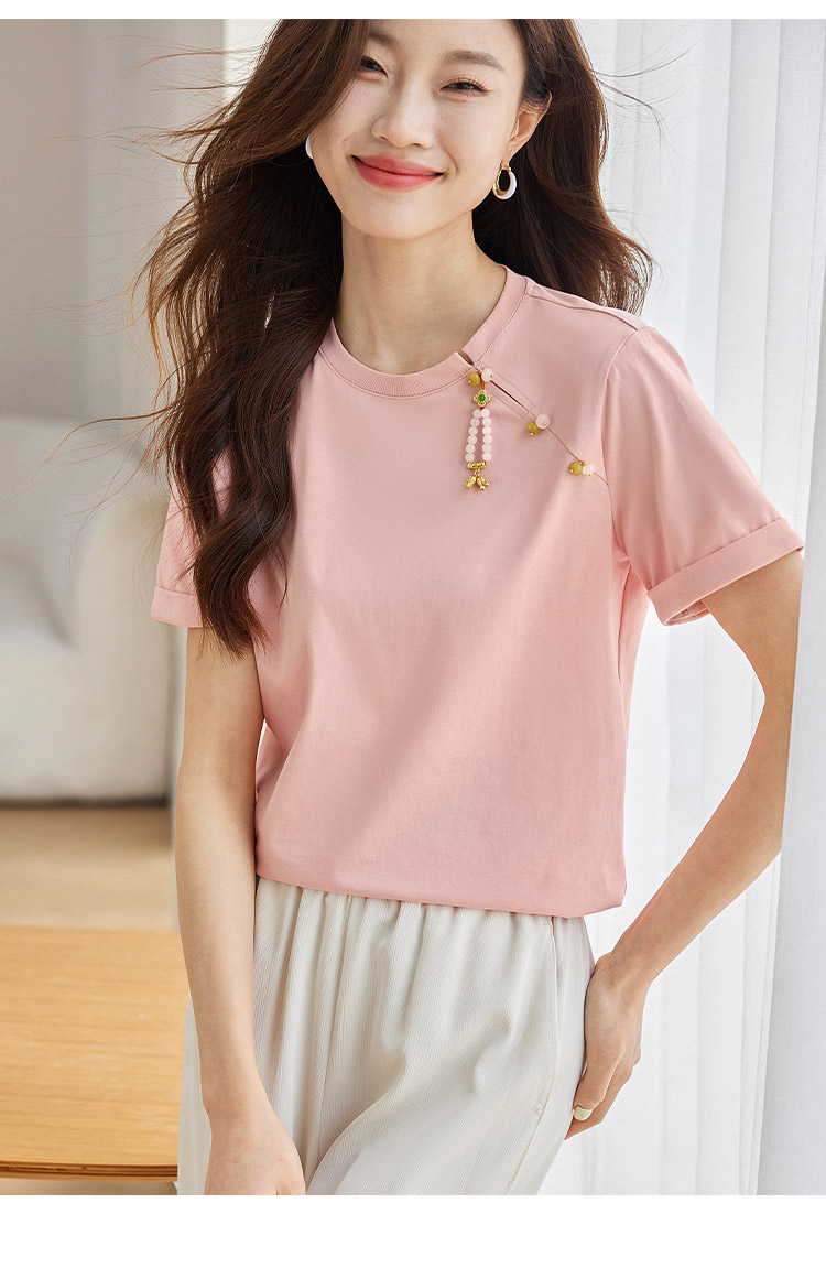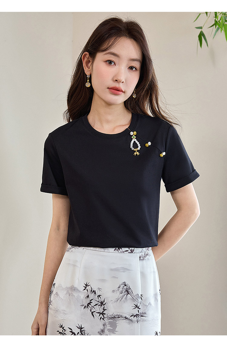 【专属特价】熙世界玉石吊坠新中式短袖T恤女2025夏新款圆领显瘦轻国风上衣