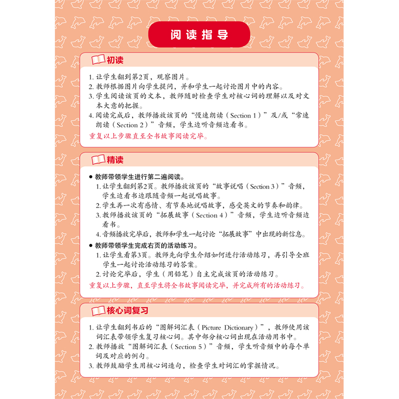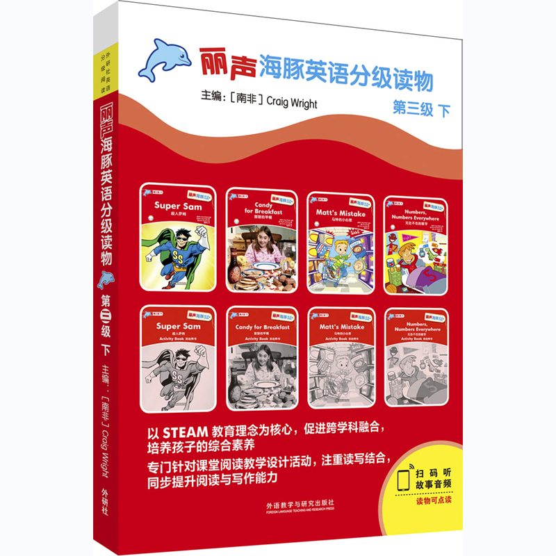 “丽声海豚英语分级读物”引进自牛津大学出版社,是一套专门为英语作为第二语言的孩子编写的分级读物。由英语阅读教学专家Craig Wright(瑞格叔叔)主编。全套图书共分5个级别,每级分上、下两个包,每个包有8册图书(4册读物+4册活动用书),可扫码听音频,适合为小学阶段的学生在课堂内开展精读教学使用。另外配有教学课件、教学设计、示范课等配套资源。读物可用“外研通”点读笔点读,所需声音文件可到www.viaton.com.cn网站免费下载。