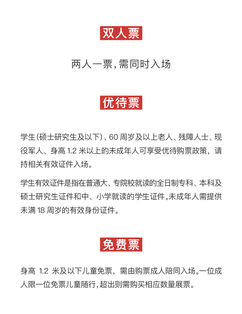 学生(硕士研究生及以下)、60 周岁及以上老人、残障人士、现役军人、身高 1.2 米以上的未成年人可享受优待购票政策,请持相关有效证件入场。