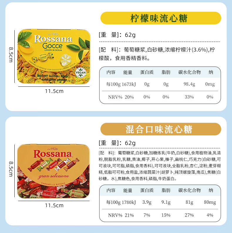 【新品上新】Rossana(迷你装)什锦坚果炼乳流心糖/混合口味流心糖/柠檬味流心糖62g/062372/062373/062374 迷你铁罐系列