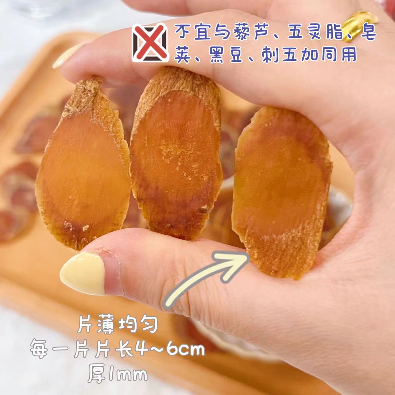 我们的红参片用的是5~6年参,片薄均匀,每一片片长4~6cm,厚1mm
