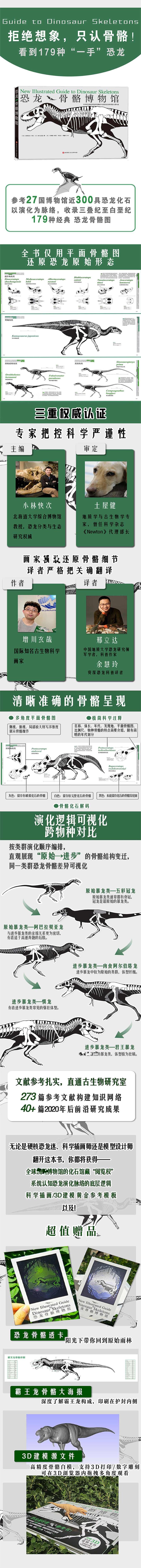 本书以恐龙品种的演化顺序为线索, 本作以各大博物馆、收藏家手中的模式标本以及知名标本为参照, 准确地绘制了179种经典恐龙的平面骨骼图, 并辅以简洁且细节化的说明文字。通过作品中的骨骼图, 读者可以看到同一物种不同时期骨骼的成长变化、同一类别下不同物种的骨骼差别, 同一类别不同时代的骨骼进化差异等等其他恐龙作品中无法横贯式了解到的内容。通过骨骼这一最真实的素材, 使读者通过骨骼看到恐龙最真实的模样, 对恐龙演化过程有更加直观的理解。