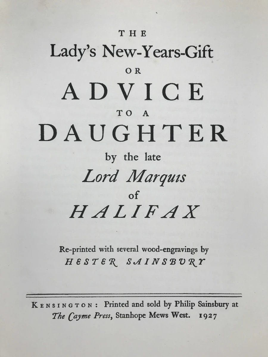 限量350册 1927年 哈利法克斯侯爵《淑女的新年礼物(给女儿的箴言)》 塞恩斯伯里木版画插图 布面精装大16开