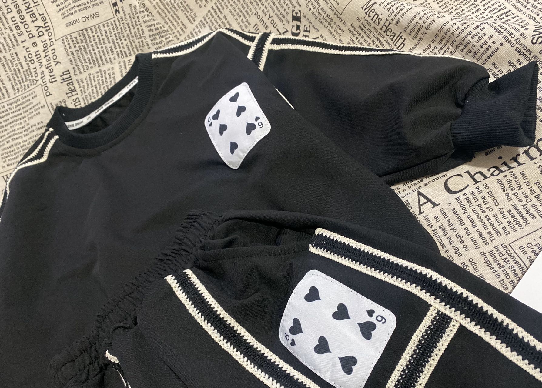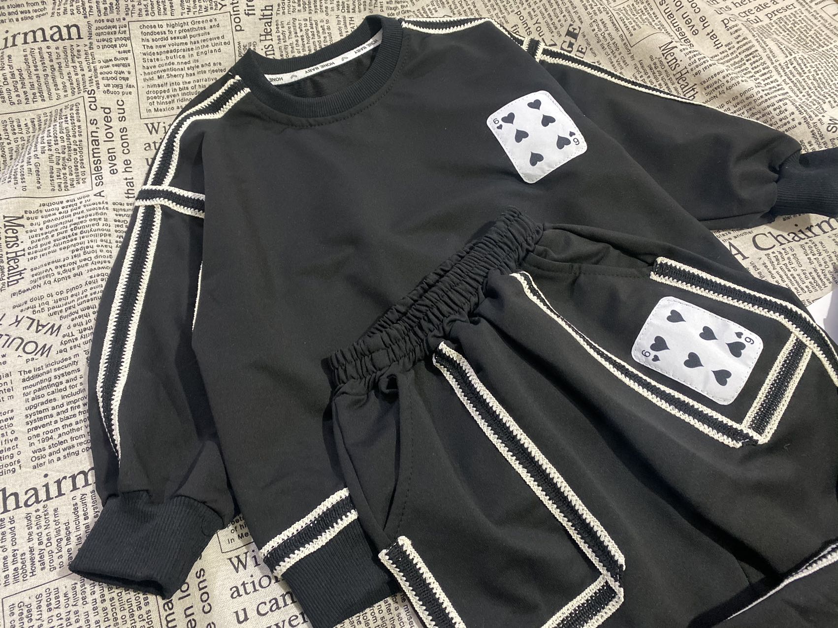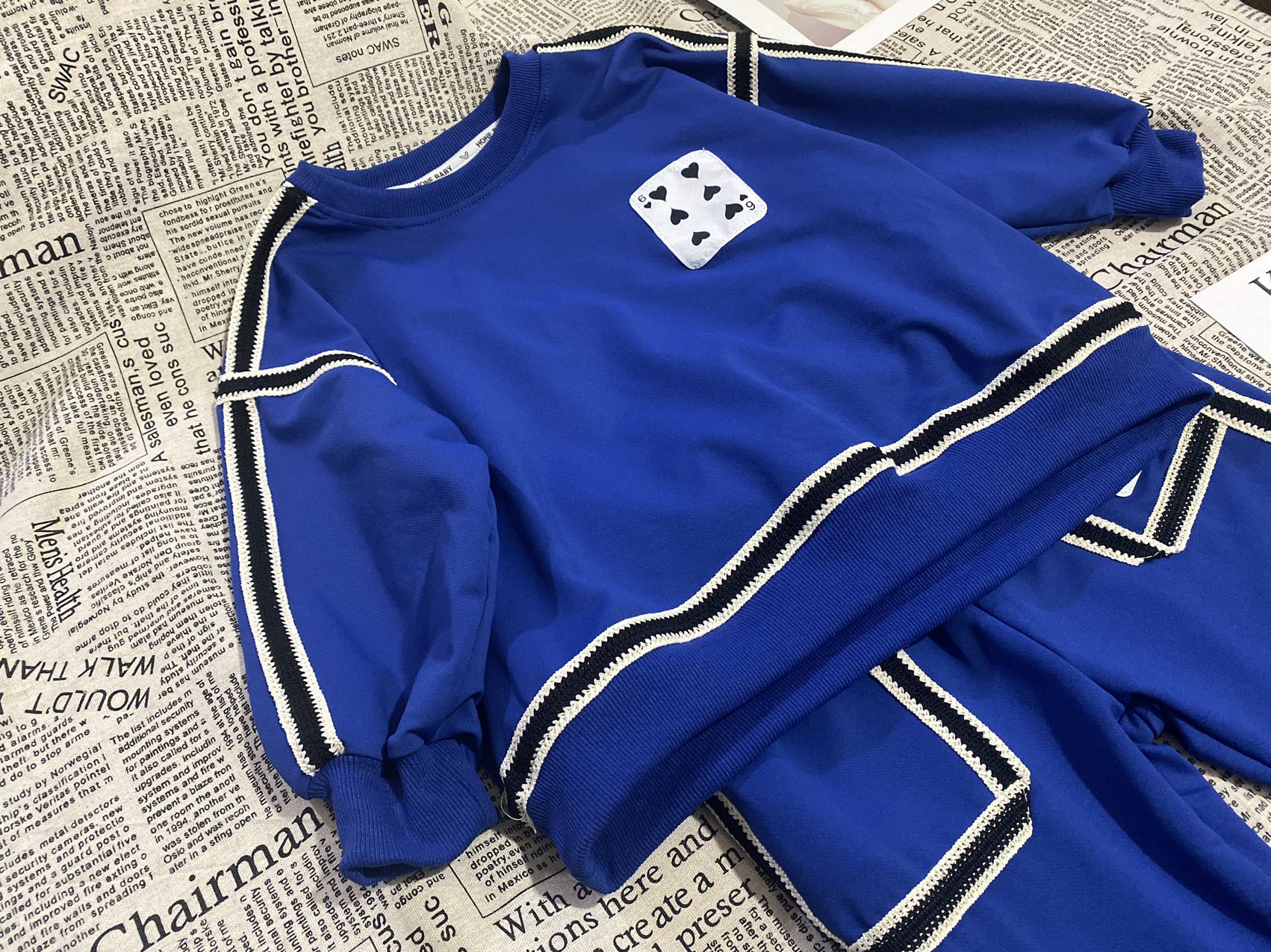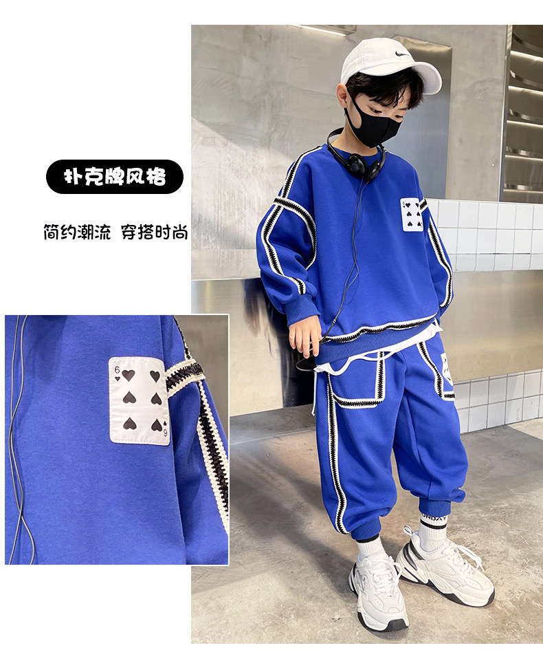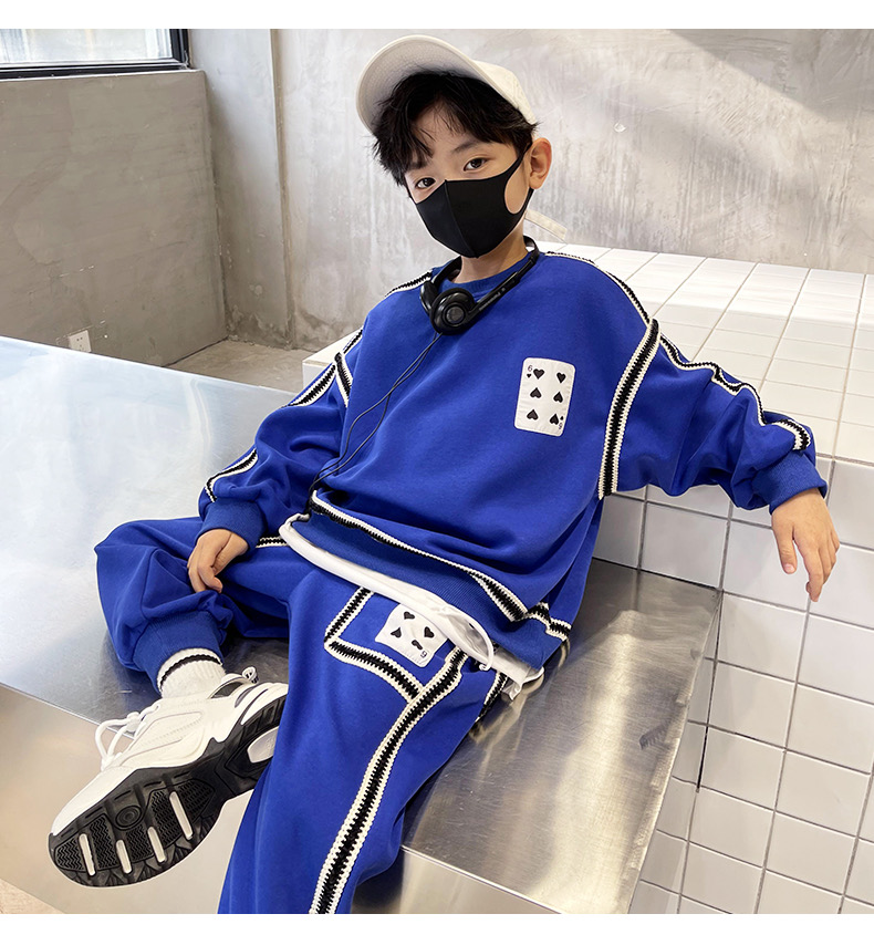 2、上衣和裤子扑克牌贴标非常吸睛,回头率高!亚迪卡棉柔软又保暖的针织面料,既有棉的吸湿透气性,又有涤纶的高耐穿性,手感亲肤爽滑,孩子穿得更舒适!