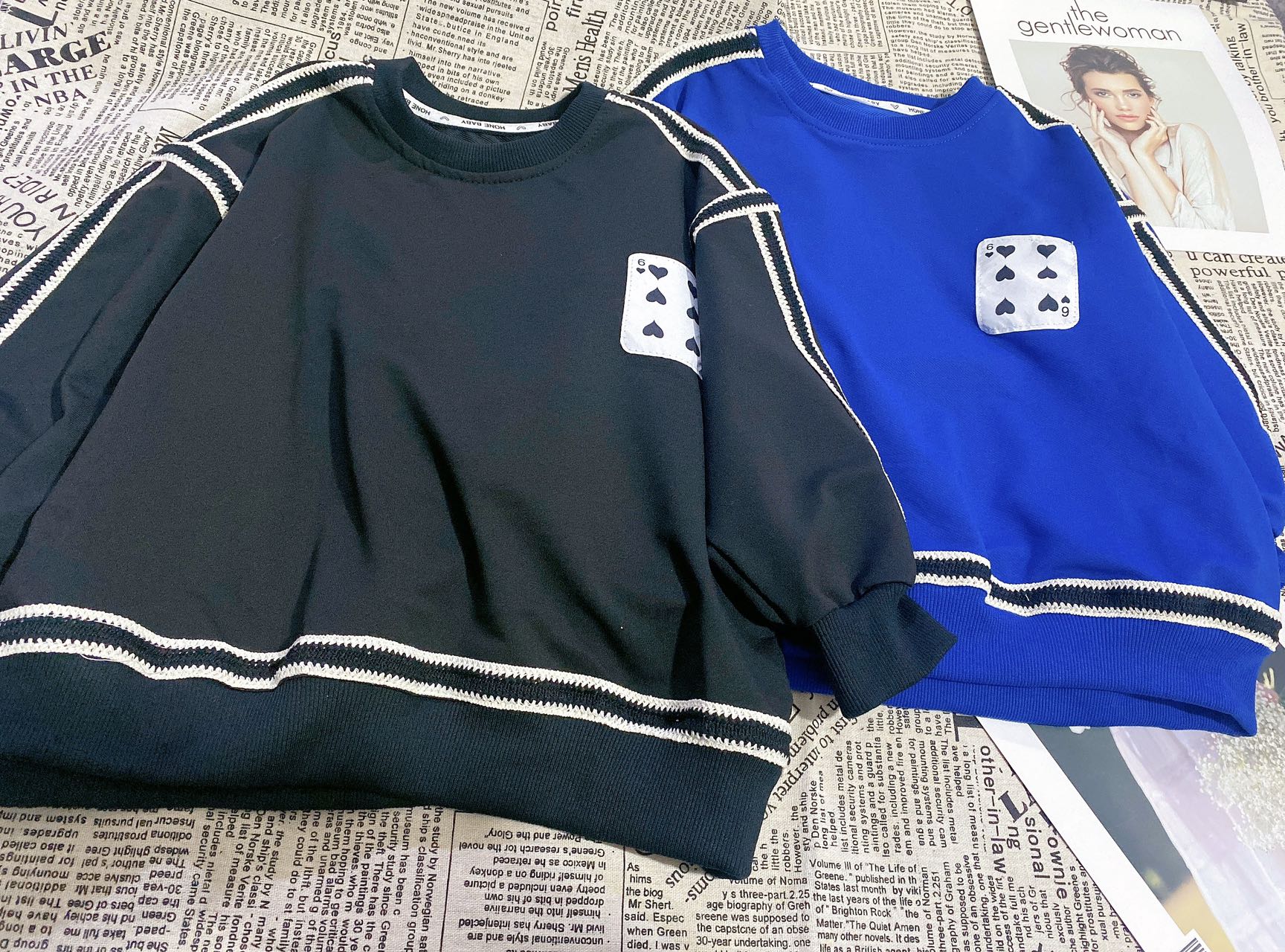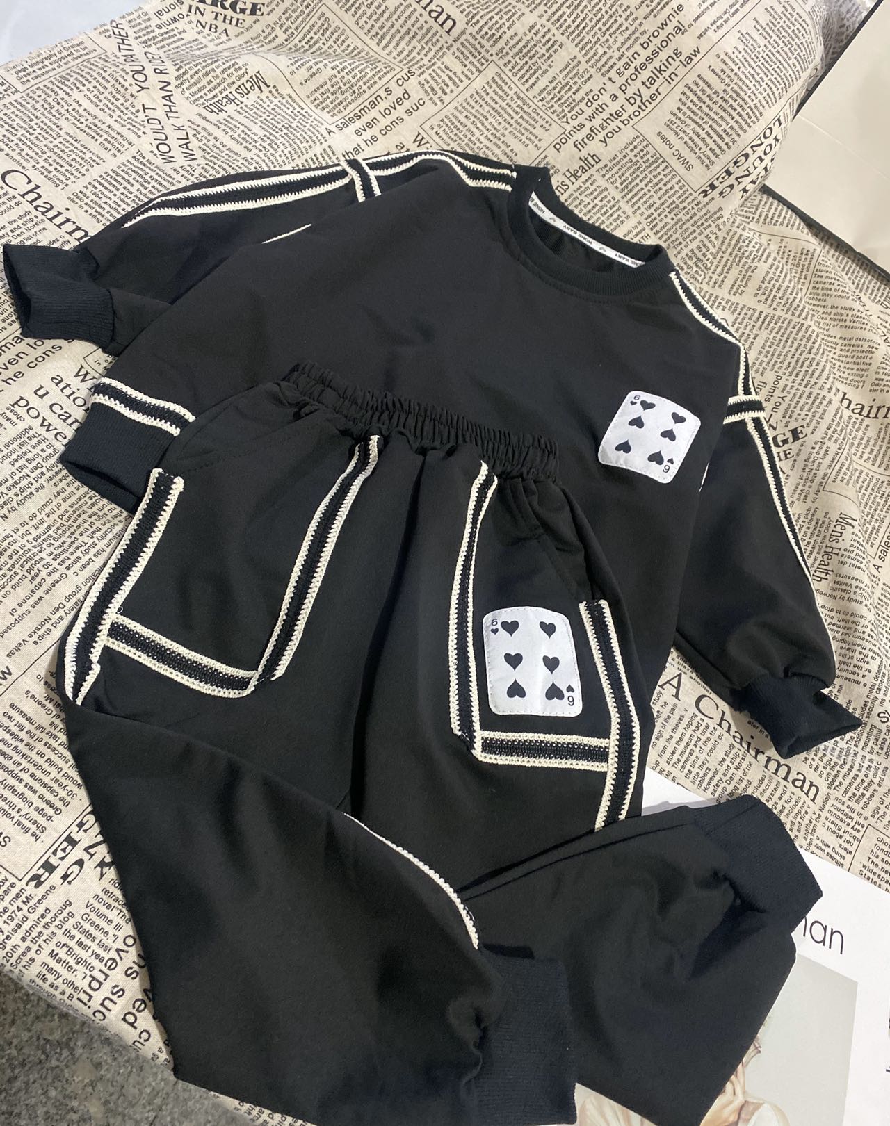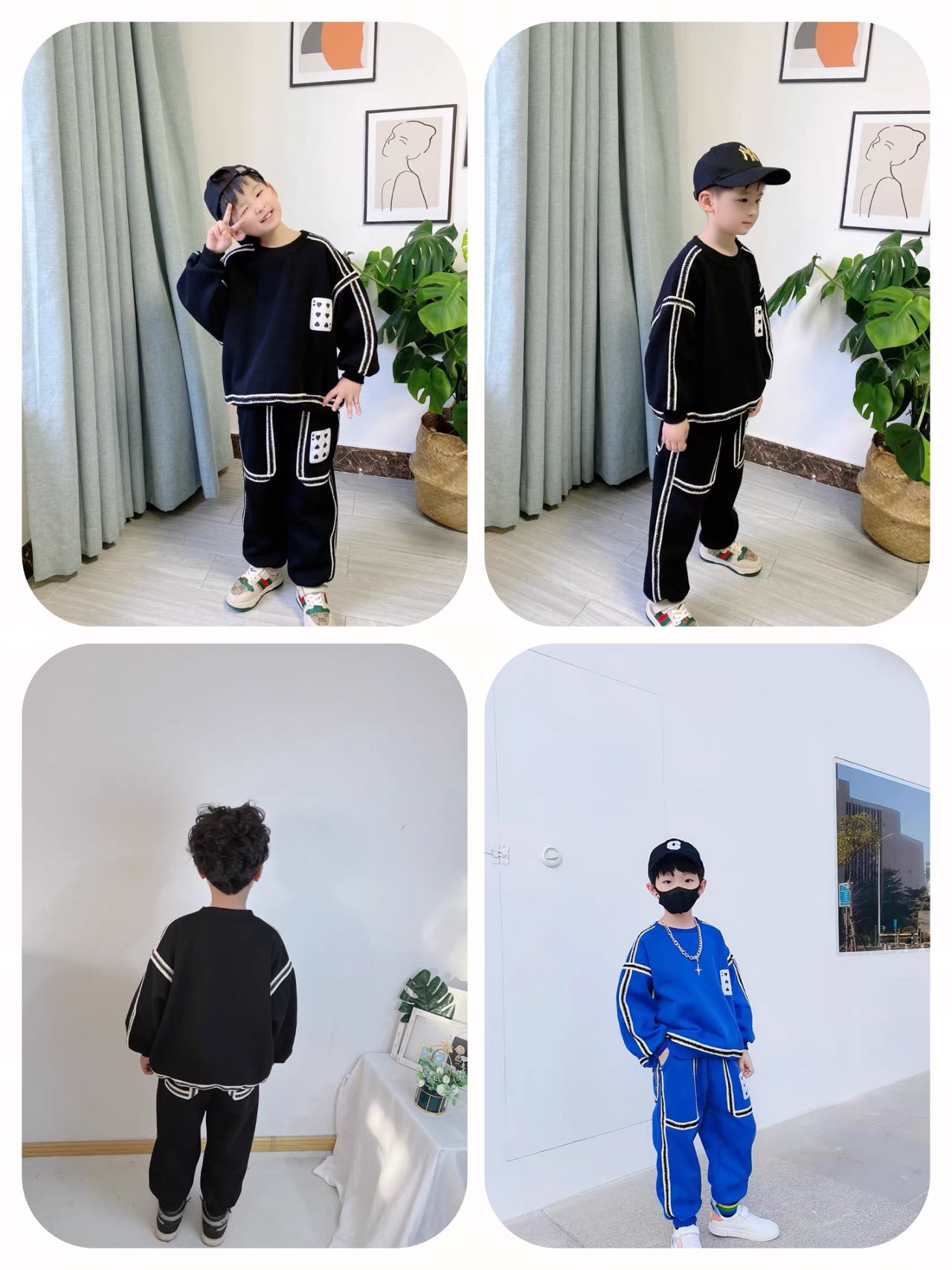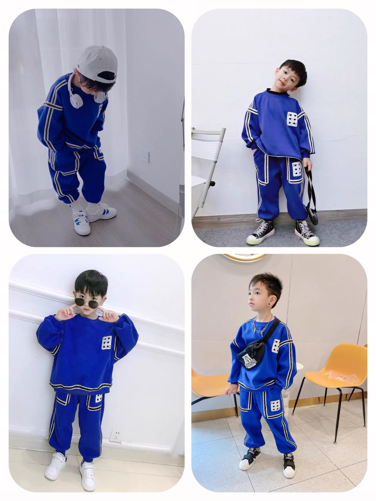 2、上衣和裤子扑克牌贴标非常吸睛,回头率高!亚迪卡棉柔软又保暖的针织面料,既有棉的吸湿透气性,又有涤纶的高耐穿性,手感亲肤爽滑,孩子穿得更舒适!