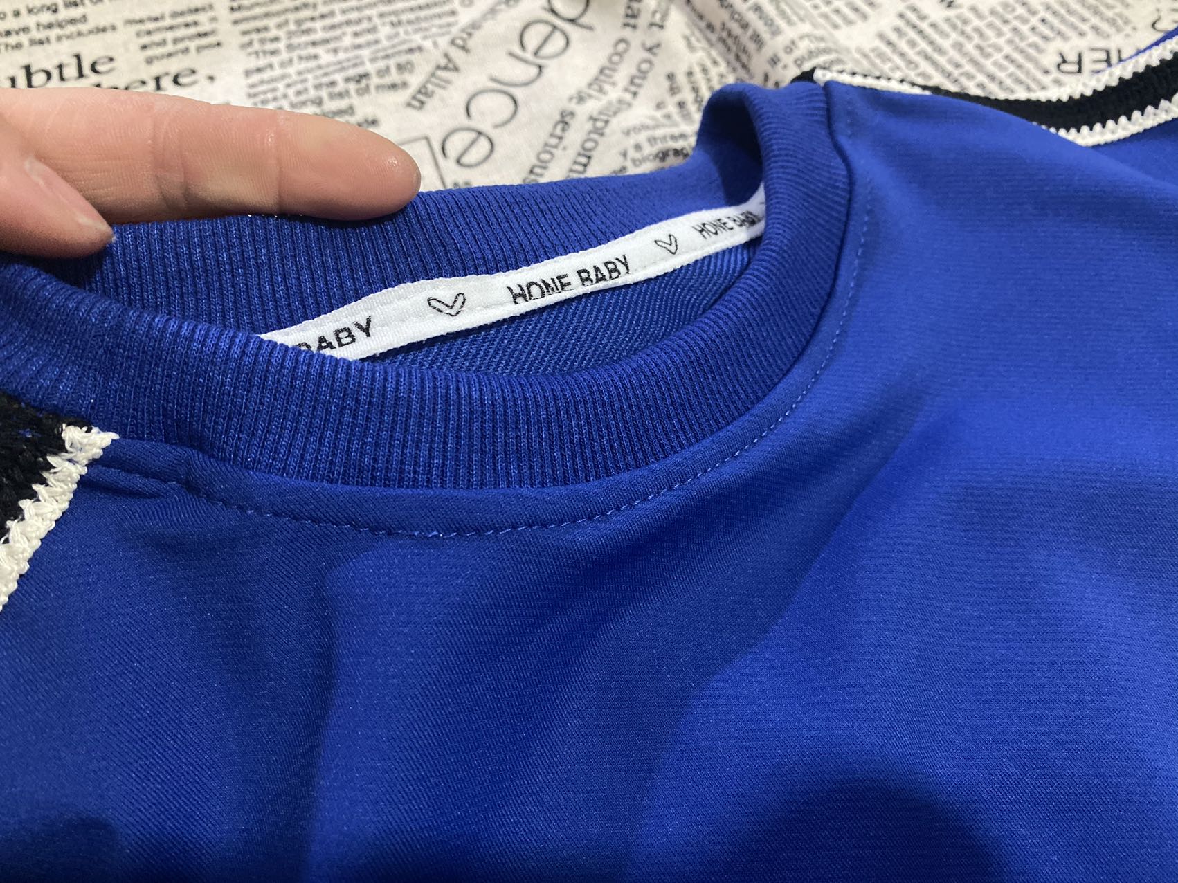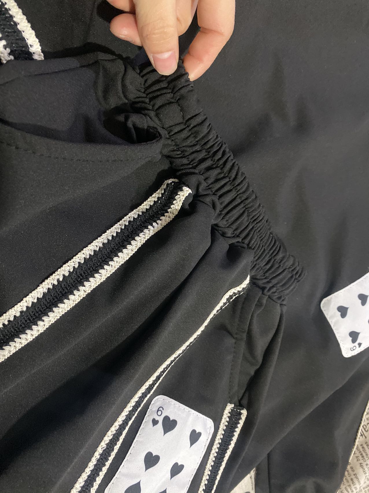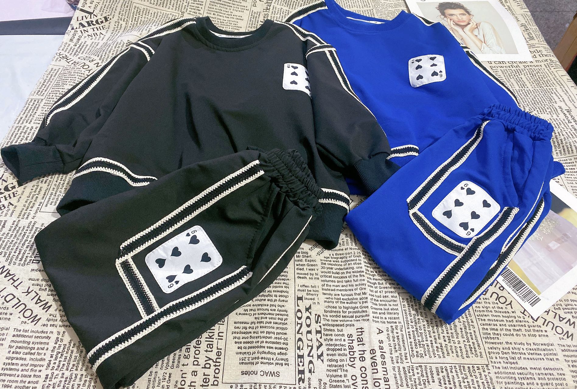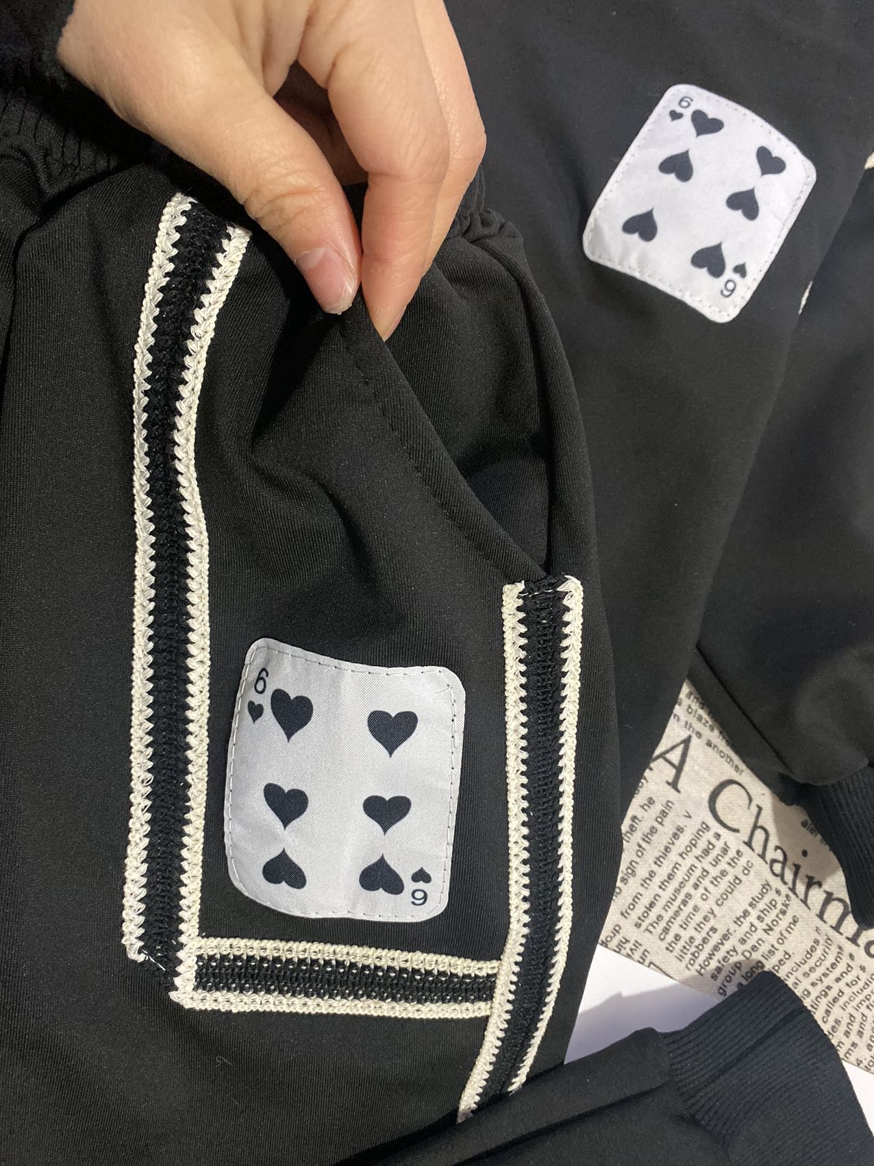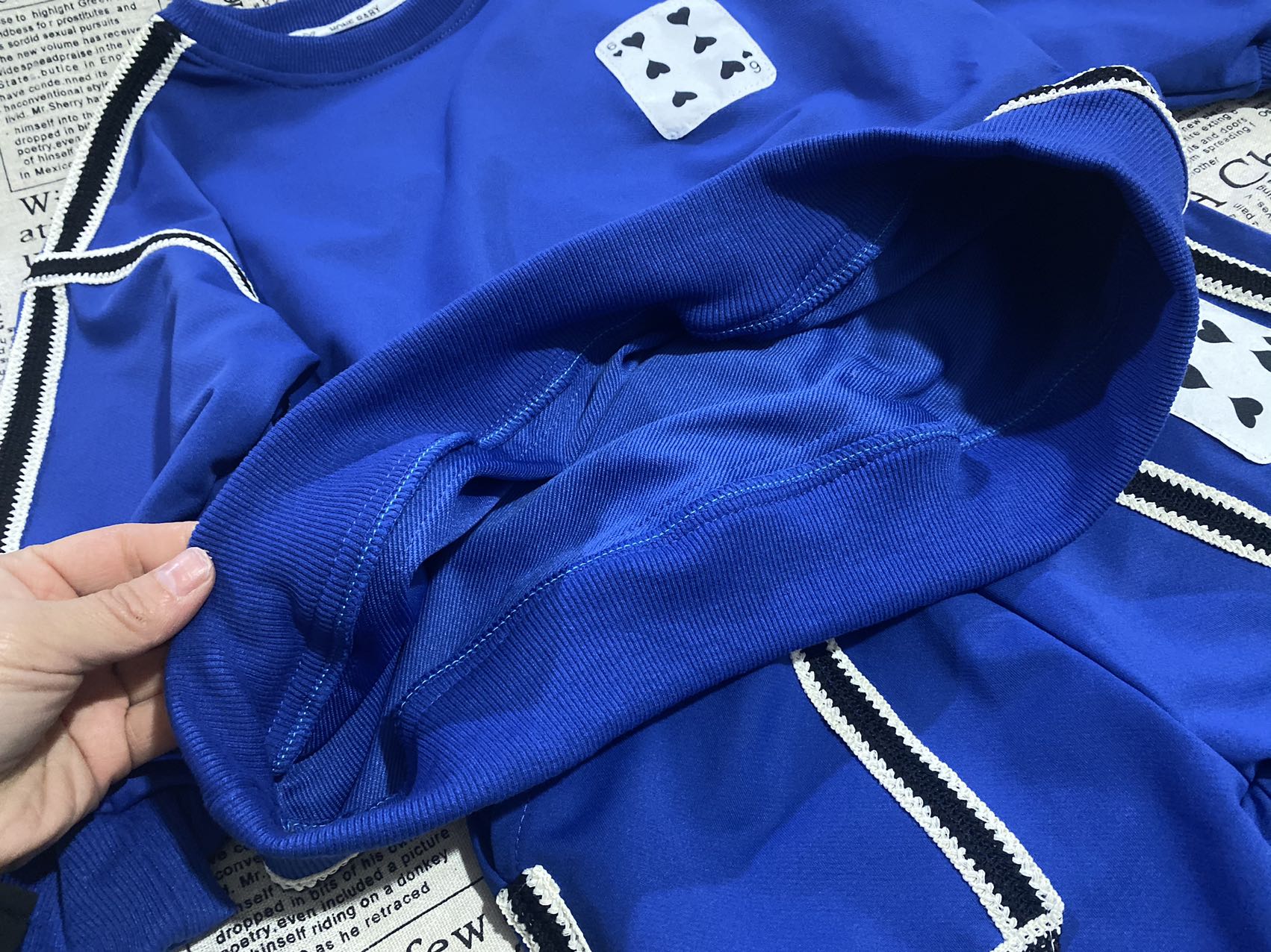 2、上衣和裤子扑克牌贴标非常吸睛,回头率高!亚迪卡棉柔软又保暖的针织面料,既有棉的吸湿透气性,又有涤纶的高耐穿性,手感亲肤爽滑,孩子穿得更舒适!