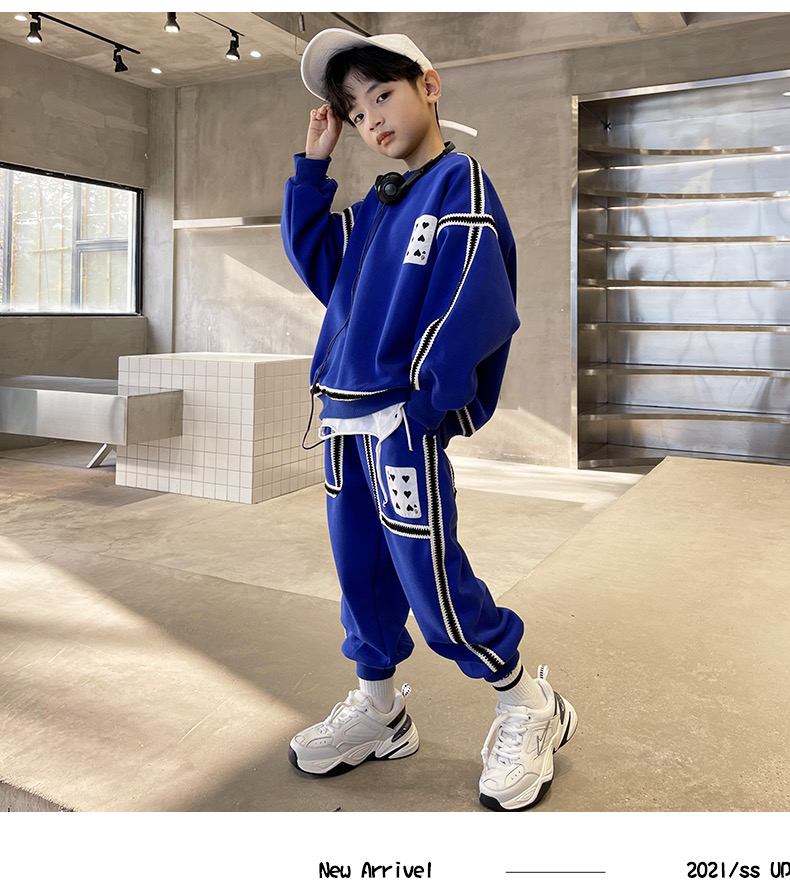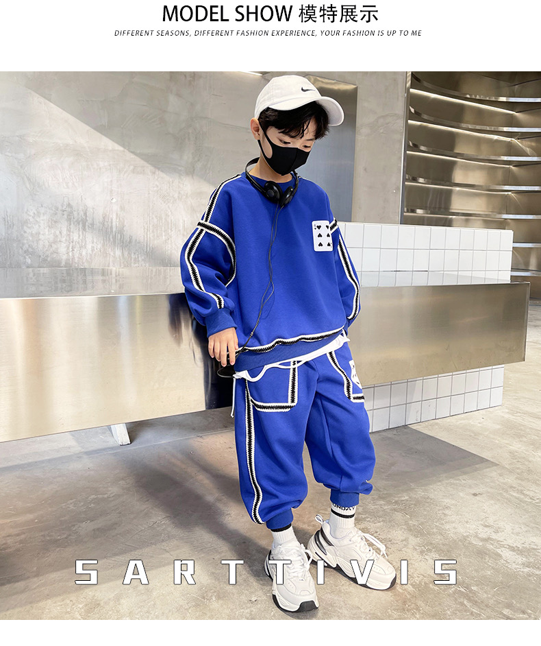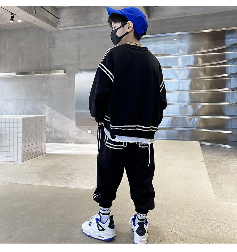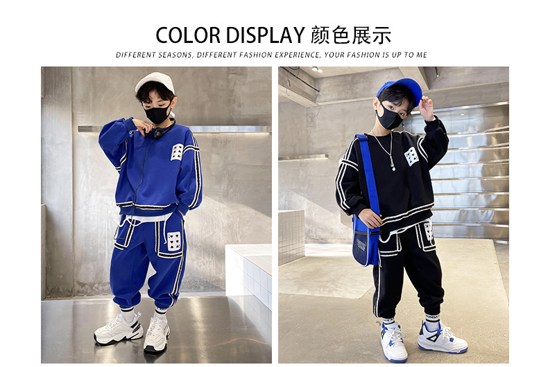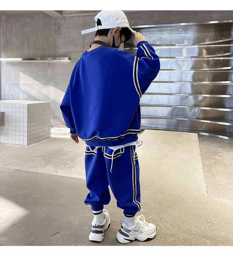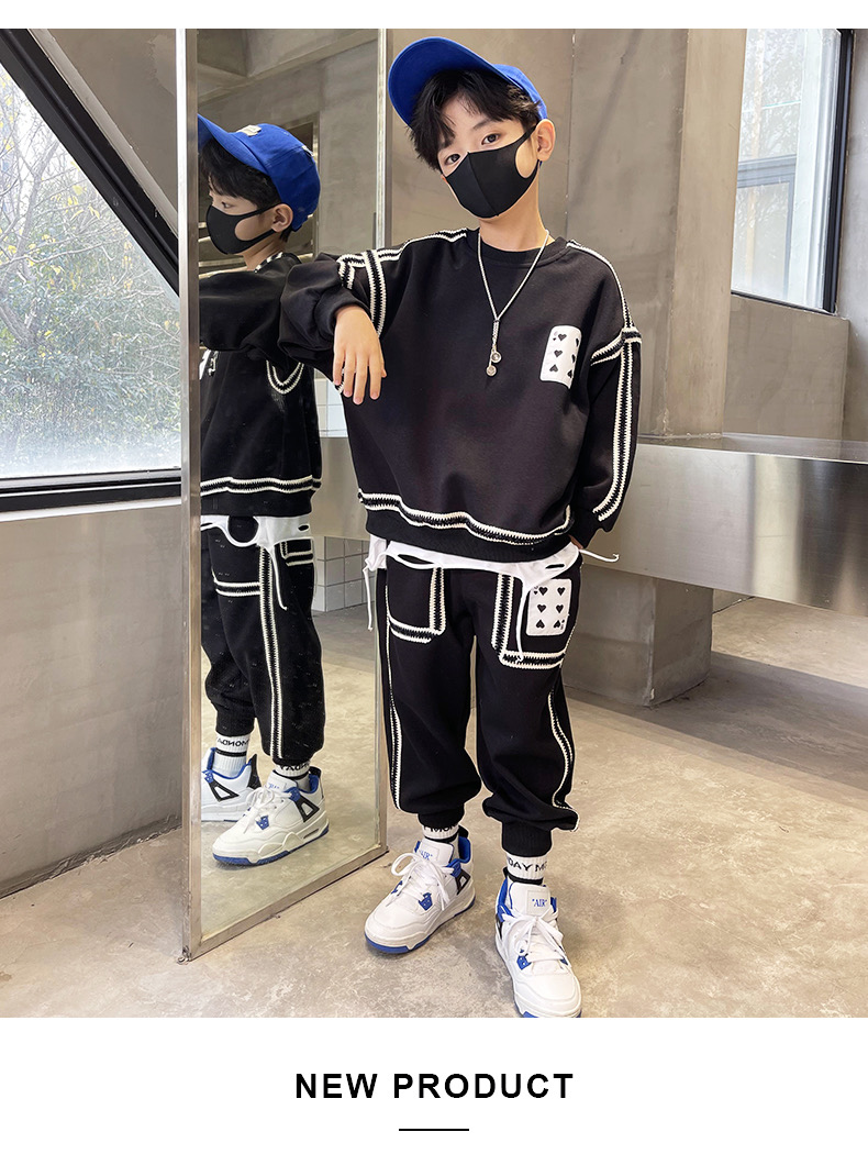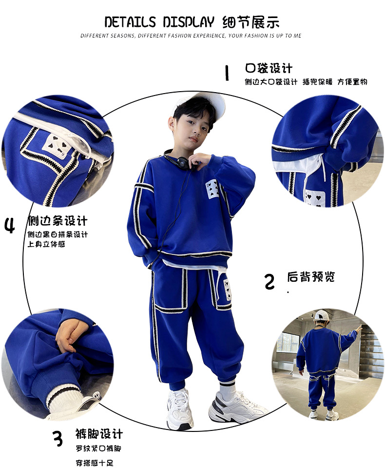 1、精致裁剪做工,走线细腻,不跳线,不跑线,卫衣卫裤都是休闲不挑人的,孩子胖瘦都很好驾驭,原创设计,张扬独特的魅力,整体设计让人感觉很潮,超酷的贴条,潮流感十足
