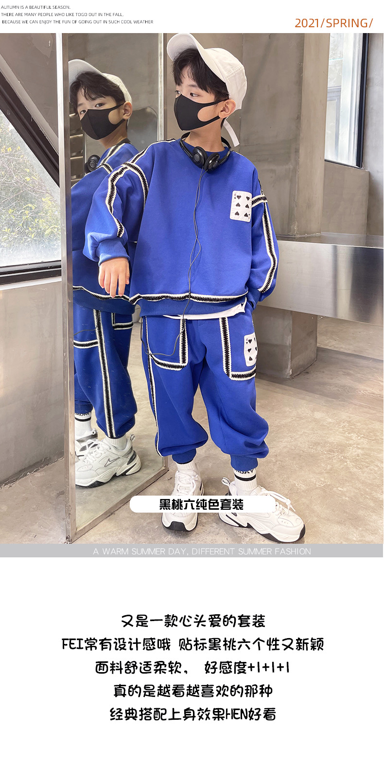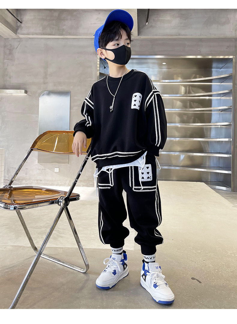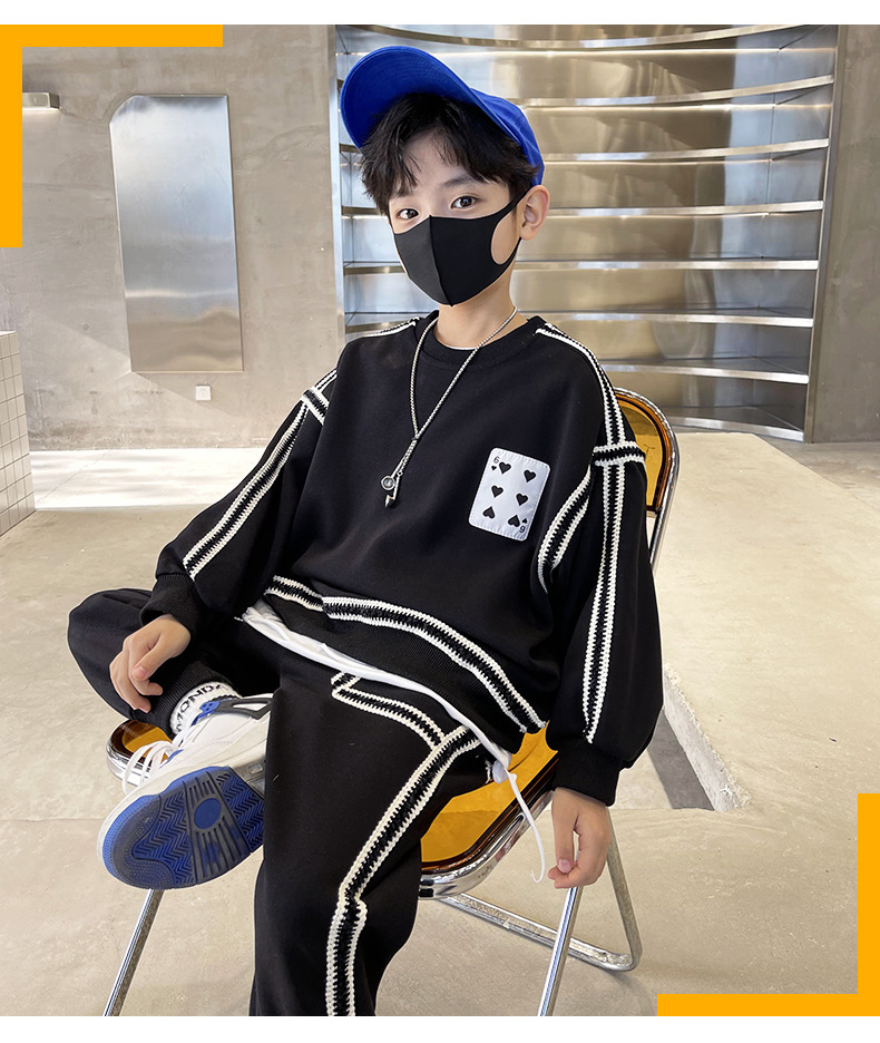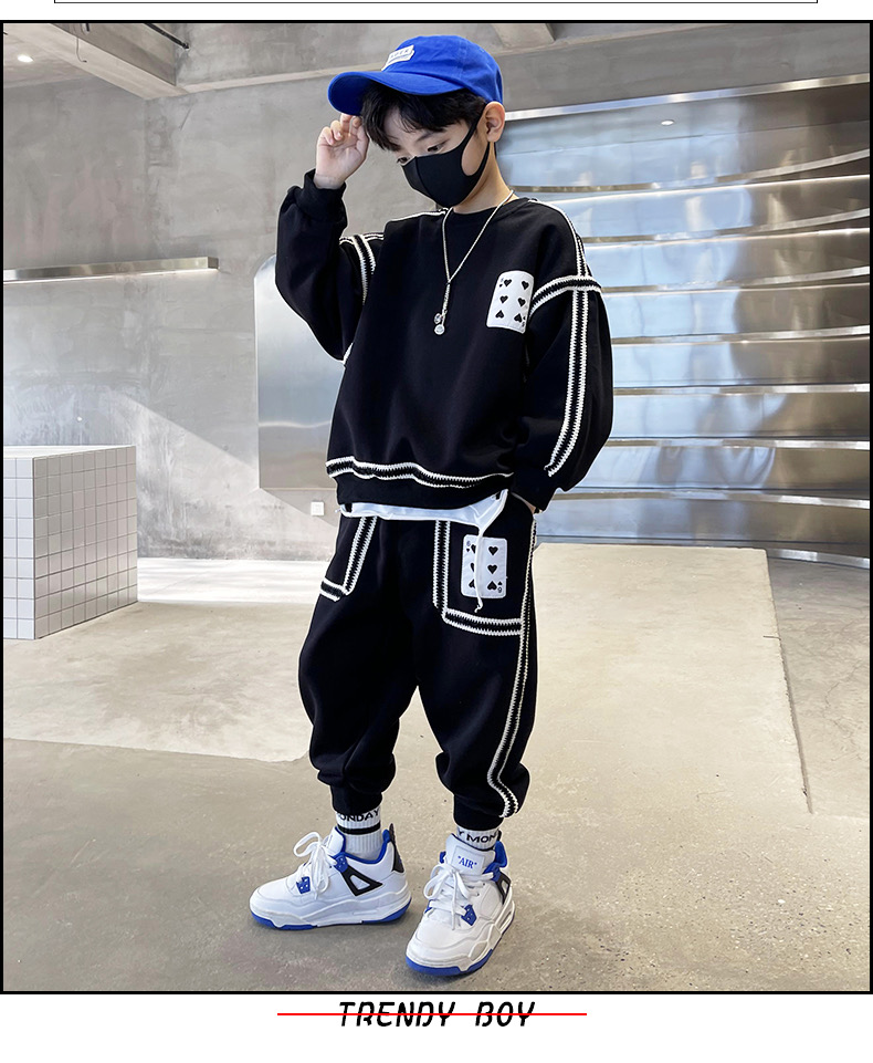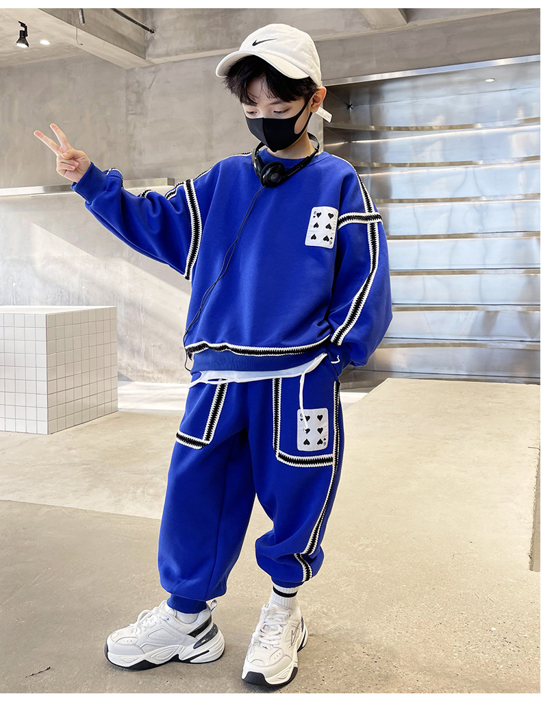 1、精致裁剪做工,走线细腻,不跳线,不跑线,卫衣卫裤都是休闲不挑人的,孩子胖瘦都很好驾驭,原创设计,张扬独特的魅力,整体设计让人感觉很潮,超酷的贴条,潮流感十足