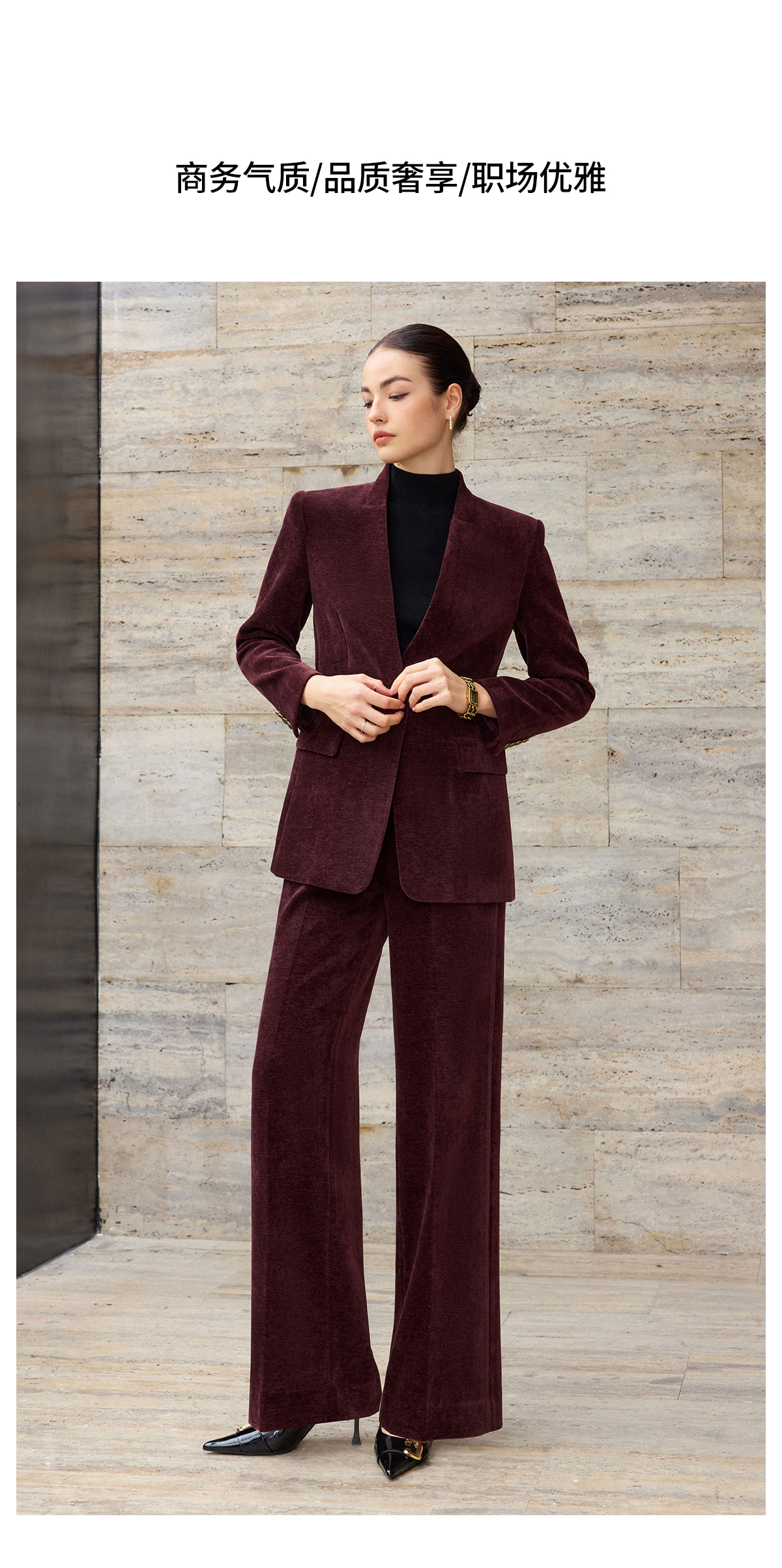 IWY/玫瑰砂岩豆沙红秋冬款灯芯绒无领西装西裤OL通勤套装CP2586