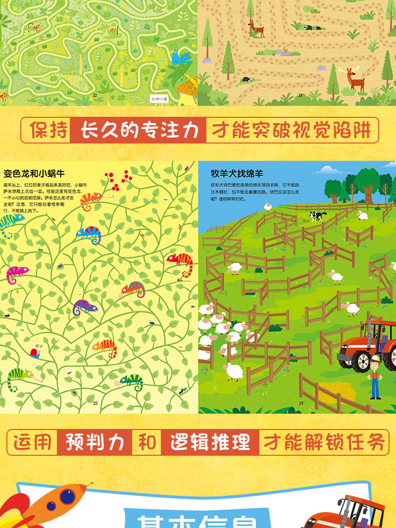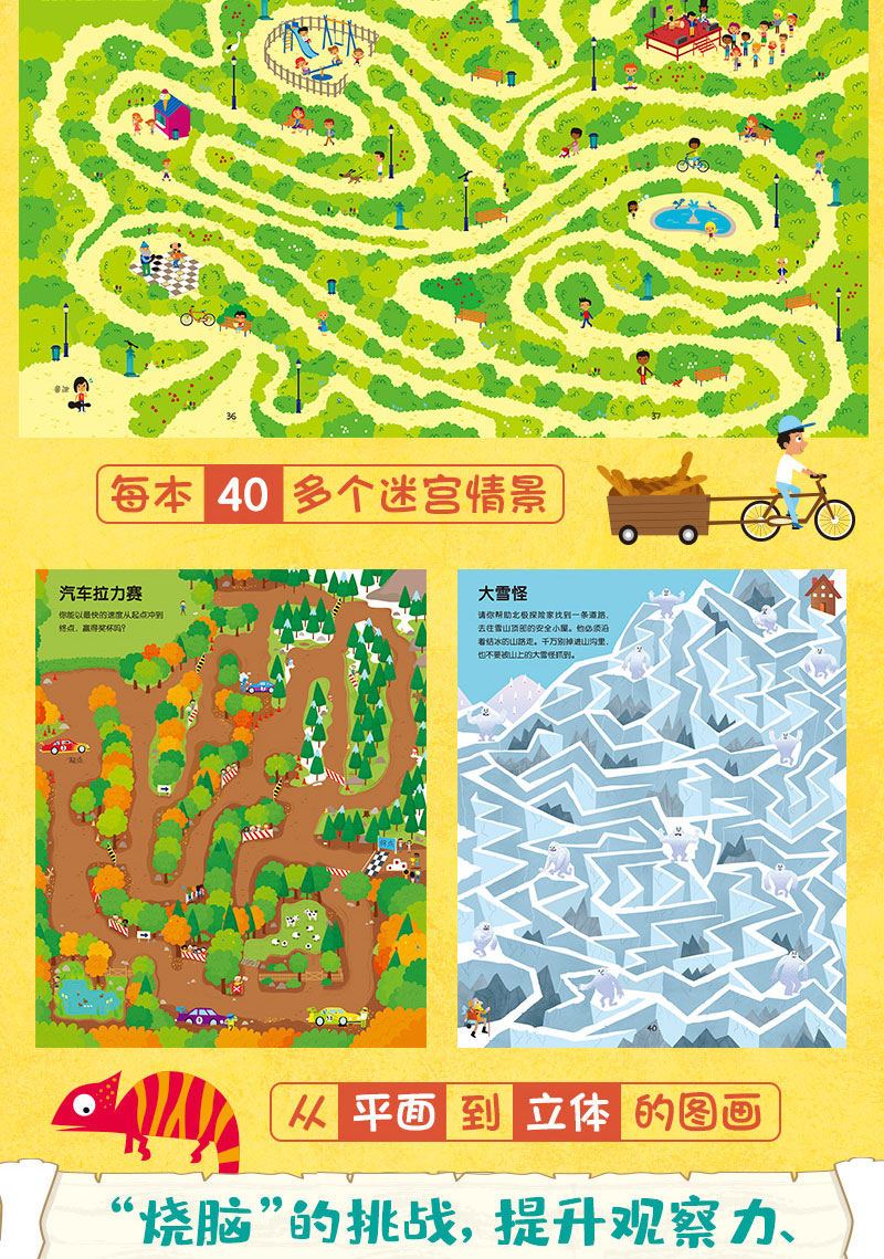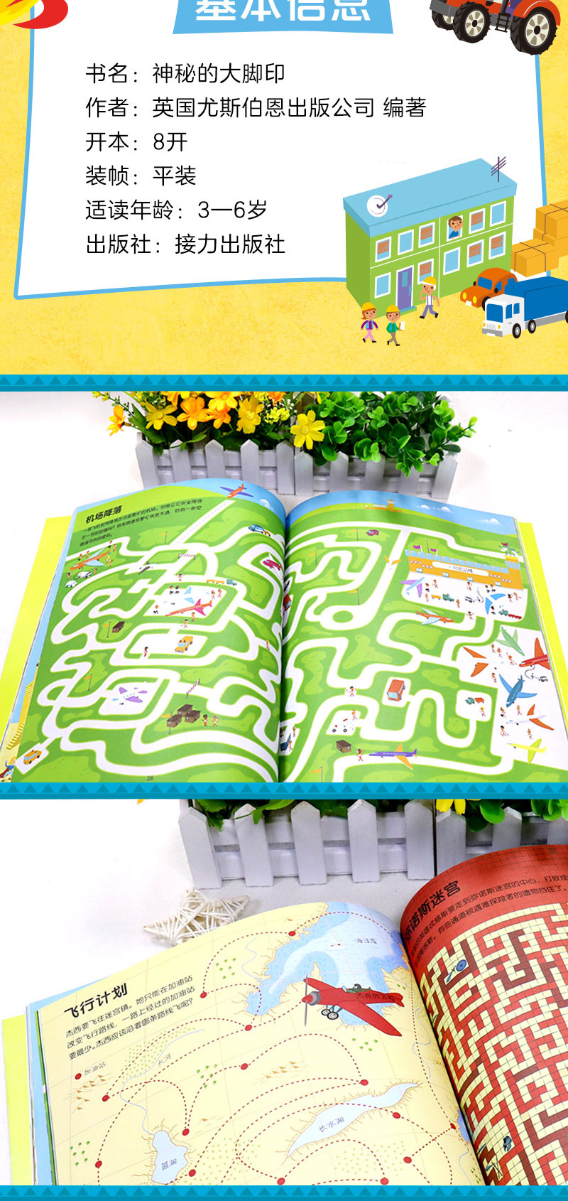 “大迷宫”是英国尤斯伯恩为3—6岁幼儿编写的一套游戏书。书中的情景画面有平面的,也有立体的。情景路线有相连的,也有上下叠加不相交的。通过多种形式的迷宫游戏,可以充分锻炼幼儿的专注力、逻辑思考能力、预判力和手眼协调能力。