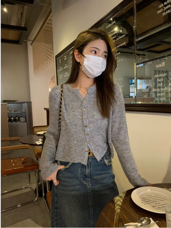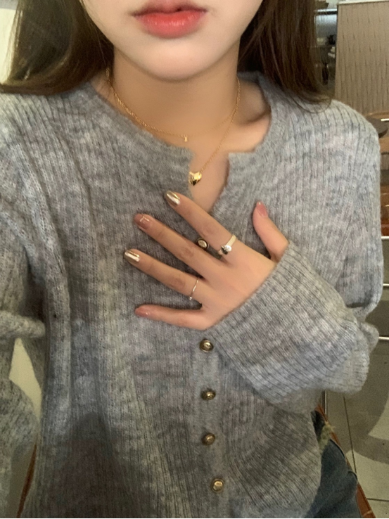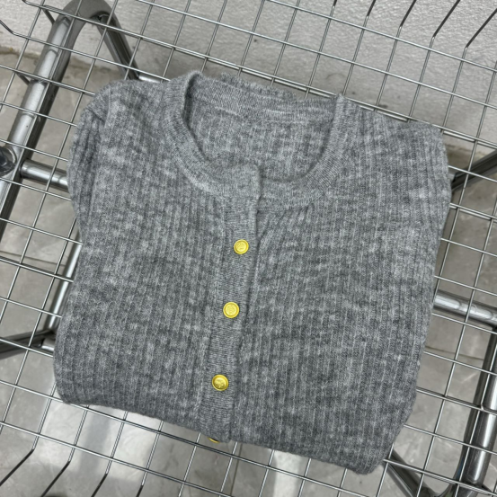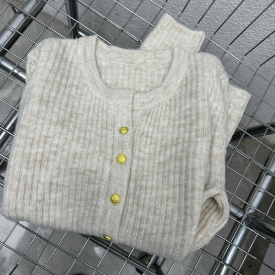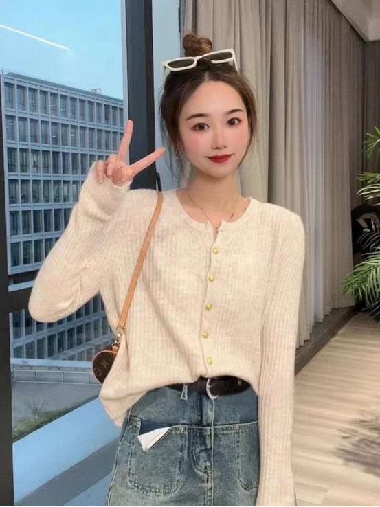 难得的合身显瘦又不紧绷,保留一份松弛感~ 简洁开襟,光泽小纽扣, 细节JING致感在线 扣合是圆领,服帖保暖;敞开当做一件针织小外套 里面可以搭一件薄薄的吊带,很有层次感~ 进阶技巧是上下各解开1-2粒扣,打造37分大长腿