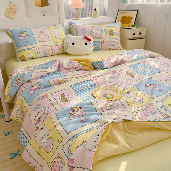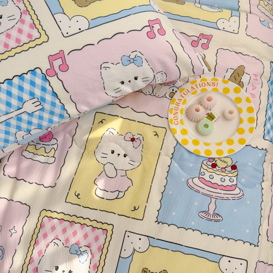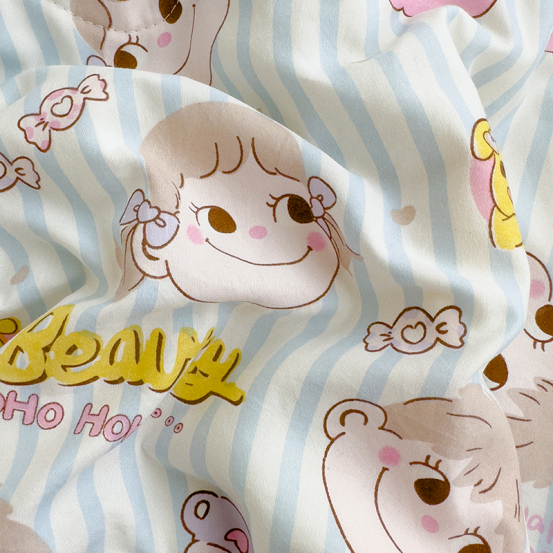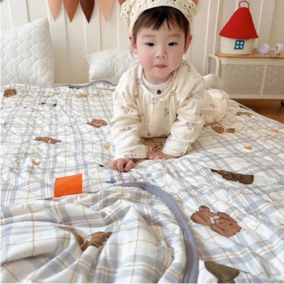 整床被子选用的都是高级别的针织棉,透气性很好,两层被子中间有一种空气感,摸起来酥软蓬松,让人忍不住就想上手rua。 皮肤稚嫩的娃也能毫无顾忌享受这份呵护!并且这种针织棉的面料还可以做到自带微凉感,凉而不冰很是舒服。