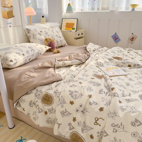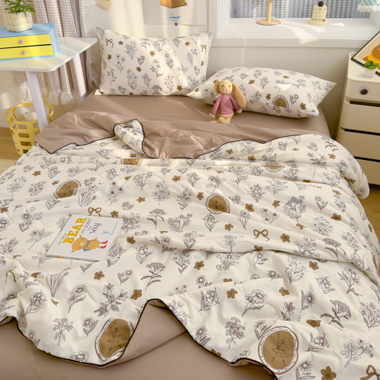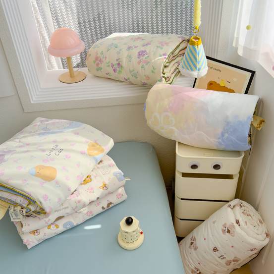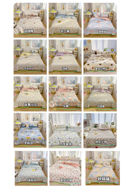 到了秋冬不盖的时候,随手叠成豆腐块塞到衣柜角落就OK,一点都不占地方。 我们给大家选的这款被子,一共有10几款不同的花色选择,既温柔又可爱,保证宝宝看了就爱不释手。 淡雅的小碎花、可爱的小狗、蝴蝶、小兔子、小狗等动物......都是孩子喜欢的元素,铺在床上,连儿童房的精致感都能再上一个level。 110x150cm尺寸图案可选: 绿风铃、曼塔玫瑰、小熊院长 三款图案