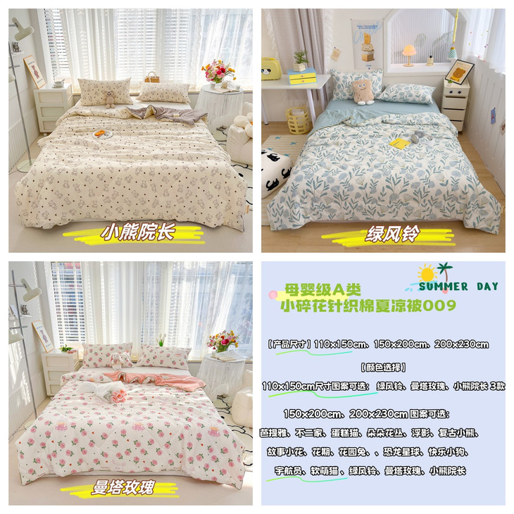 【人间花仙子】A类母婴 小碎花针织棉夏凉被009 【品牌】奔寻 【产品尺寸】110x150cm、150x200cm、200x230cm 3尺寸选择 【颜色选择】 110x150cm尺寸可选图案: 绿风铃、曼塔玫瑰、小熊院长 150x200cm、200x230cm : 芭提雅、不二家、蛋糕猫、朵朵花丛、浮影、复古小熊、故事小花、花期、花园兔、、恐龙星球、快乐小狗、宇航员、绿风铃、曼塔玫瑰、小熊院长 【材质】面料材质:针织棉 、 填充物:聚酯纤维 【发货地】江苏南通 【发货快递】申通 邮政 【发货时效】下单后3-5天内 【加运费区域】新疆青海西藏运费+20元 【是否支持7天无理由退换】支持 七天内不影响二次销售可无理由退换,非质量问题客户承担寄出运费5元 【关于退换货】有问题请第一时间拍照留证反馈客服,关于色差:因显示器,拍摄光线,角度不同等问题可能造成图片与实物有少许色差 不属质量问题,请以收到的实物为准,家纺类产品存在轻微线头,属于正常现象不在售后范围内,家纺类产品存在轻微线头,属于正常现象不在售后范围内 【售后标准】床上用品务必及时签收,及时验货,切勿水洗,水洗不再售后!质量问题签收起48小时之内带快递面单与产品同框拍照报售后,超时不予处理望谅解~凡是影响二次销售的产品一律不再售后退换、凡是洗涤过后的产品一律不再售后退换!