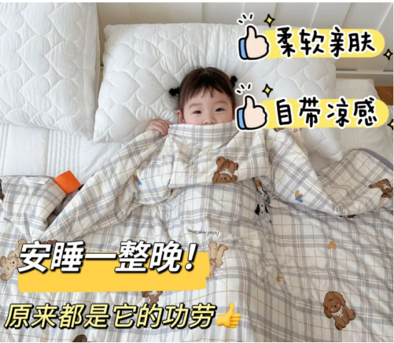 不是那种难受的冷,而是浑身被轻柔的风包裹的感觉。 凉凉滑滑的,让人想要直接融化在被窝里,一觉睡到自然醒。 这种针织棉纤维之间的空隙更大,就像在被子里安装了无数个会自主呼吸的「肺泡」,吸湿透气性非常好。 相当于在床上安装智能空调,能调节出最适合你的温度。 无论孩子是习惯闷头睡还是盖半身,只管随便睡,整夜干爽不粘腻,怎么睡都舒服。