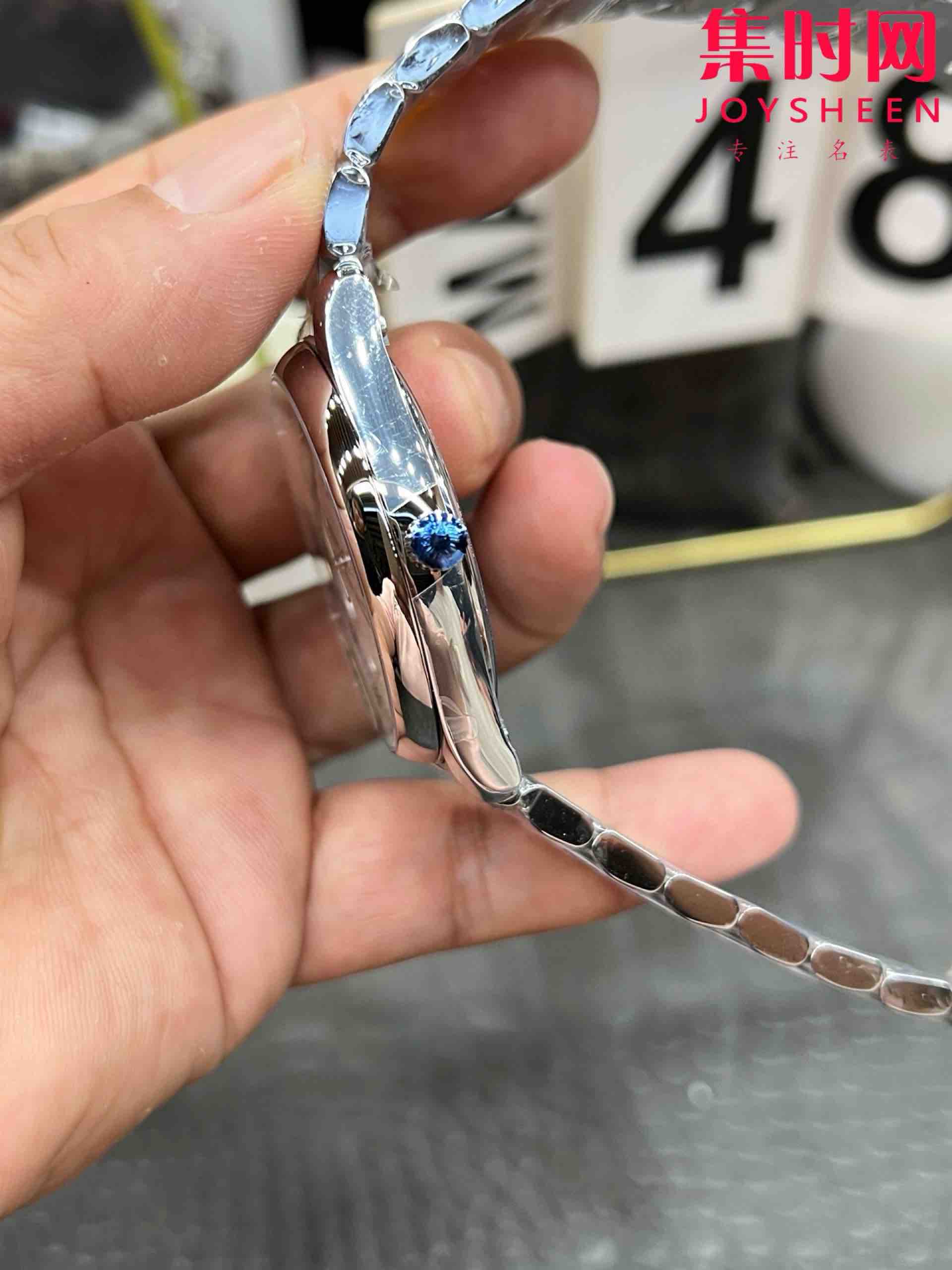 表盘材质:“麦粒”饰纹,漆绘阿拉伯数字,蓝钢指针
