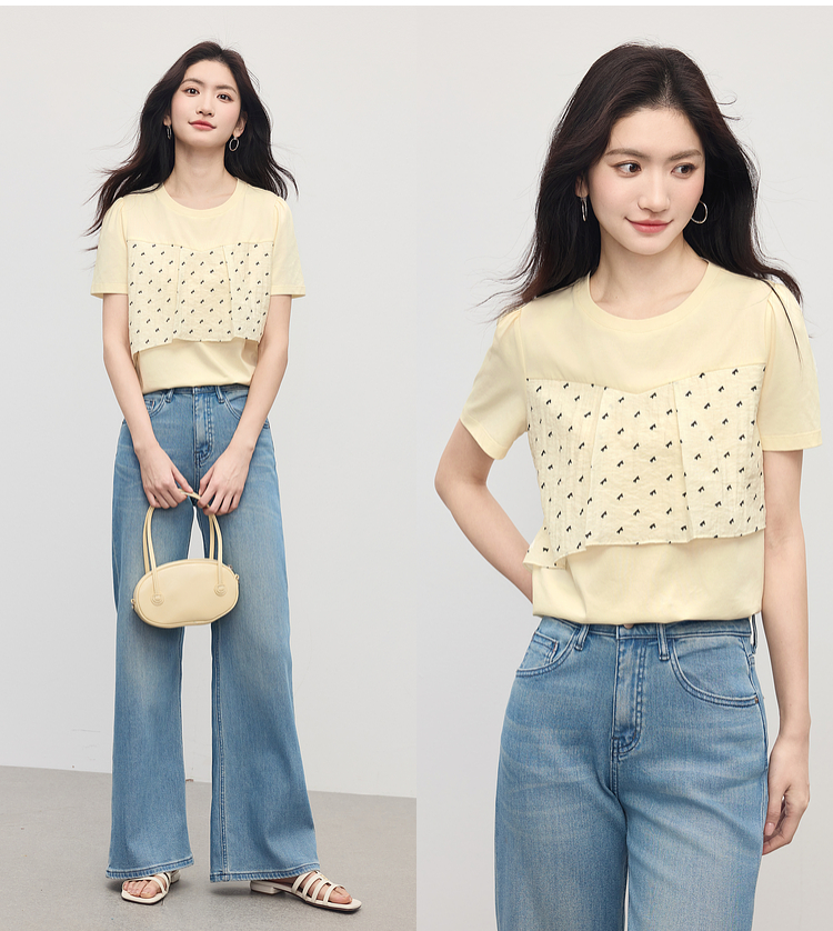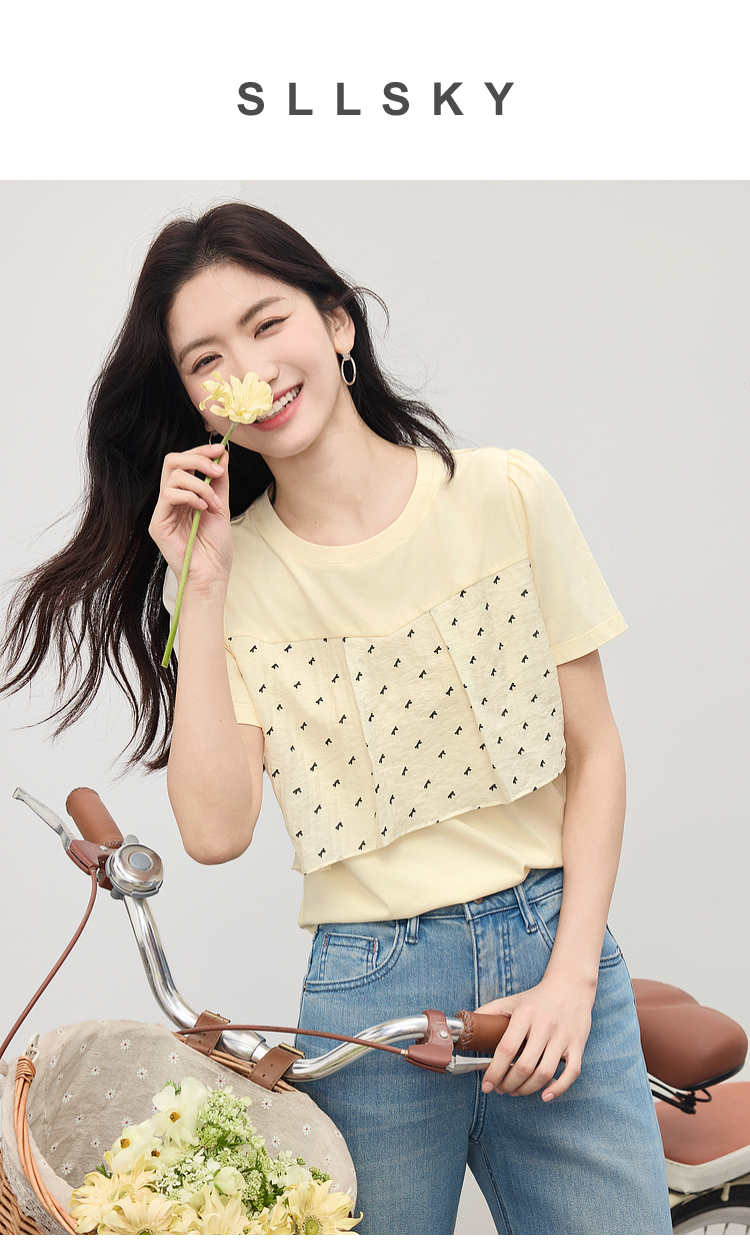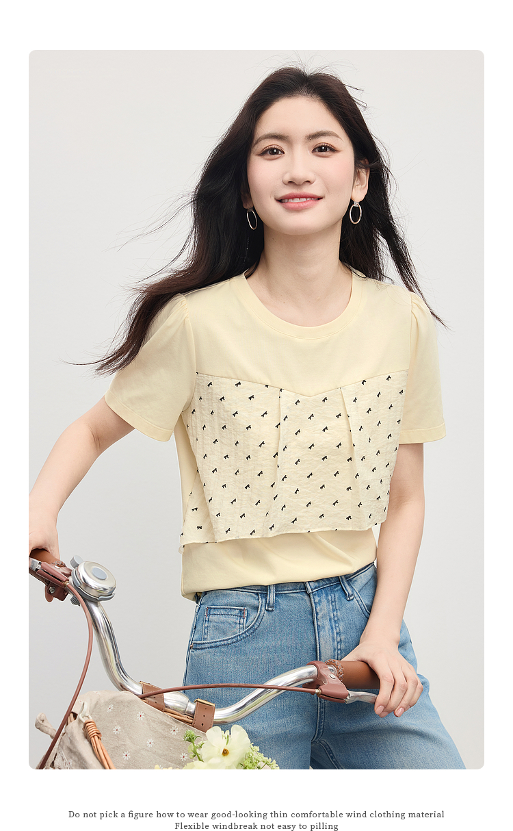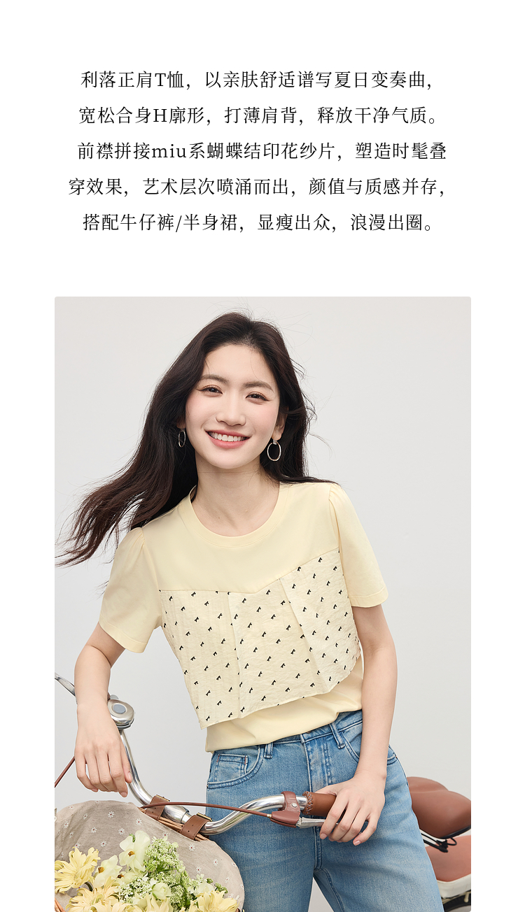 【初夏新品】熙世界蝴蝶结印花拼接短袖T恤女夏日淡人穿搭设计感圆领正肩上衣