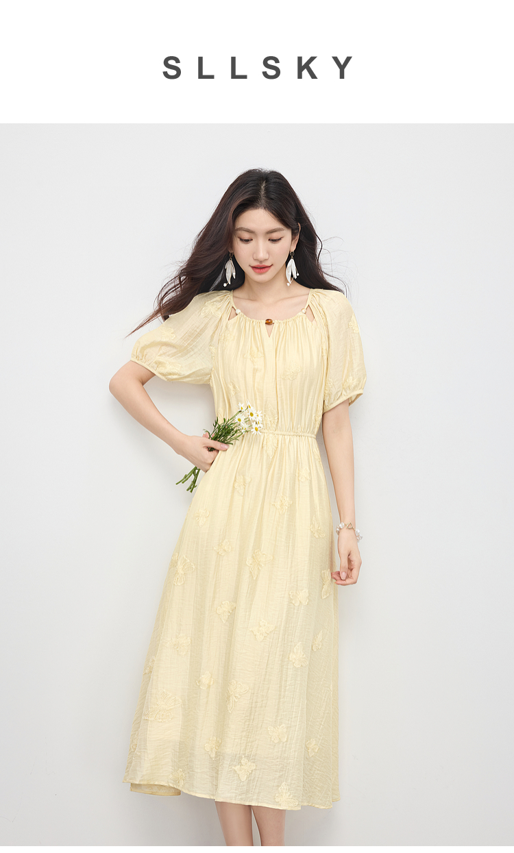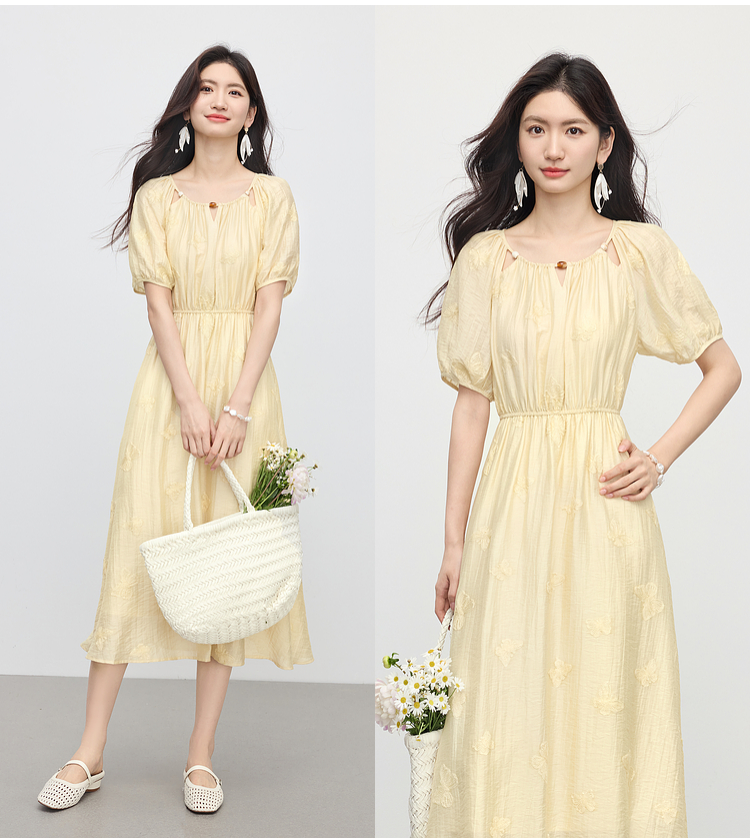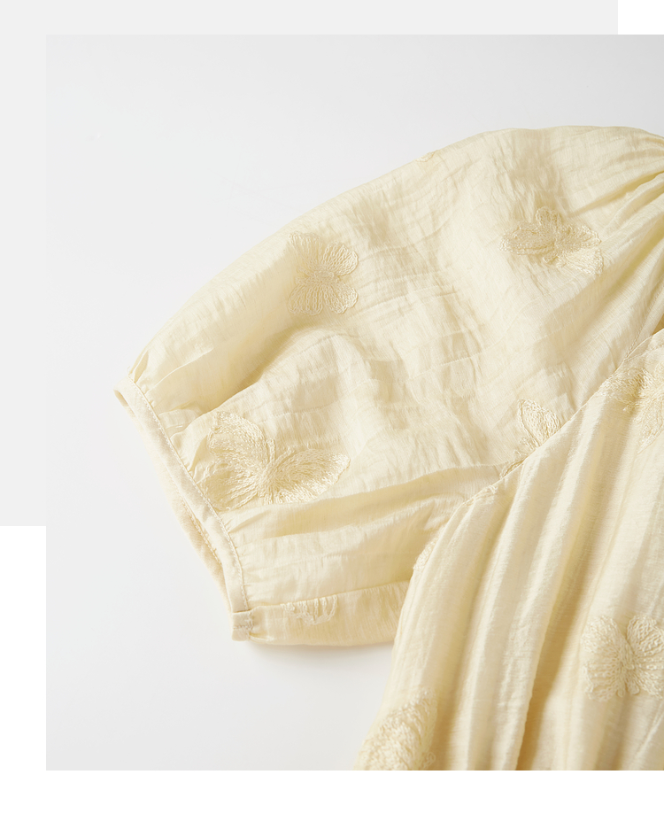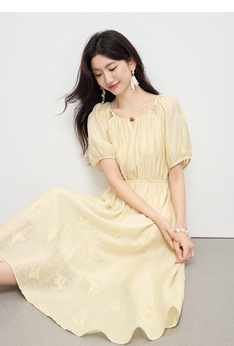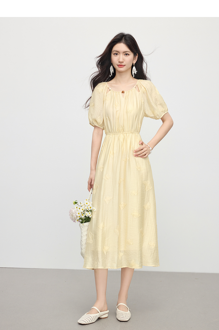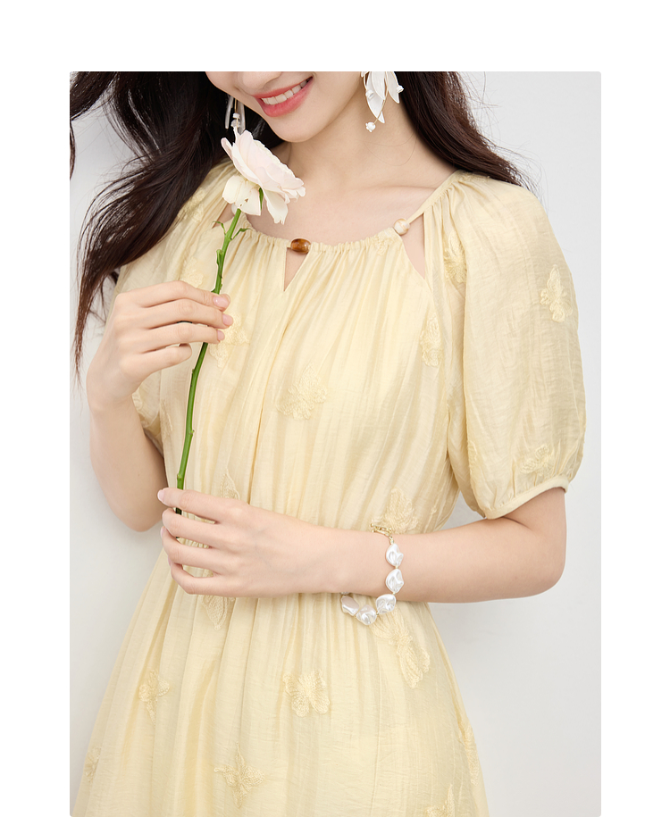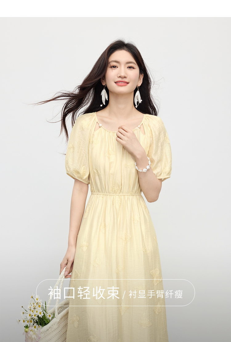 【专属特价】熙世界【含亚麻】波嬉风刺绣连衣裙女夏季新款泡泡袖显瘦收腰长裙
