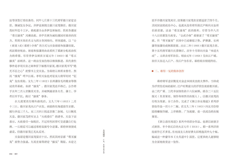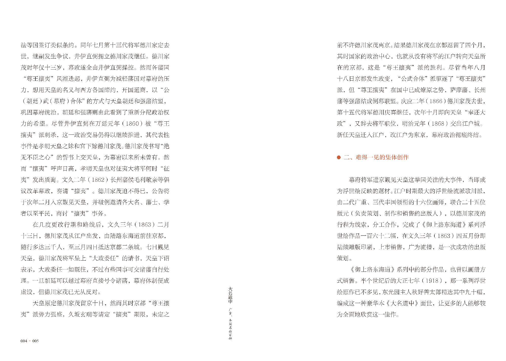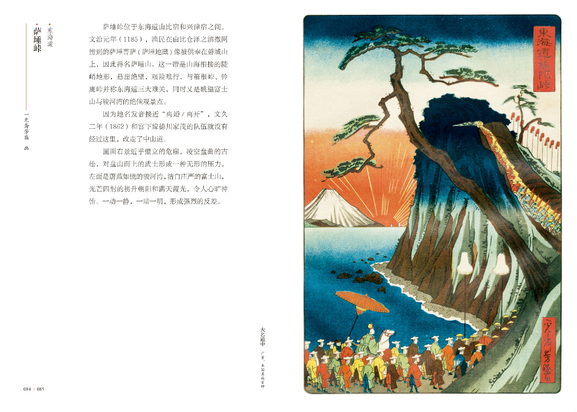 《大名道中》是歌川派以日本百年不遇的真实历史事件为背景绘制的浮世绘名作。大政奉还之前,1863年幕府将军德川家茂前往京都朝觐天皇,这是自从1634年德川家光上洛朝觐二百年来的初次,又适逢倒幕运动,因此成为举国瞩目的重大事件。这使得《大名道中》不只是单纯作为风景画的“名所绘”,而是具有历史意义和内在联系的一组作品。其次,这是江户时期浮世绘一大流派歌川派,以二代广重(森田镇平)和三代丰国(歌川国贞)领衔,联合月冈芳年、河锅晓斋等16位知名画师、25位出版人集体制作的浮世绘作品集,是难得一见的集体创作。东海道沿线的风景名胜、古城风貌、繁华街市、名店特产、人物故事,也都被绘师们一一收入画中。每幅画均附有版画专家薛冰父女所作的解说,便于理解。