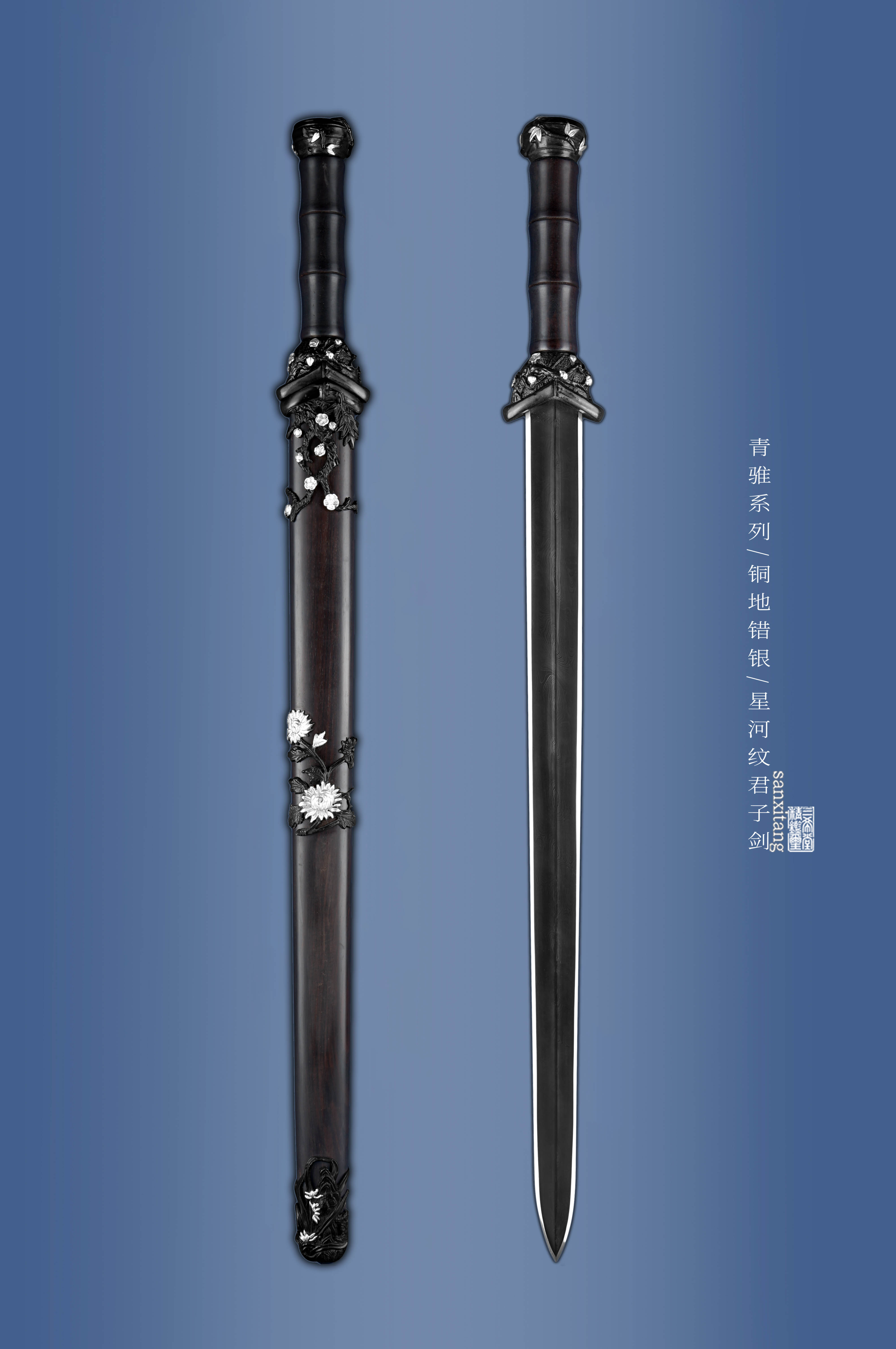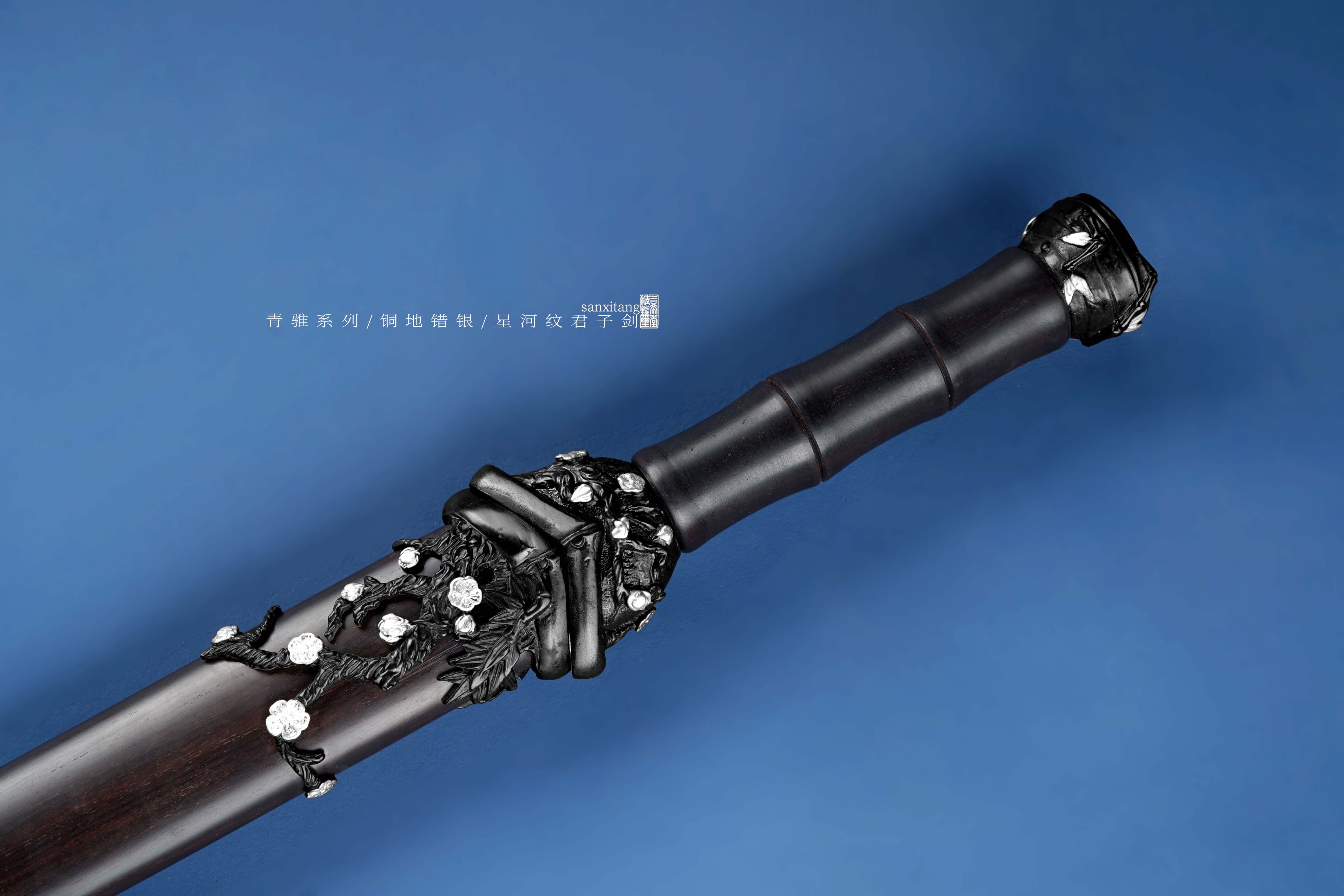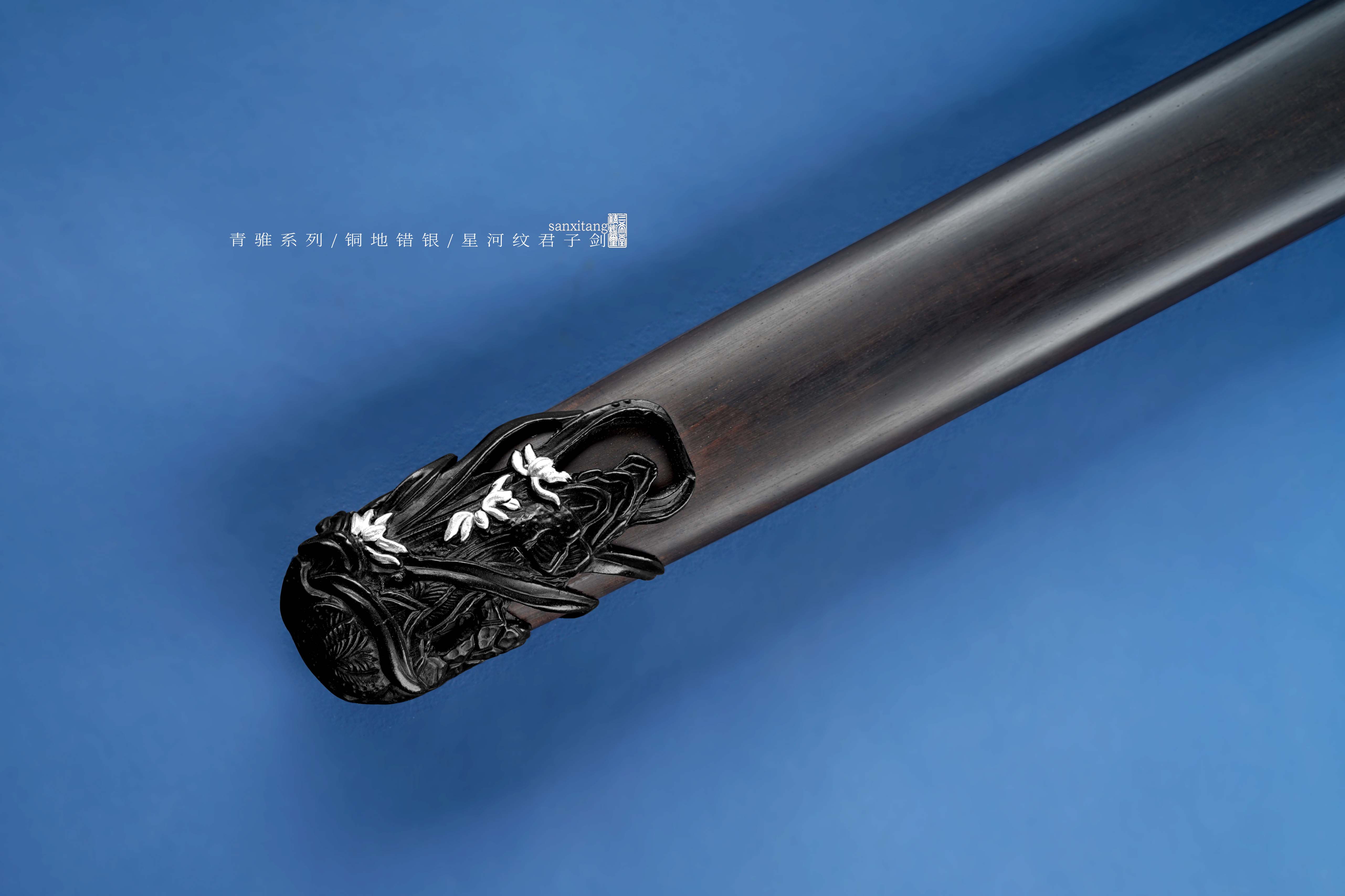 新出的招牌短剑 瓦槽镜面版本 全长78 这款是我们做了13年的款式 样式一直没变过 可以说是非常经典了 铜地四君子金具 复古错银 全黑檀木柄和鞘 手工锻打4000层扭转剑条 开瓦槽 之前的版本是开普通槽 普通打磨 今年升级成了开汉代瓦槽 手工镜面打磨 更好的把纹路展示出来 实物非常漂亮 配置升级了很多 制作工时多了很多 但是价格我们只涨了一点 还是非常划得来的 推荐各位入手 自己收藏或者送人都挺好