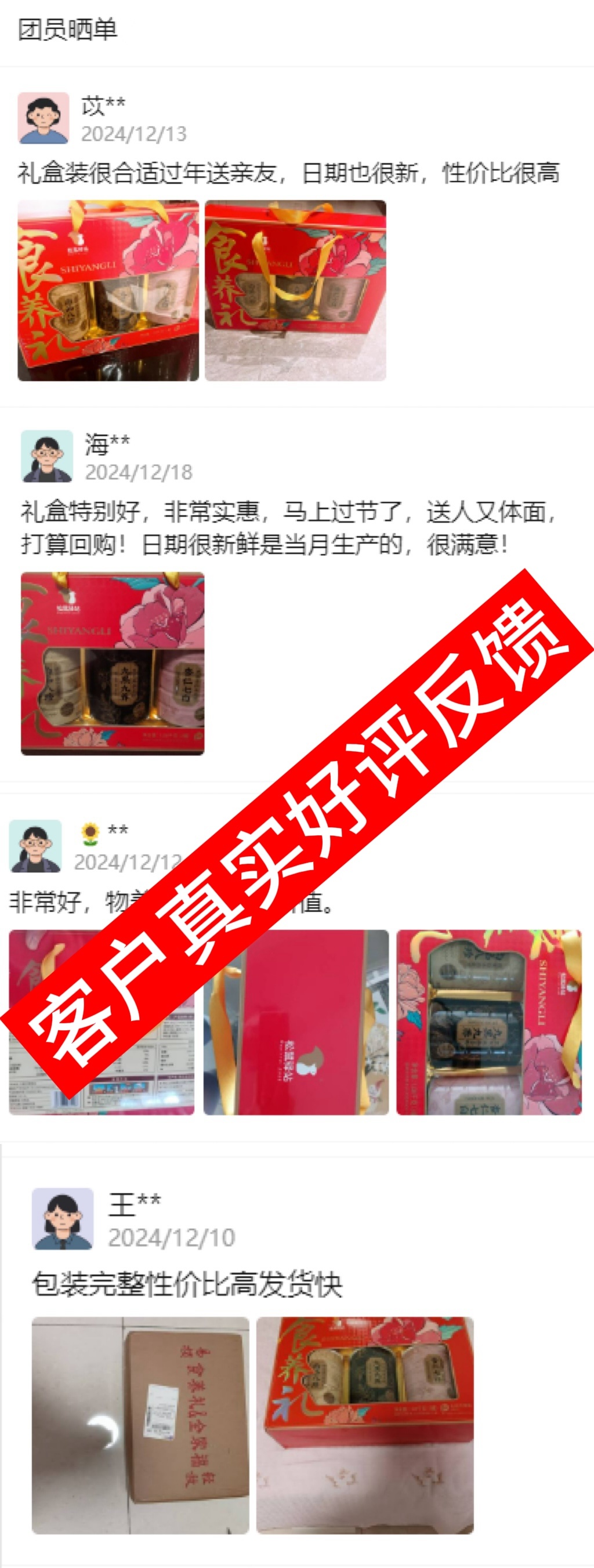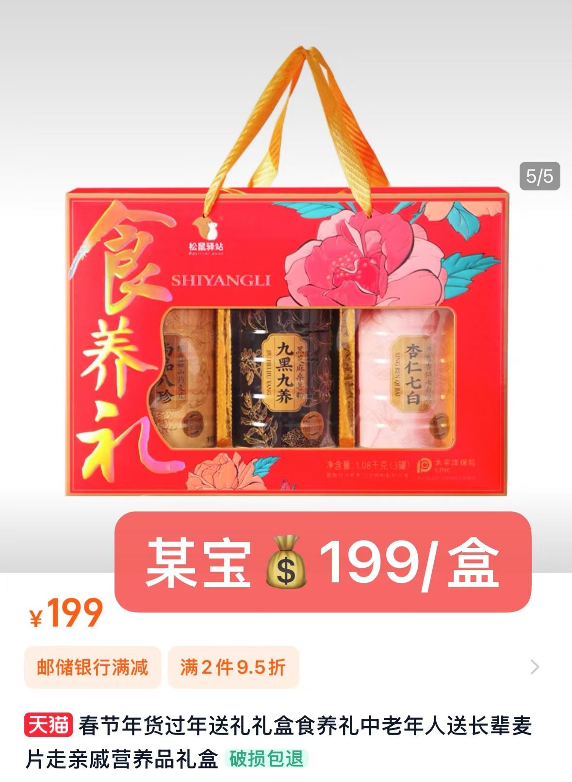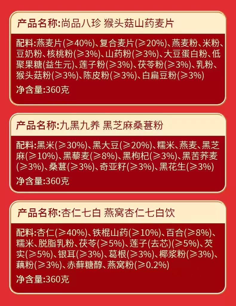 【品名】松鼠驿站食养礼大礼盒 【净含量】1.08kg/盒 【生产日期】2025年8月 【保质期】12个月 【贮存方法】常温保存,避免阳光暴晒,开罐请尽快食用。 【禁食人群】婴幼儿、对营养粉过敏者。 【食用方法】取本品50克倒入碗中,加入85°C以上开水(约180ml),搅拌均匀即可食用 【发货地】山东 【发货快递】三通一达、极兔、邮政(随机发) 【发货时间】下单2-3天内,如其他渠道爆单2-7天内延顺,不接急单 【售后标准】 1、特殊产品不支持7天无理由,下单后不退不换不拦截拒收。 2、由于显示器和拍摄光线等因素会造成些微色差,以收到实物为准。 3、个人口感不作为售后理由; 品相不好、储存不当不售后不赔付。 4、一定要留对正确的收件信息,否则由此造成的无法顺利签收由顾客承担。 5、快递运输过程中,礼盒难免会有磕碰,导致彩盒凹凸扁了一点点, 外观影响不大,小瑕疵是正常的,不作为售后理由。 拍下即为默认同意以上条款,介意请勿拍,望理解。 |