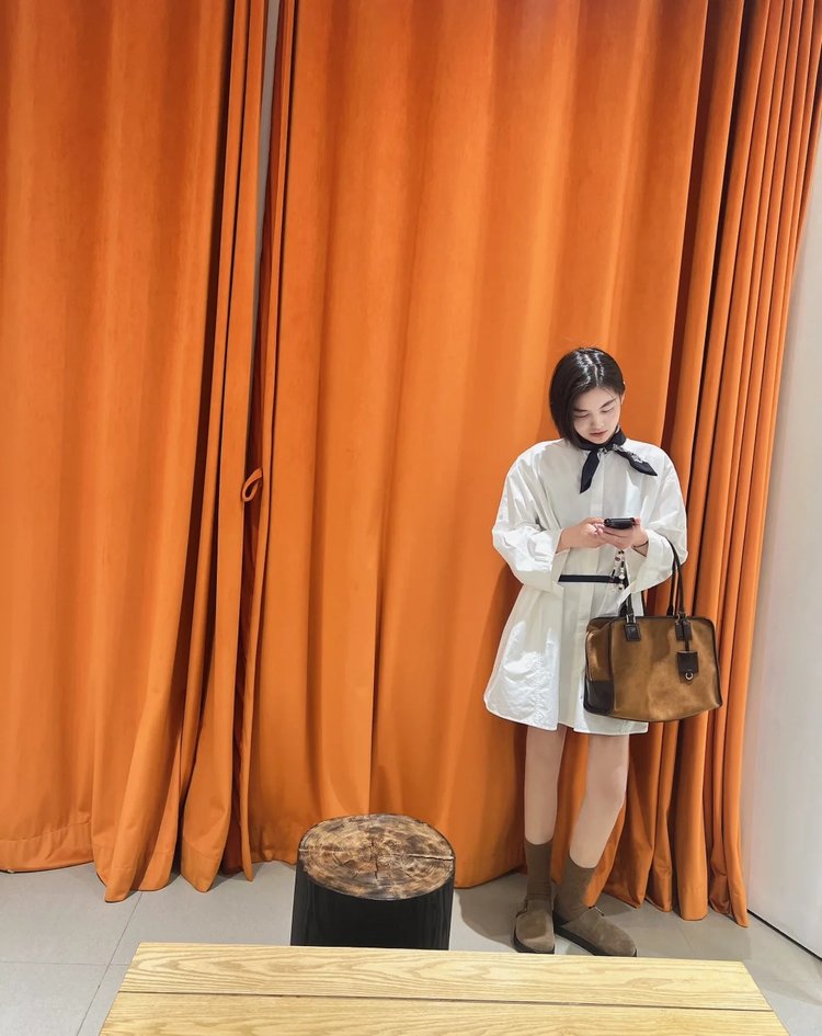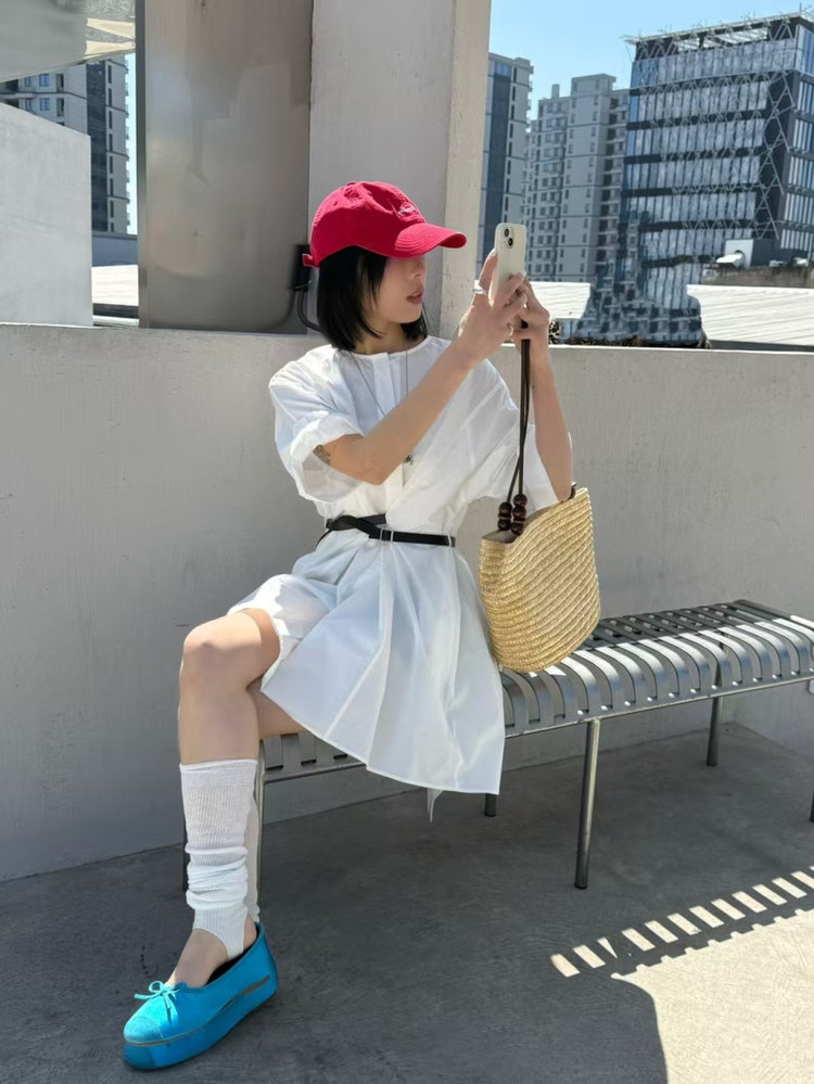 宽松的版型,搭配上黑色的腰带,巧妙地勾勒出腰线,