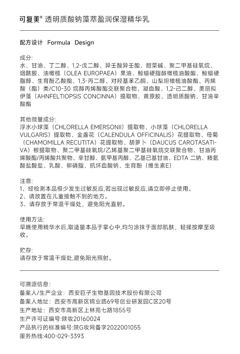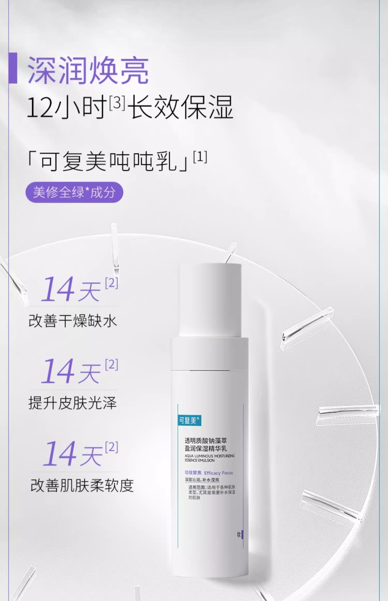 【可复美吨吨乳】可复美透明质酸钠藻萃盈润保湿精华乳80ml/瓶