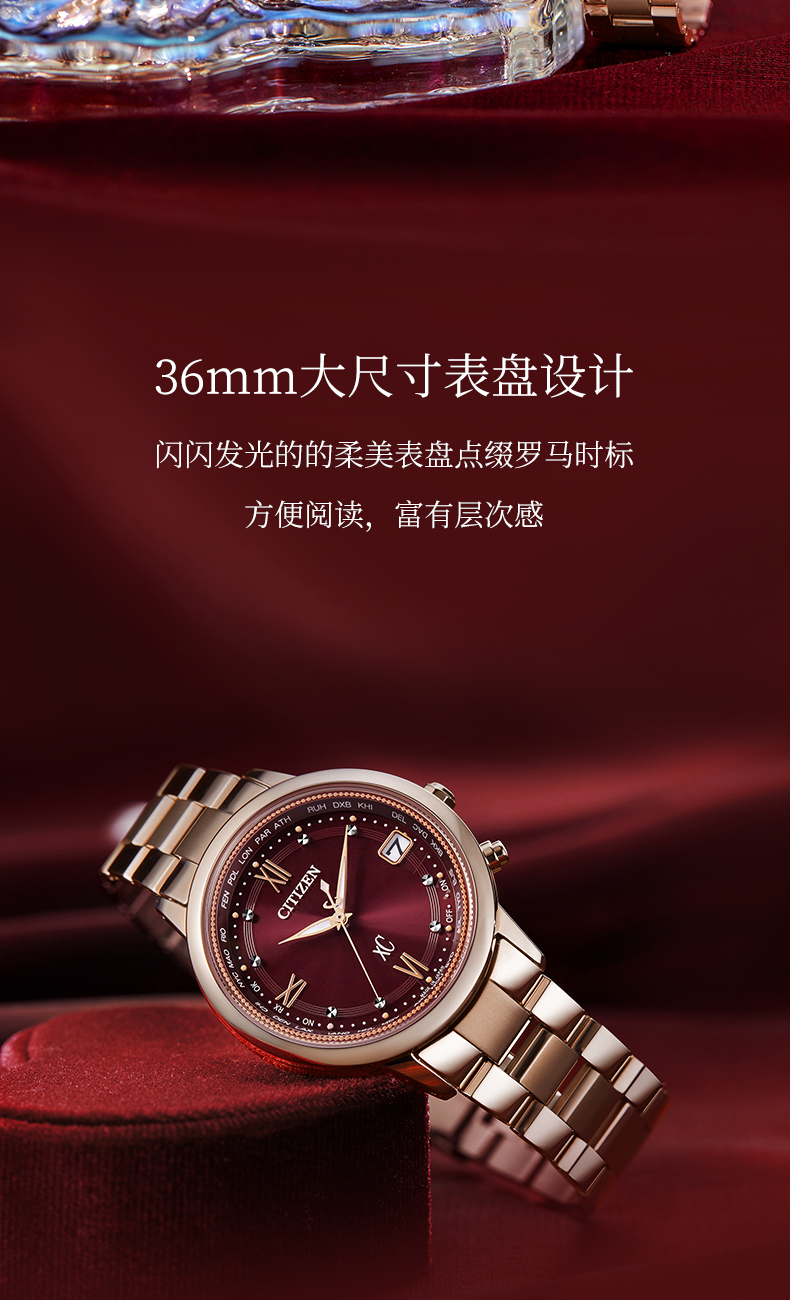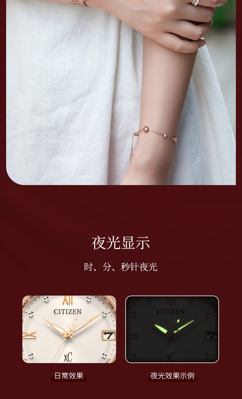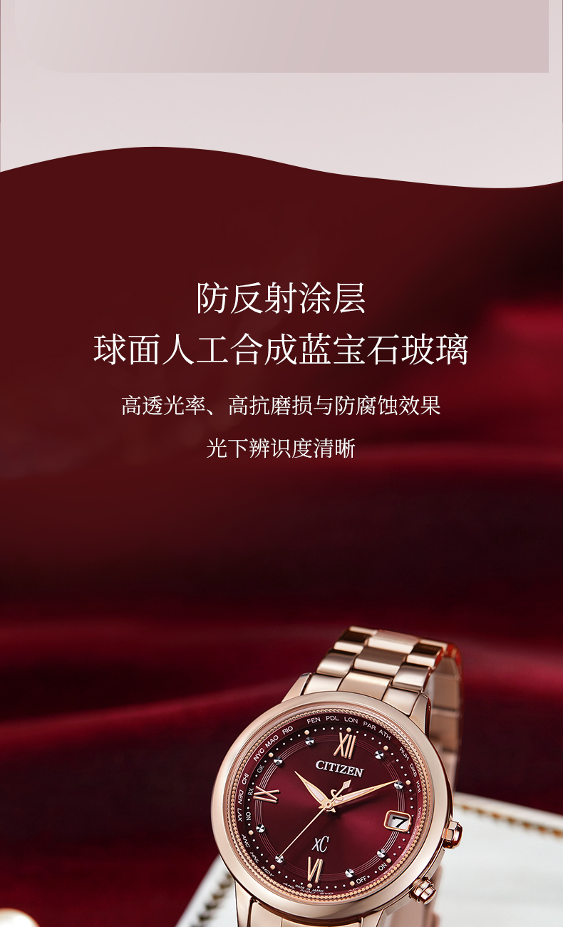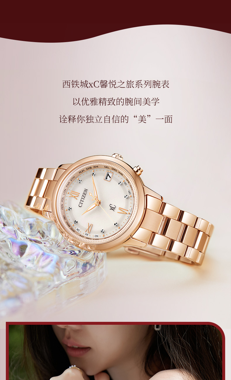 西铁城xc系列舒博钛镀金粉色光动能夜光电波女表CB1132-51W