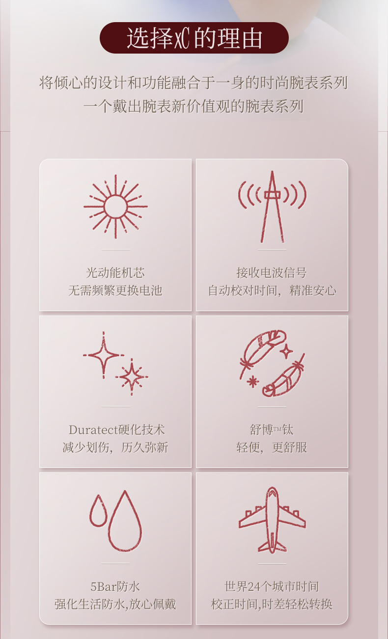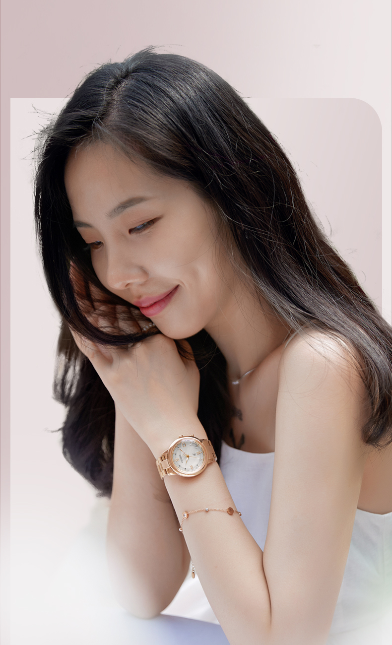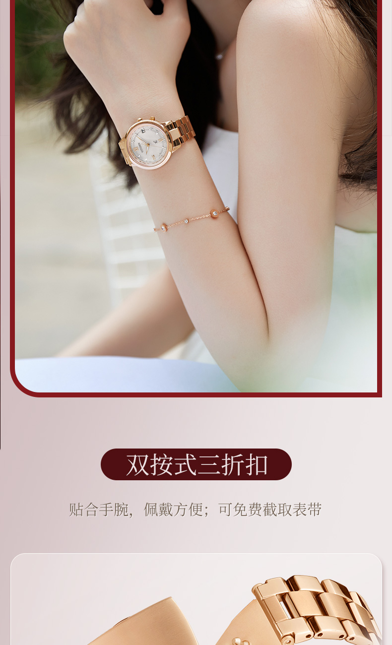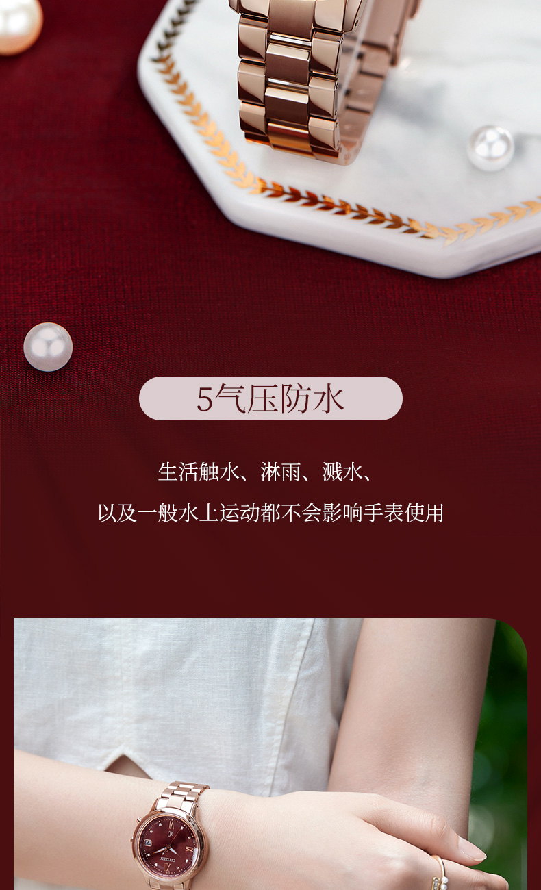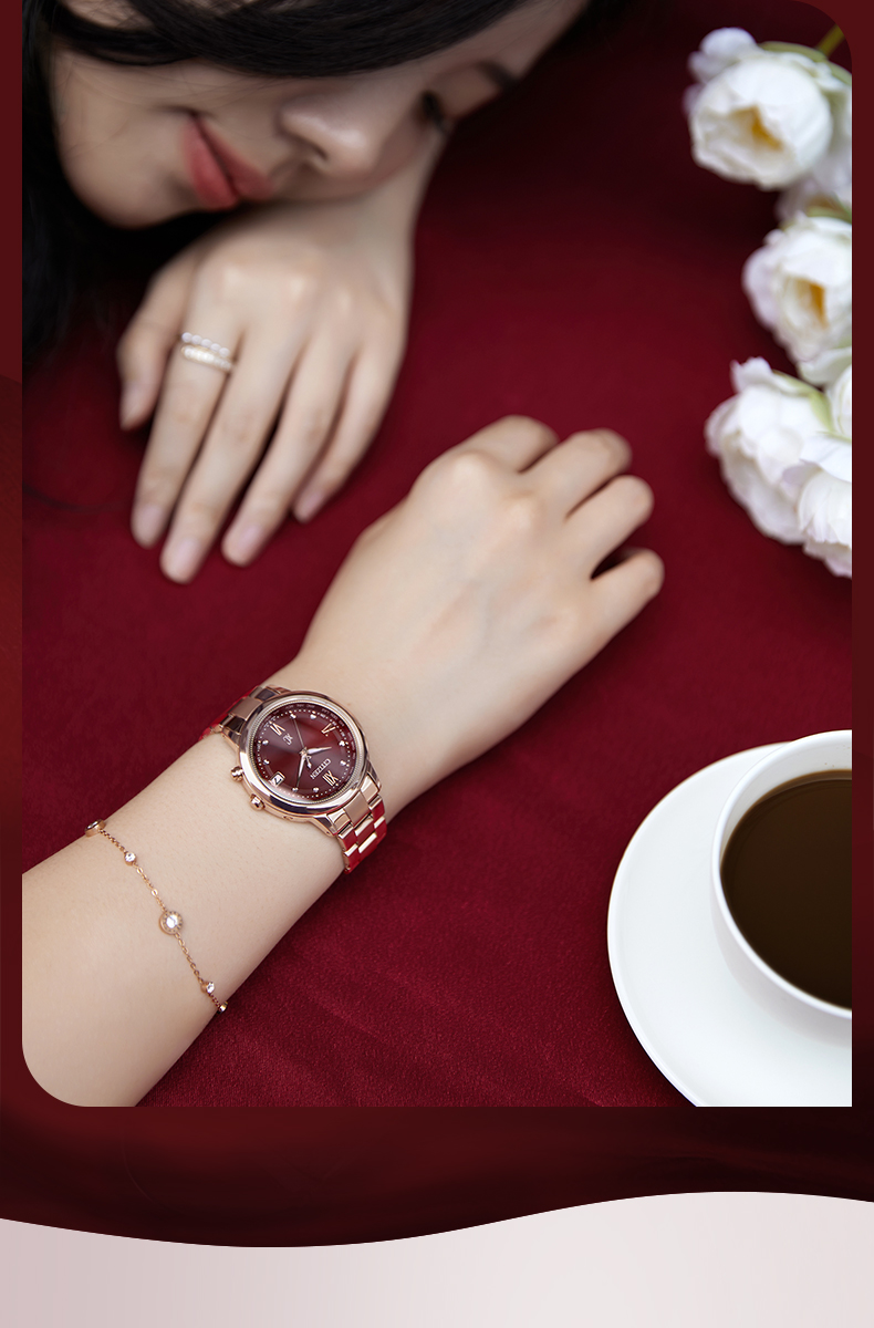 西铁城xc系列舒博钛镀金粉色光动能夜光电波女表CB1132-51W