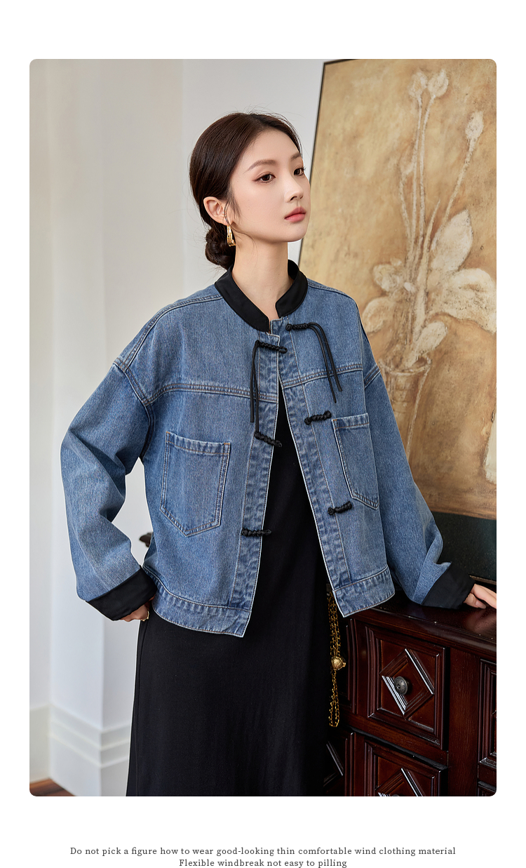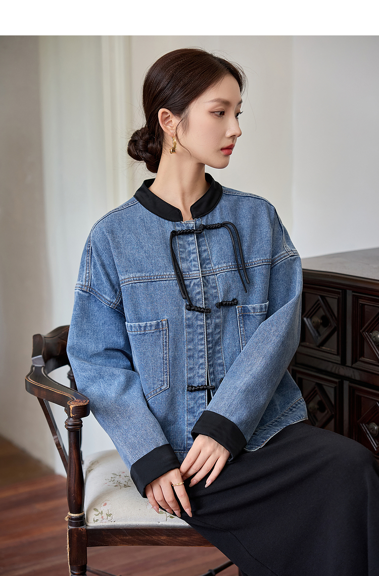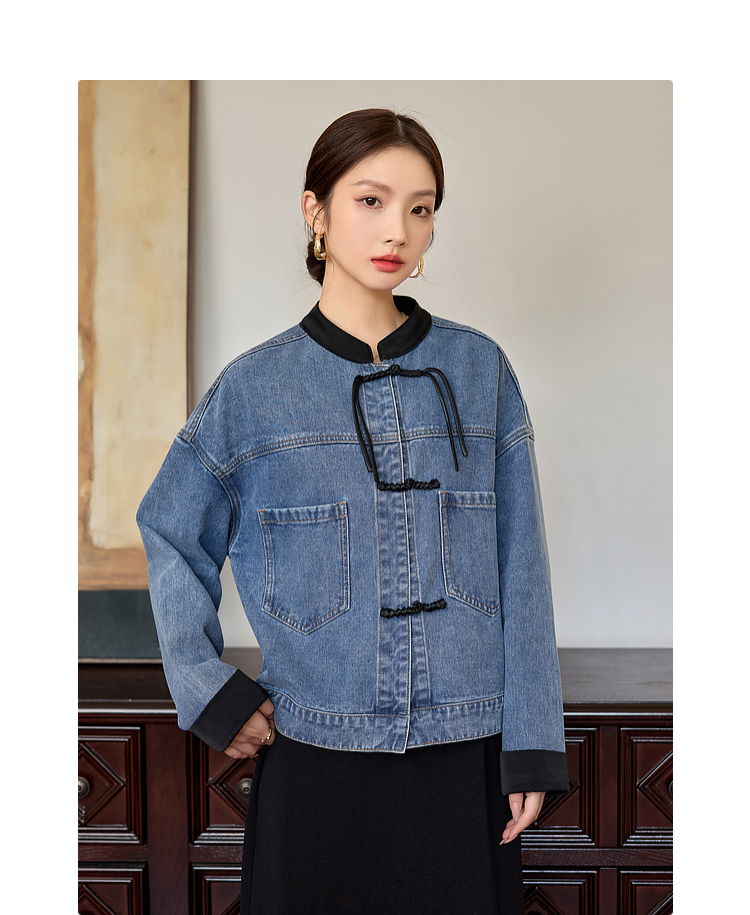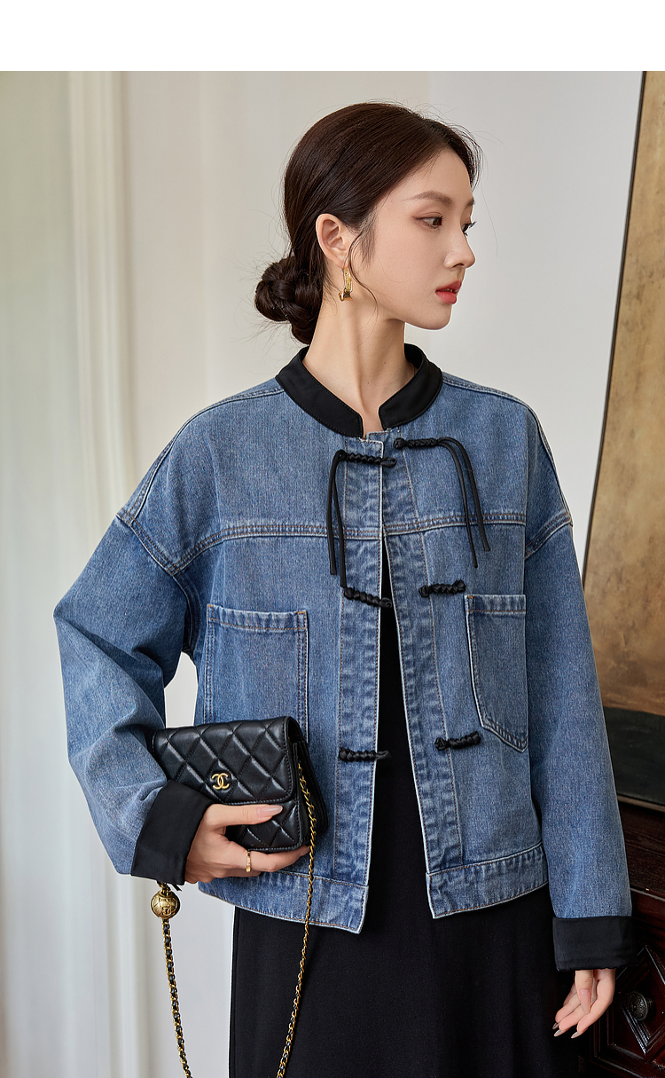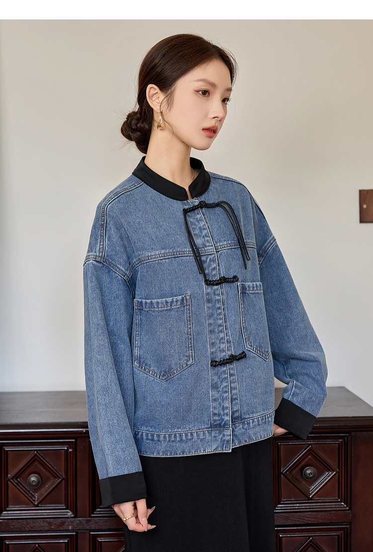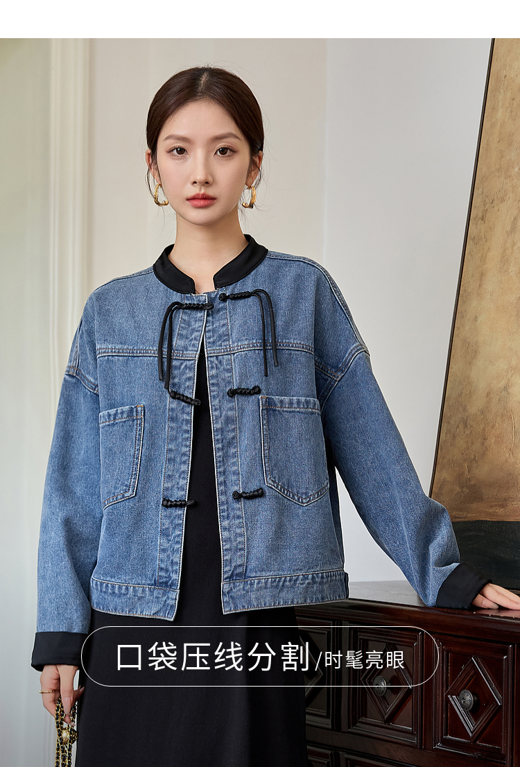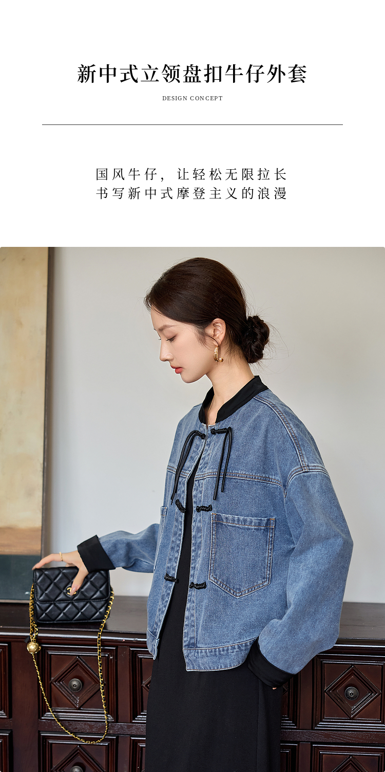 【年货节】熙世界新中式牛仔外套短款2025秋新款宽松立领盘扣国风夹克上衣