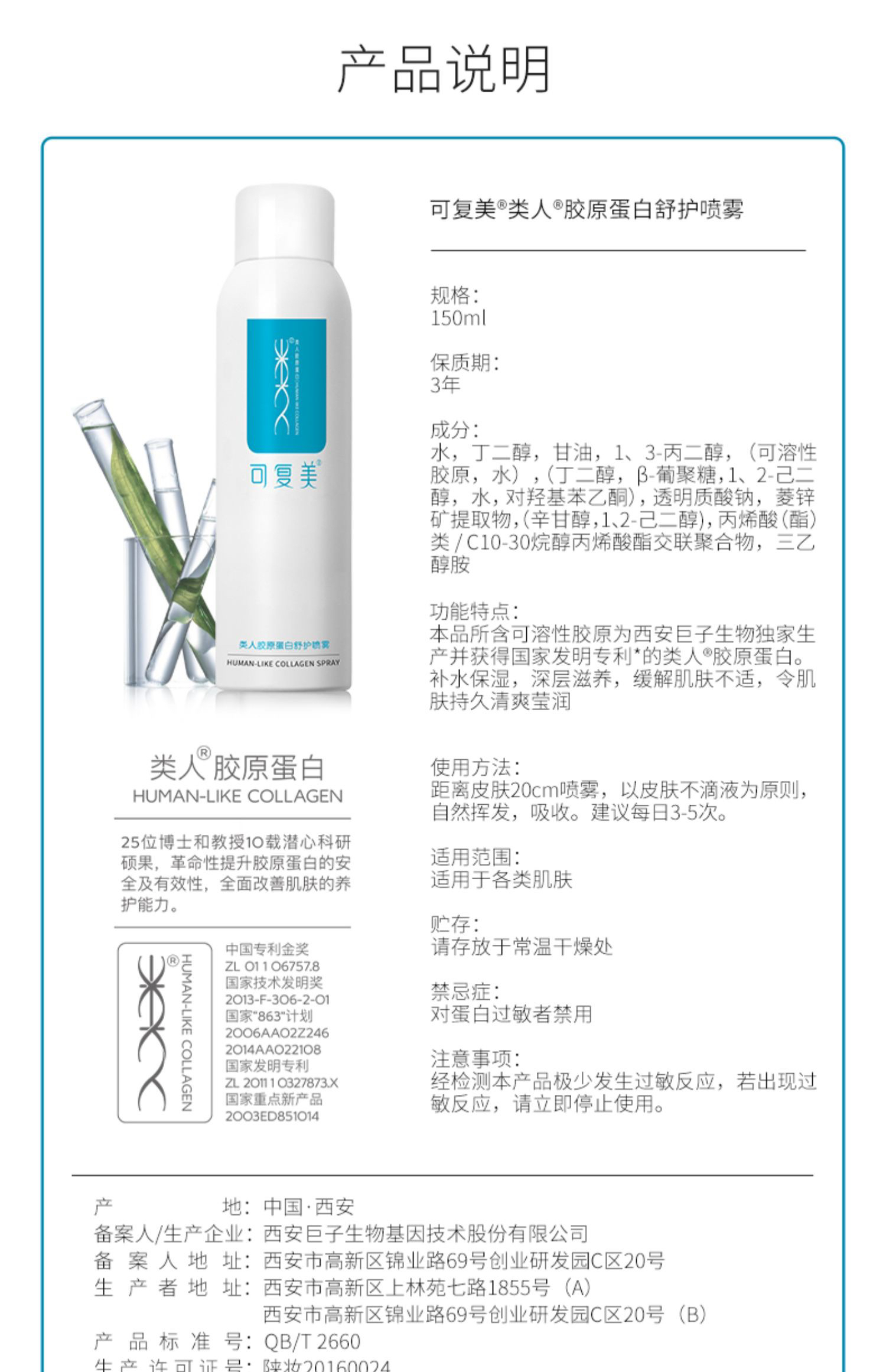 可复美类人胶原蛋白深层补水保湿喷雾敏皮爽肤水舒缓滋润100ml