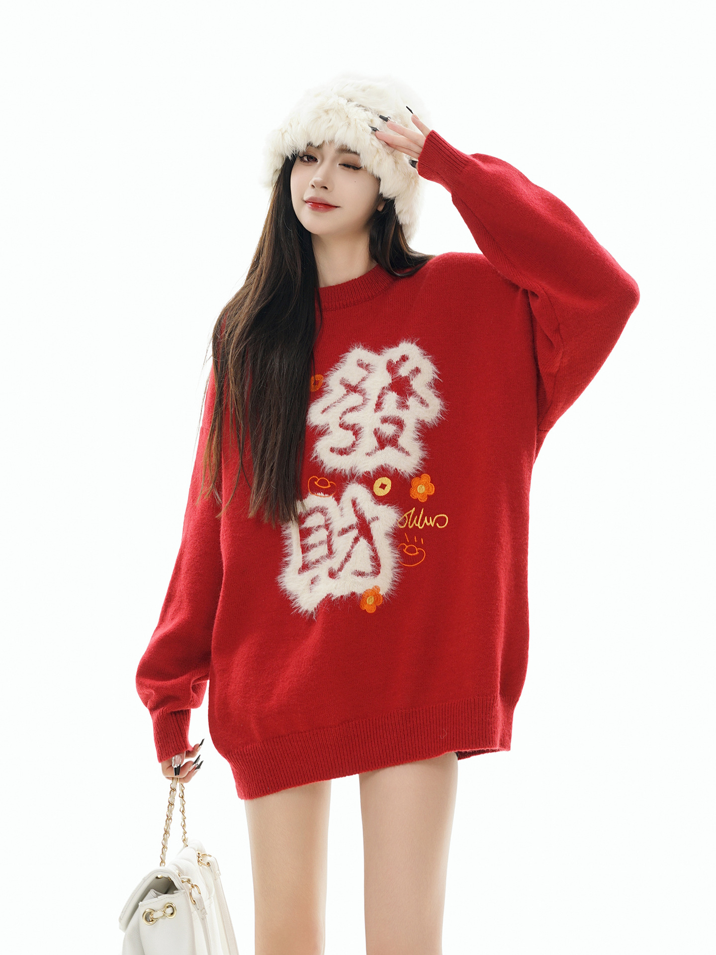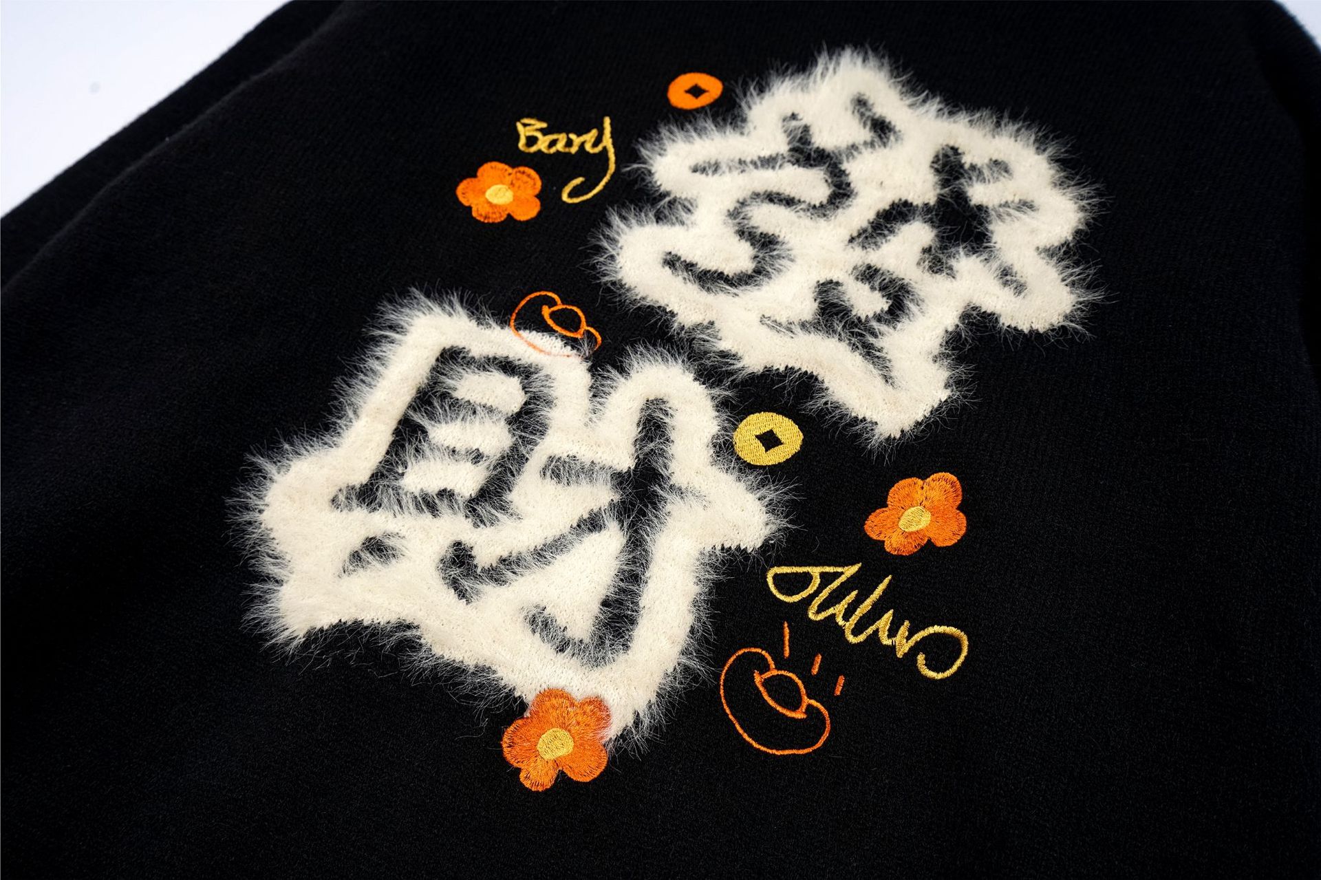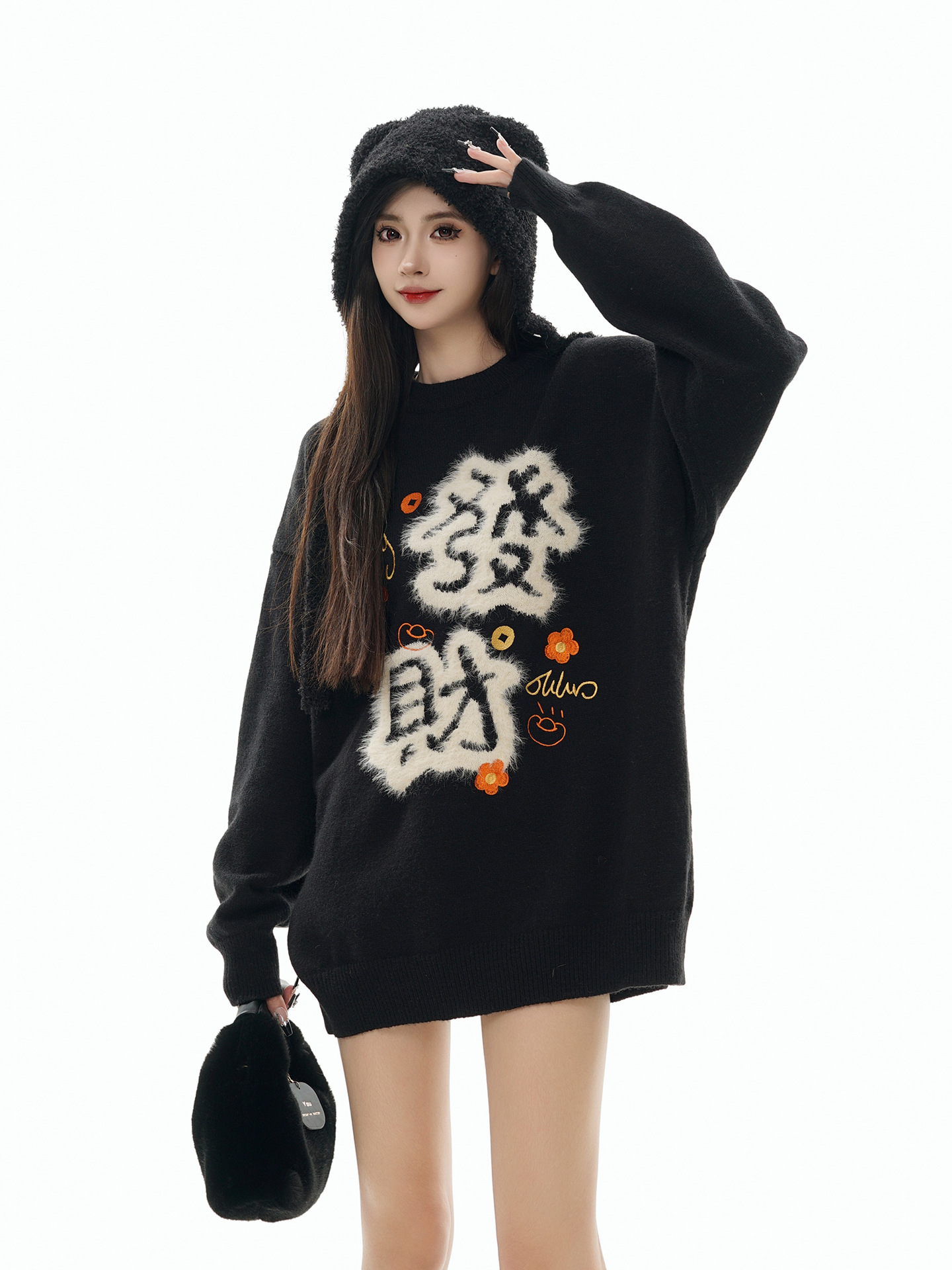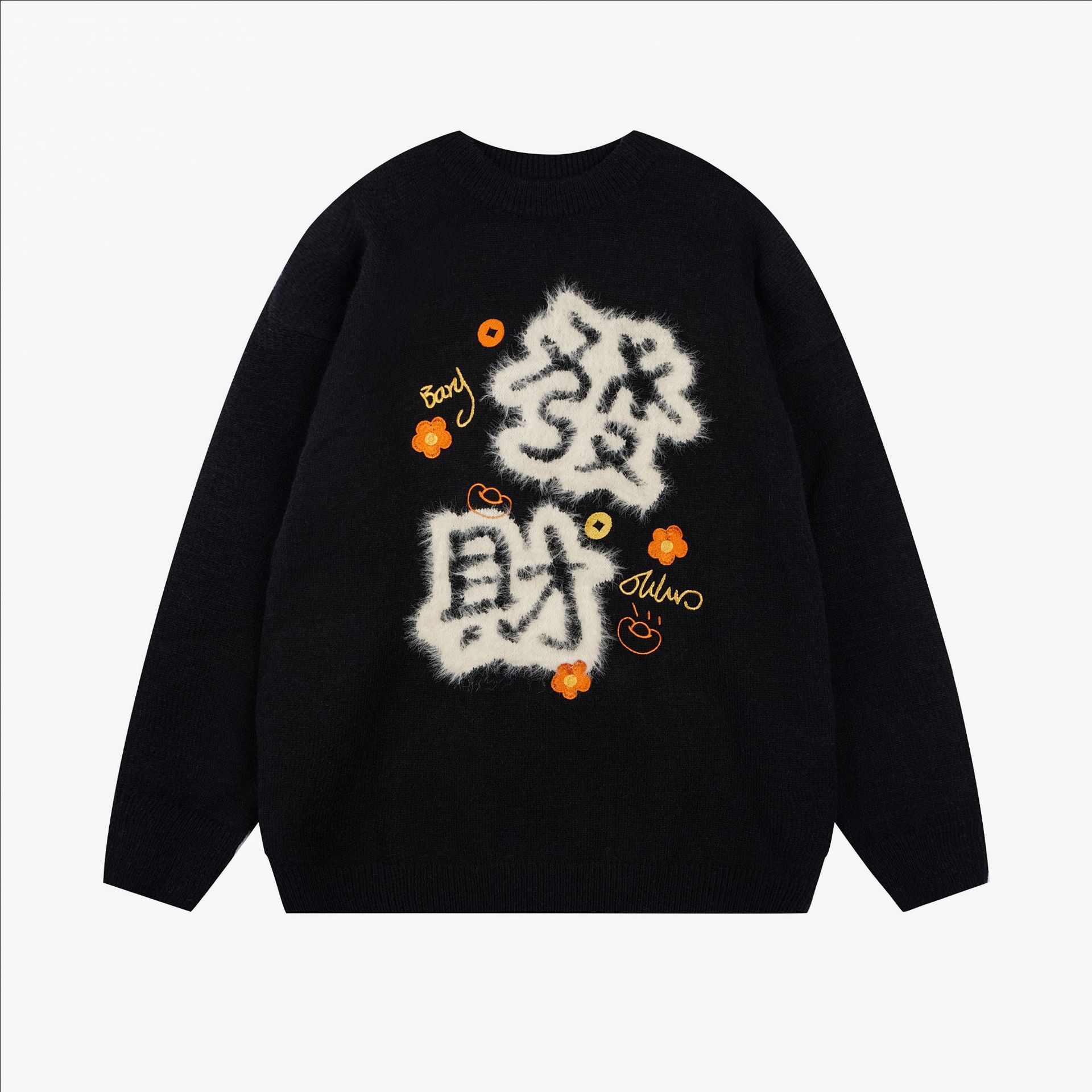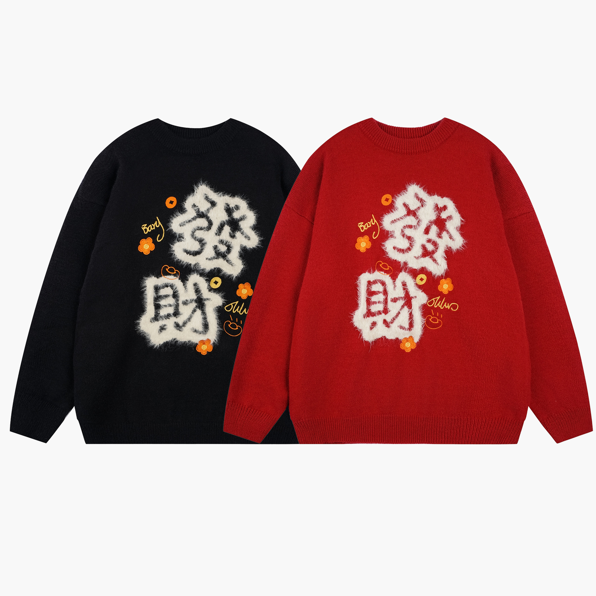 【服饰专场】秋冬新款实拍宽松美式国潮发财提花圆领针织毛衣 商品图0