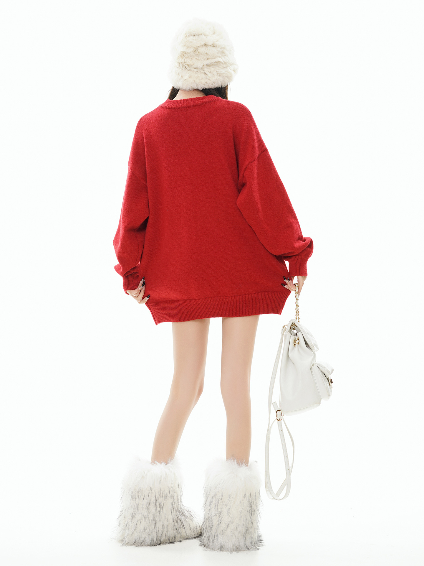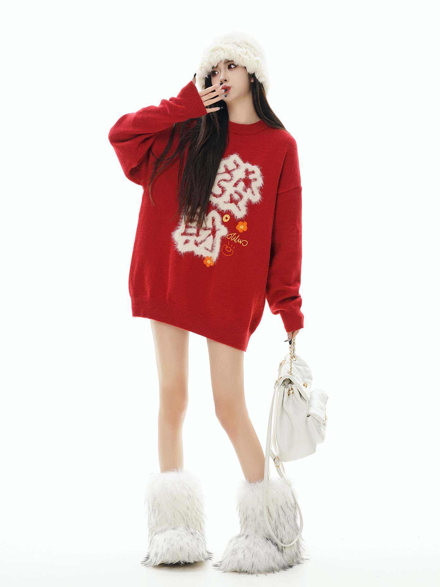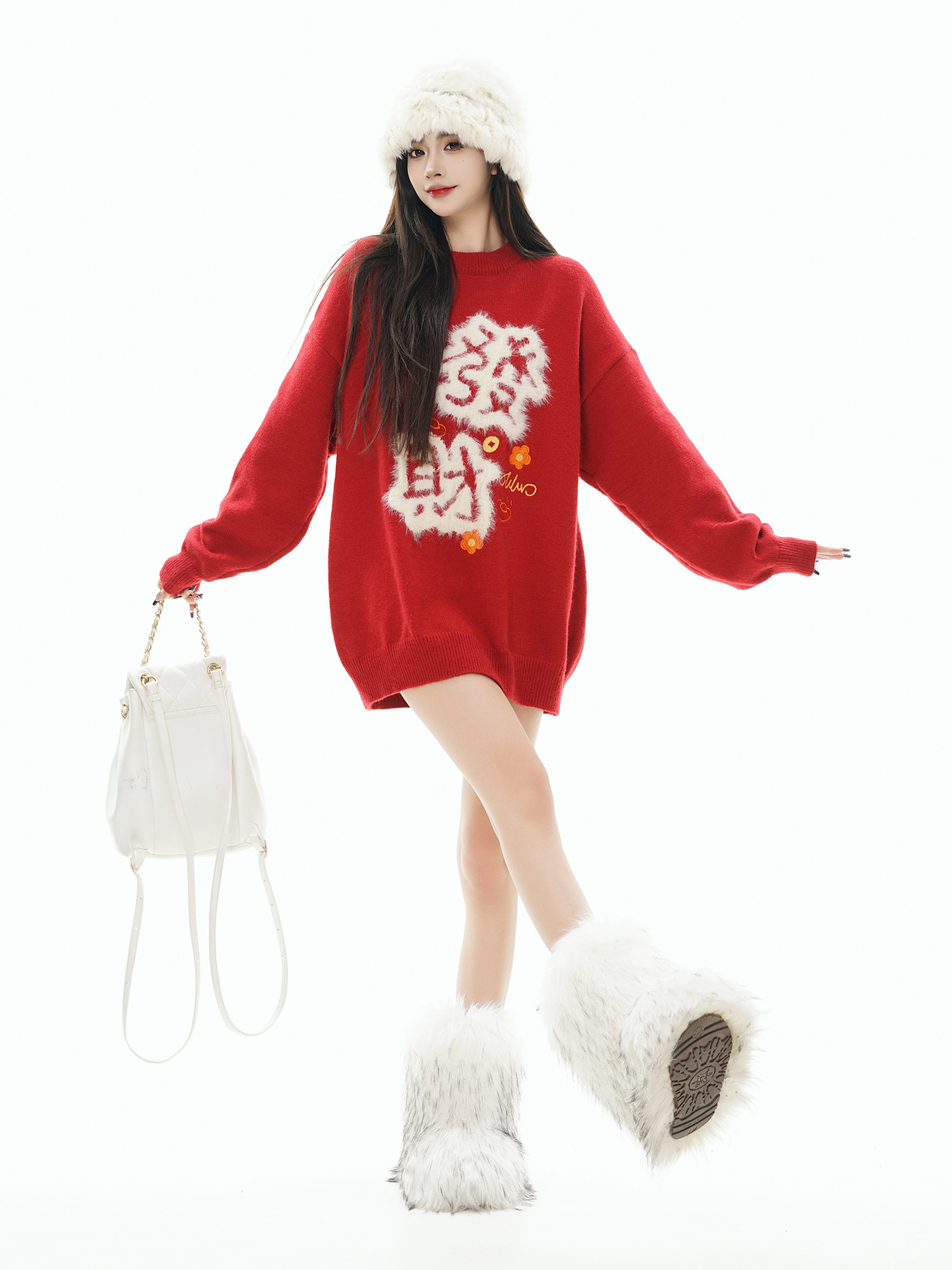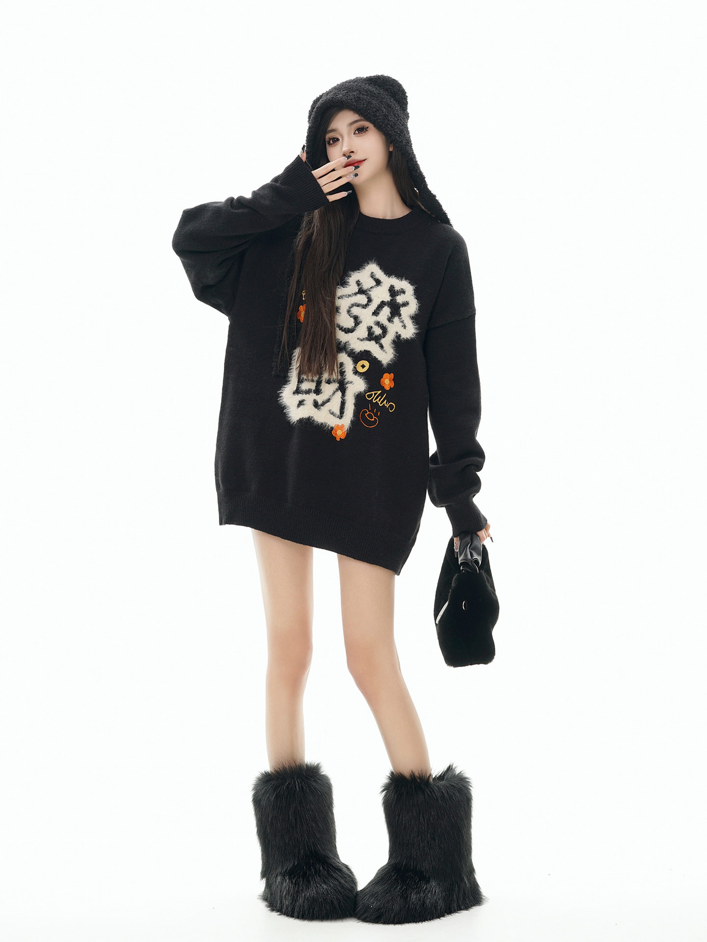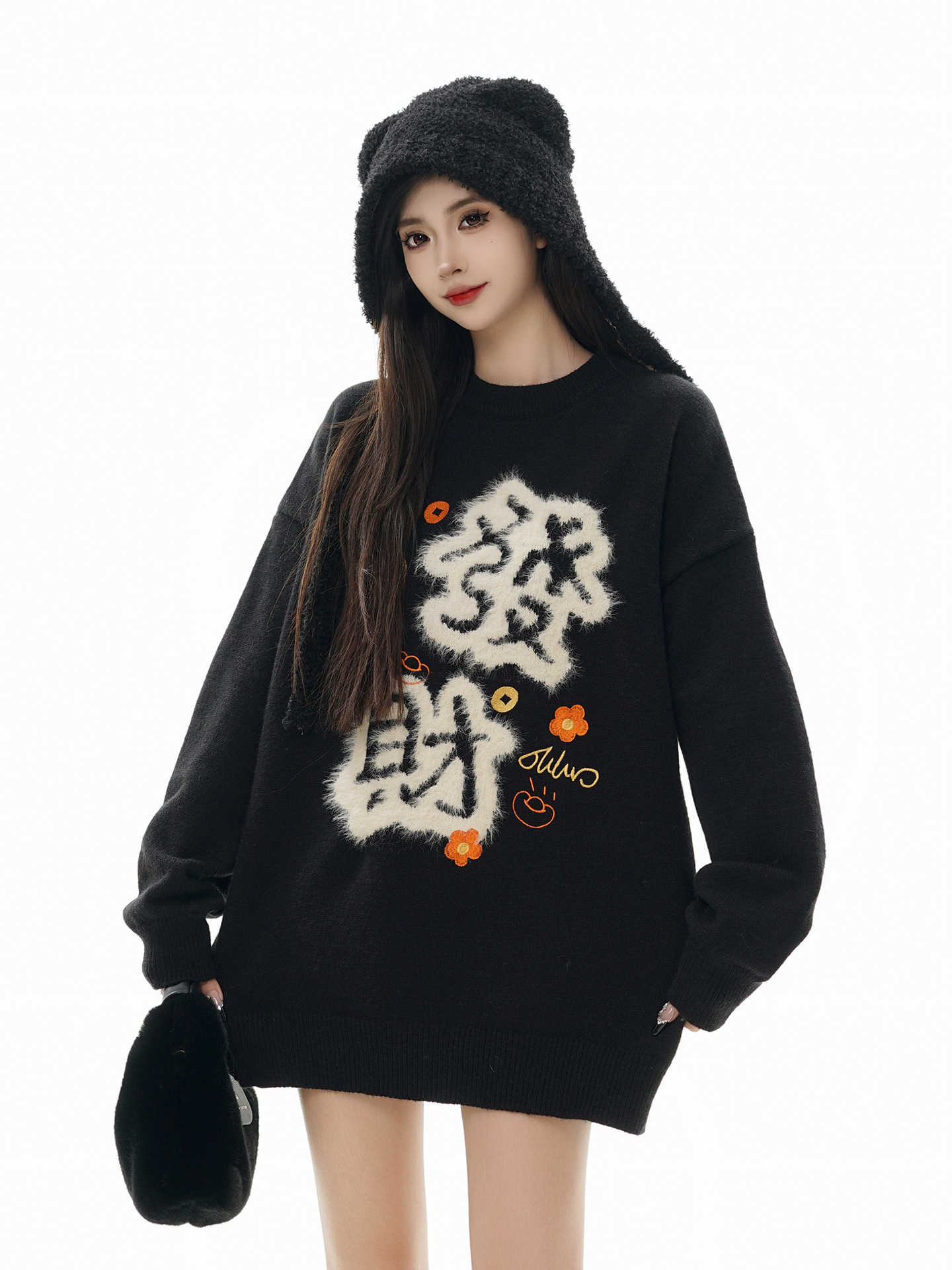 【服饰专场】秋冬新款实拍宽松美式国潮发财提花圆领针织毛衣 商品图0