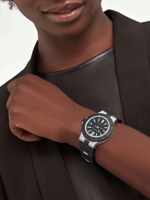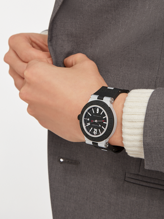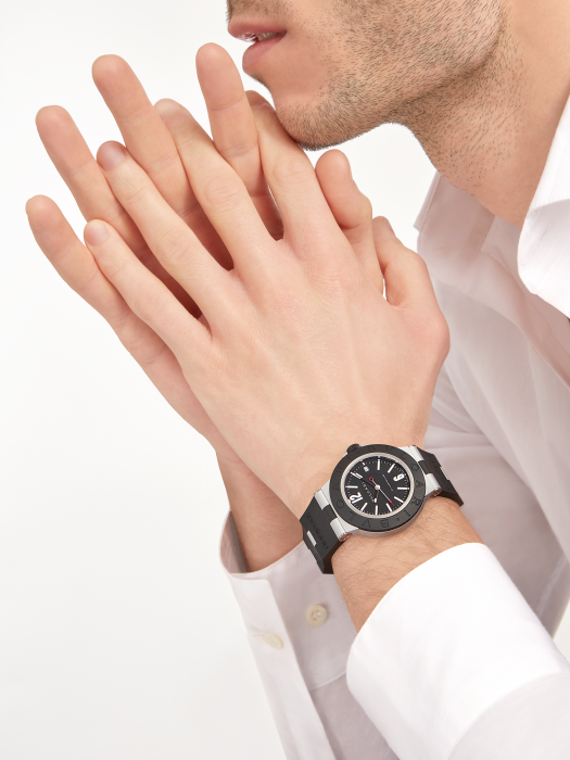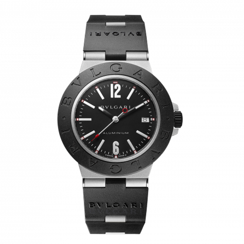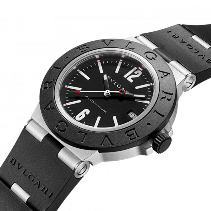 镜面 材质 | 蓝宝石水晶玻璃 | 表盘 | 铝质和钛金属表壳 铝质和钛金属表壳,黑色橡胶表圈镌刻“BVLGARI BVLGARI”字样,黑色表盘,日期视窗 DLC涂层钛金属表背 |