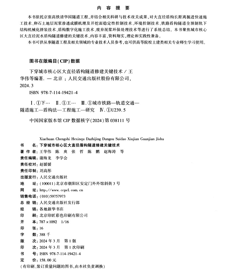 书名:下穿城市核心区大直径盾构隧道修建关键技术