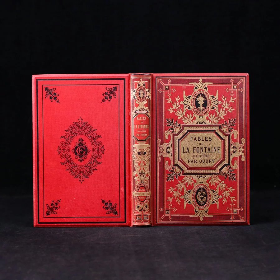 【法语】法式装帧 约19世纪末 拉封丹寓言 65幅精美版画插图 漆布精装16开