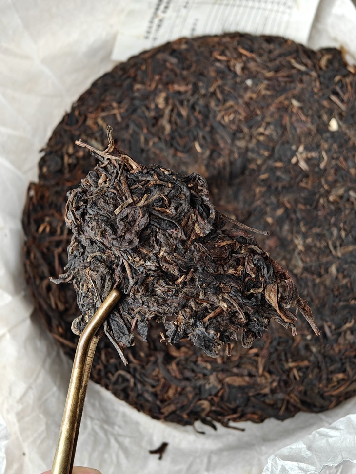 无仓味,撬开后有淡雅花香,饼面棕黑油亮,条索分明,内飞已经出现茶油