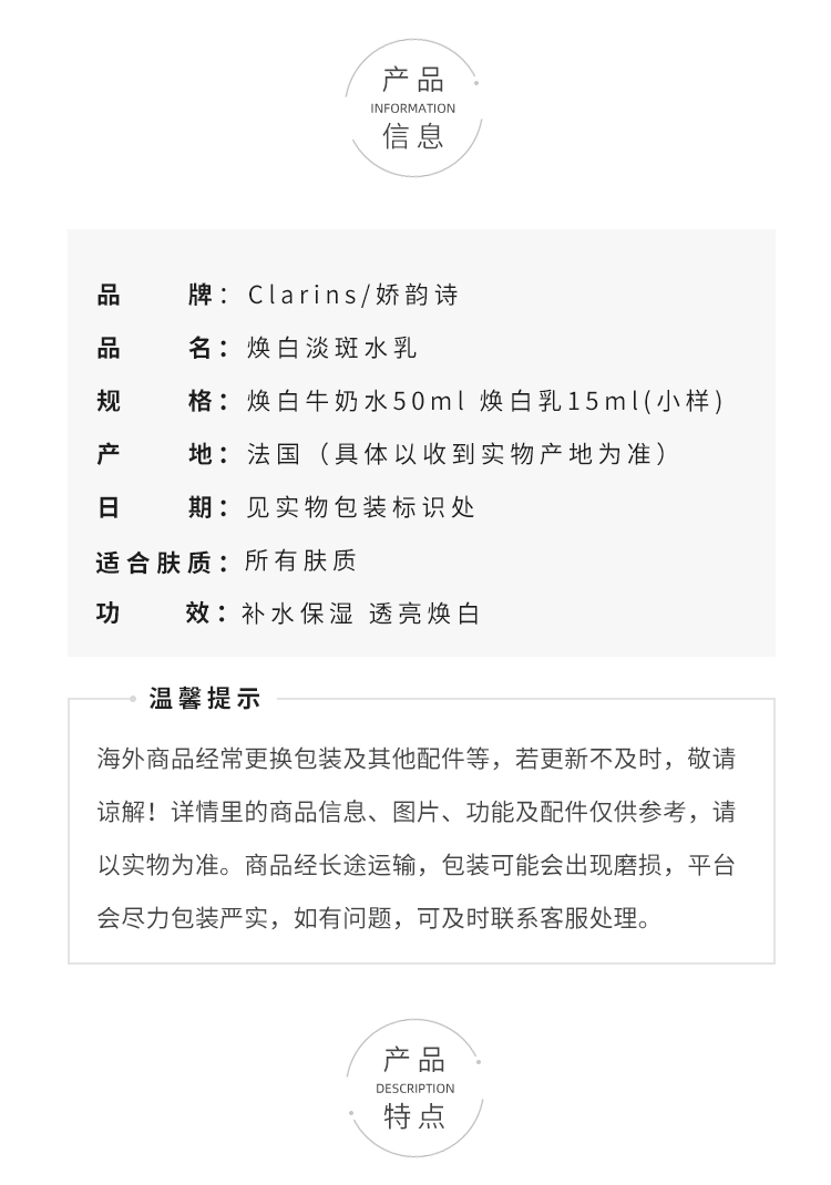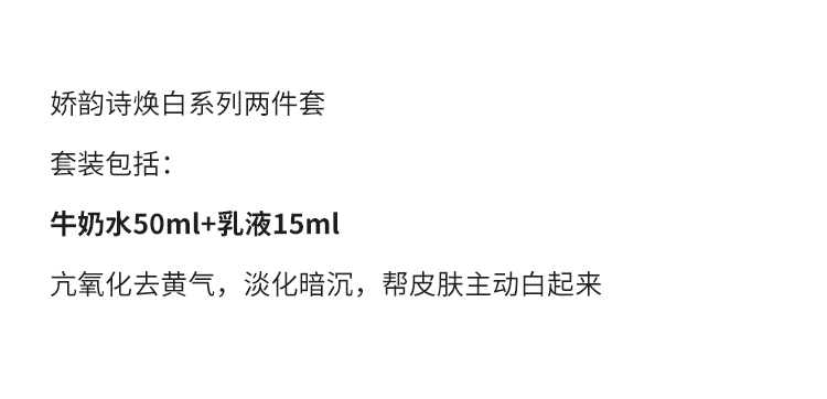 娇韵诗透亮焕白牛奶水乳两件套中小样 美白淡斑提亮肤色去黄保湿 水50ml+乳15ml中样