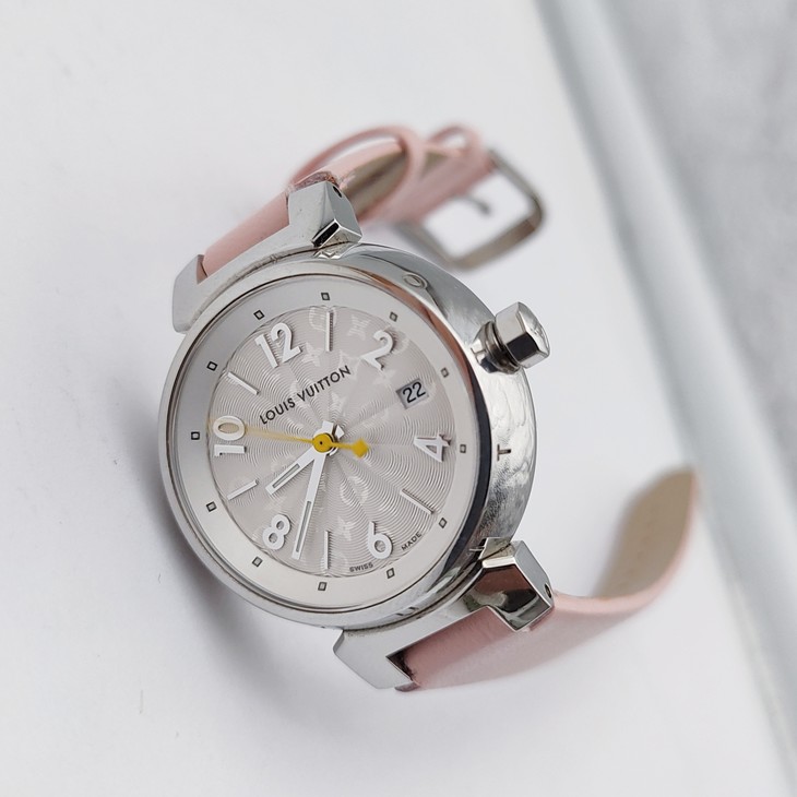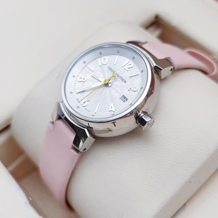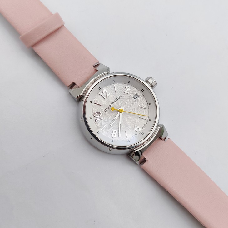 路易·威登TAMBOUR系列Q121K女款石英表,28mm表径,白色表盘皮带,日期显示,9成新单表,专柜价2万多,现好价